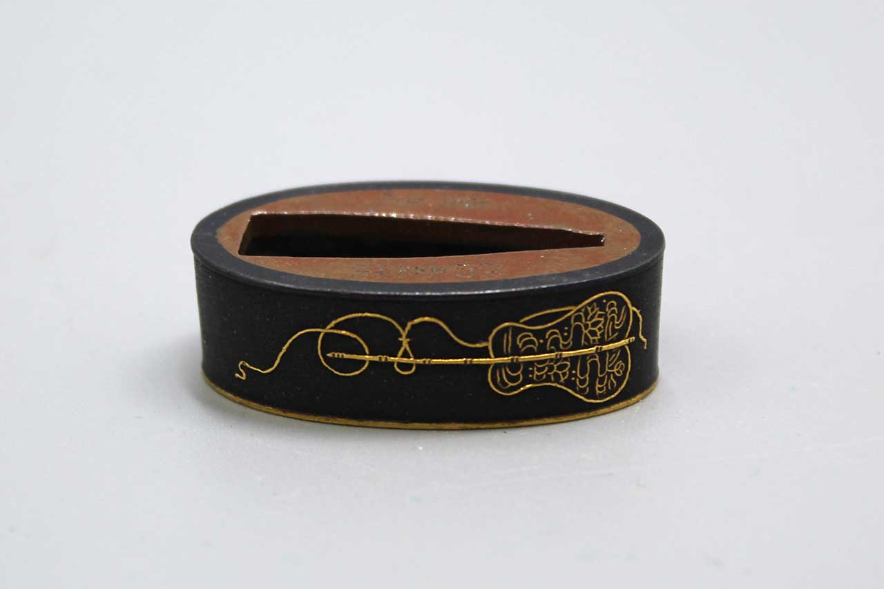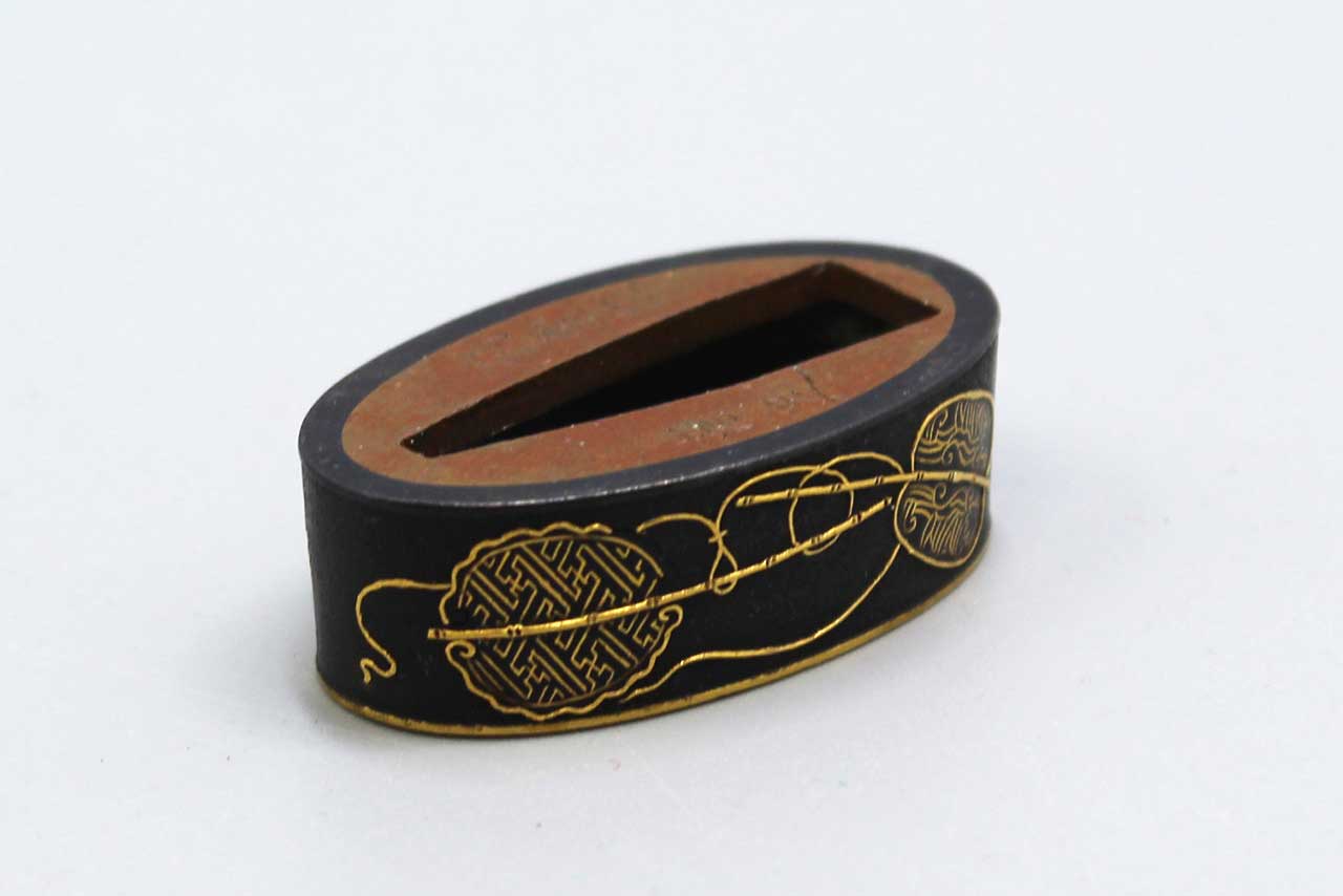 Japanese Sword Fuchi (sword handle collar). Single fuchi with gold highlights (appears to be the design of war fans). Signed Fuchi. Length approximately 1 7/16 inches. Most likely Edo era. Worn condition.
