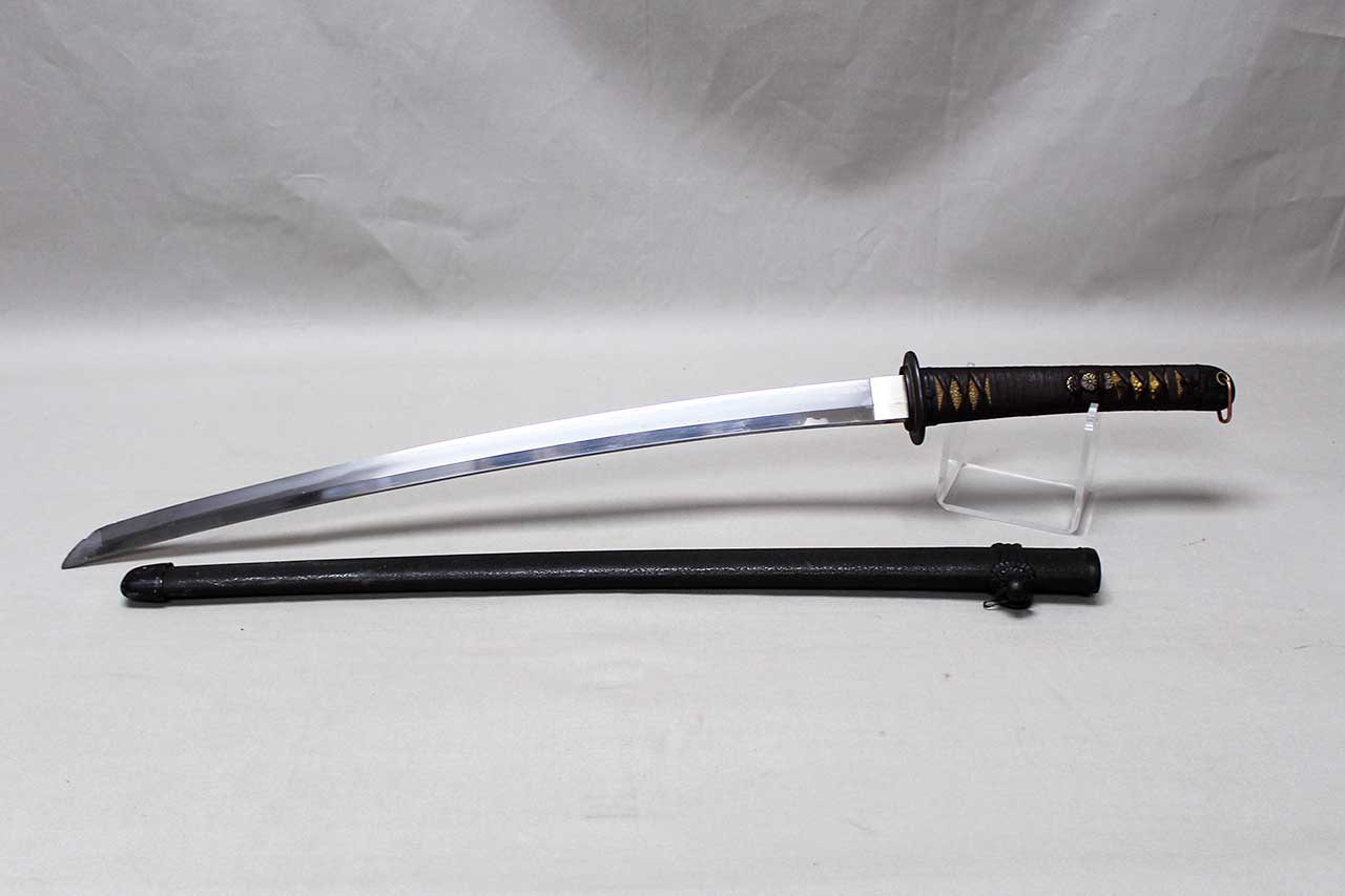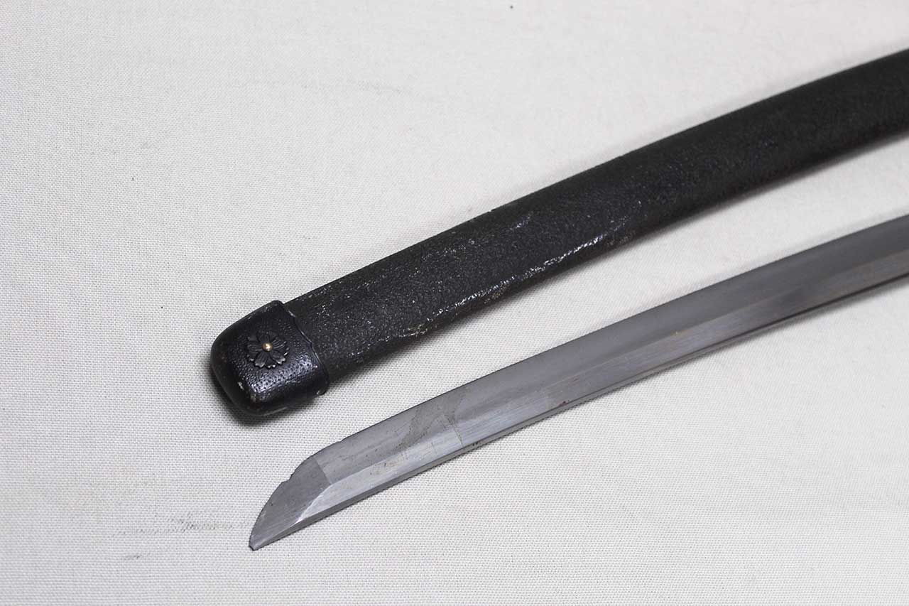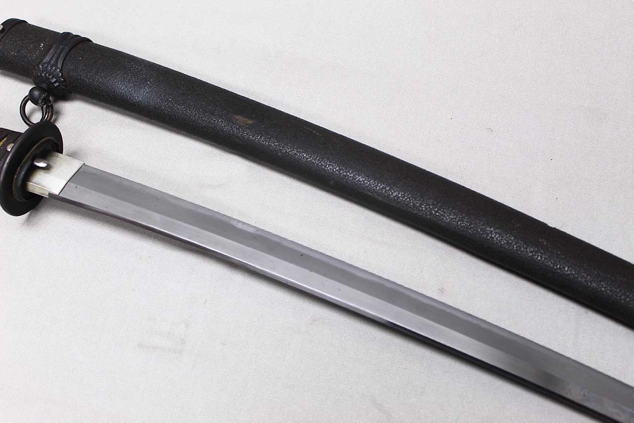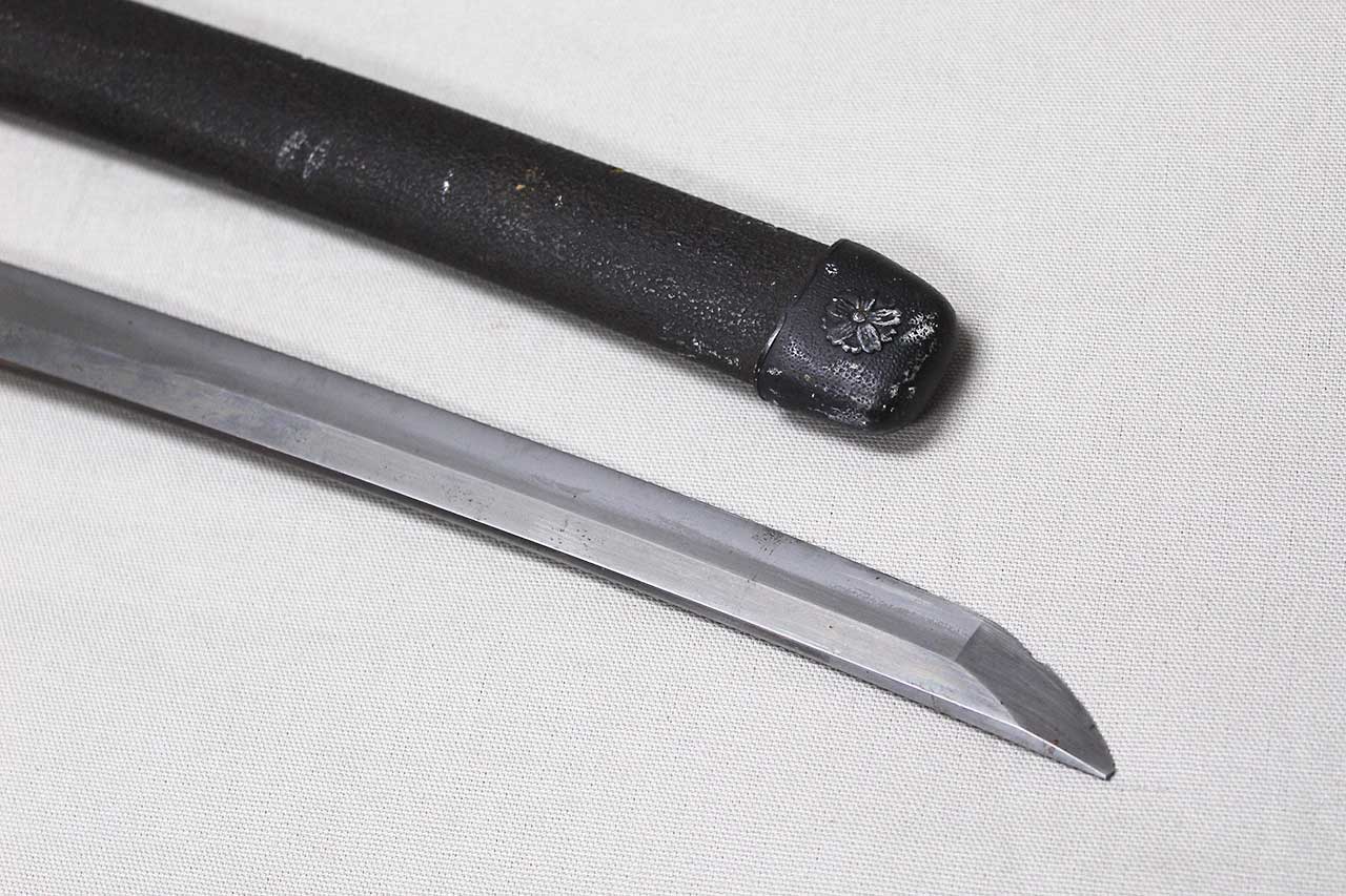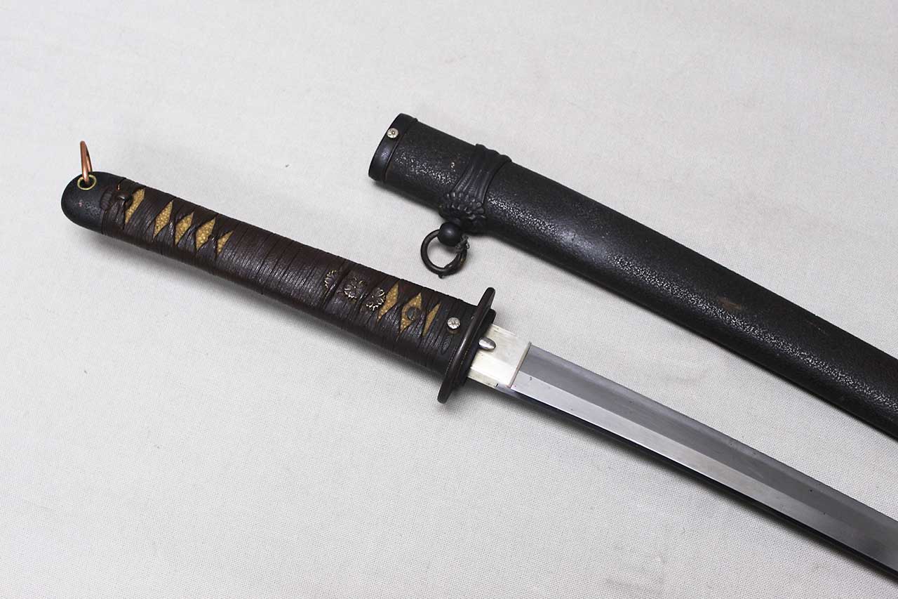 WW2 Imperial Japanese Army (IJA) 1944 Late War Officer Sword (Shin-gunto). Blade is damaged condition (fatal flaw) with broken tip and big chips near blade tip and has a straight basic harmon (temper line). Two-hole nakago (tang) is signed on both sides of tang. The blade habaki (blade collar) is single piece basic copper type with thin finish/plating on top. The sword has the late war basic iron tsuba (hand guard). The military-style hilt (tsuka) is the typical officer type, it is constructed of a wood base with the traditional 3 cherry blossoms menuki, with handle dark brown lacquered wrap. The double locking buttons still works decently. Only has one grip screw left, other screw is missing and has wooden peg instead. The wooden core scabbard (saya) is in decent condition (slight crack starting near scabbard throat) and has a nice rough textured paint, bottom metal fitting on scabbard appears to be slighly loose. Good condition blacken iron fittings. The blade is approximately 25 1/2 inches in length counting the habaki. Overall, signed M-1944 late WW2 Army officer sword, decent fittings, however, damaged blade with broken tip and large chip.