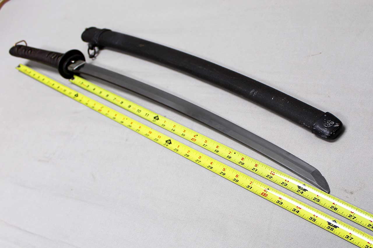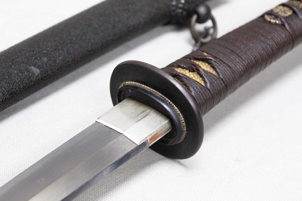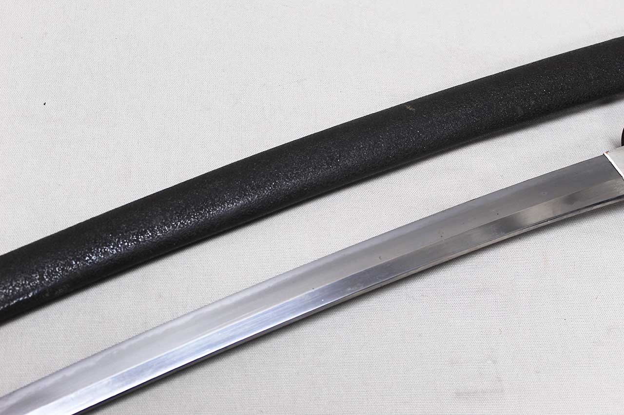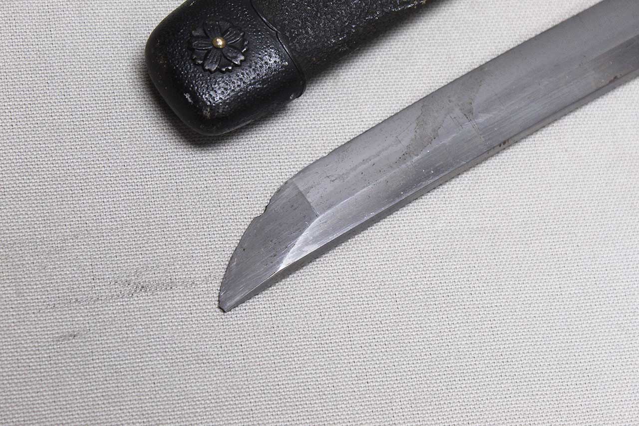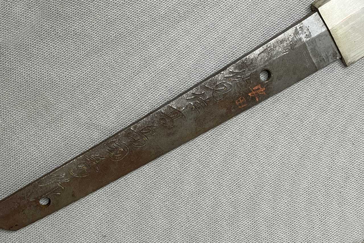 WW2 Imperial Japanese Army (IJA) 1944 Late War Officer Sword (Shin-gunto). Blade is damaged condition (fatal flaw) with broken tip and big chips near blade tip and has a straight basic harmon (temper line). Two-hole nakago (tang) is signed on both sides of tang. The blade habaki (blade collar) is single piece basic copper type with thin finish/plating on top. The sword has the late war basic iron tsuba (hand guard). The military-style hilt (tsuka) is the typical officer type, it is constructed of a wood base with the traditional 3 cherry blossoms menuki, with handle dark brown lacquered wrap. The double locking buttons still works decently. Only has one grip screw left, other screw is missing and has wooden peg instead. The wooden core scabbard (saya) is in decent condition (slight crack starting near scabbard throat) and has a nice rough textured paint, bottom metal fitting on scabbard appears to be slighly loose. Good condition blacken iron fittings. The blade is approximately 25 1/2 inches in length counting the habaki. Overall, signed M-1944 late WW2 Army officer sword, decent fittings, however, damaged blade with broken tip and large chip.