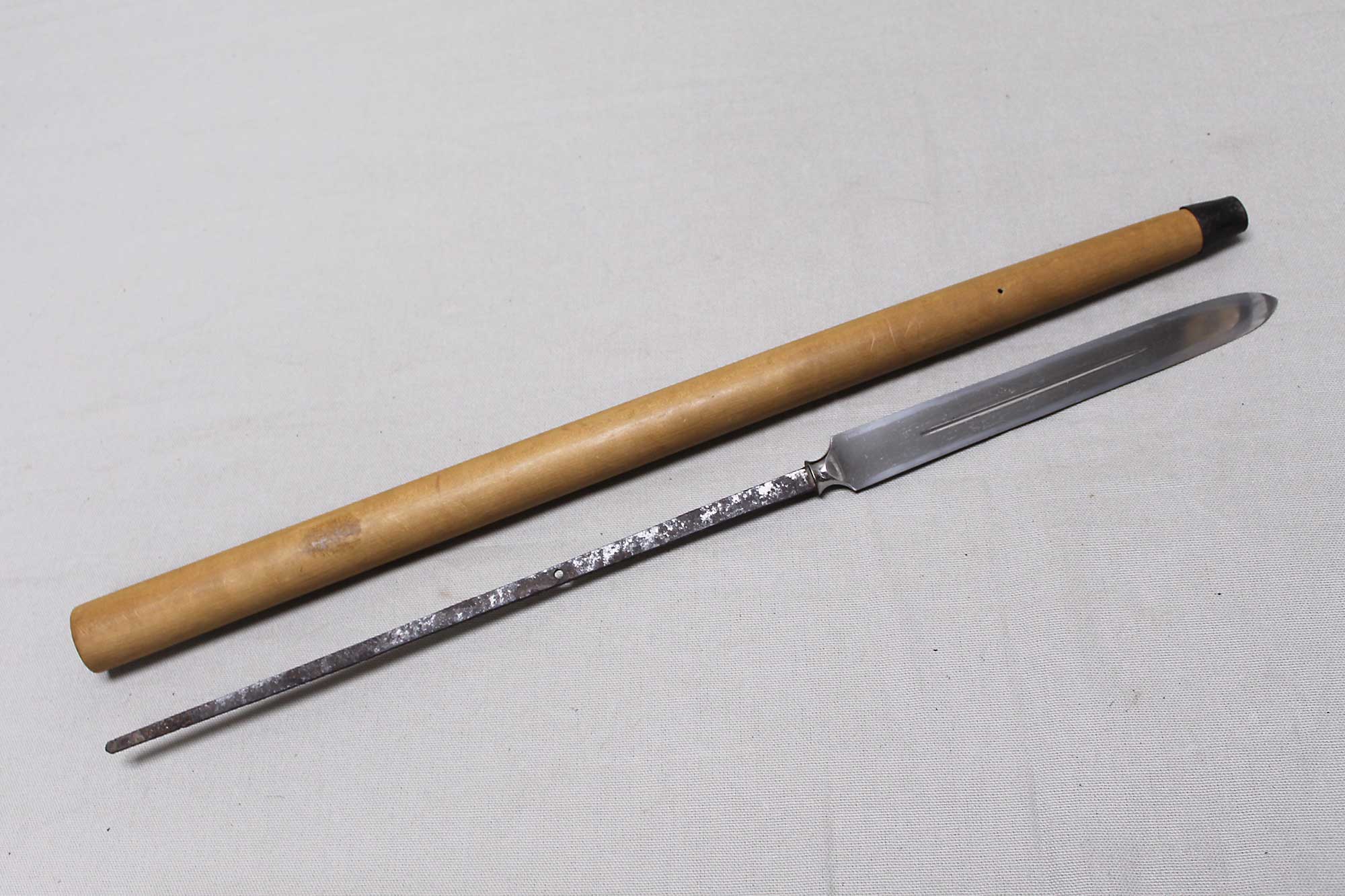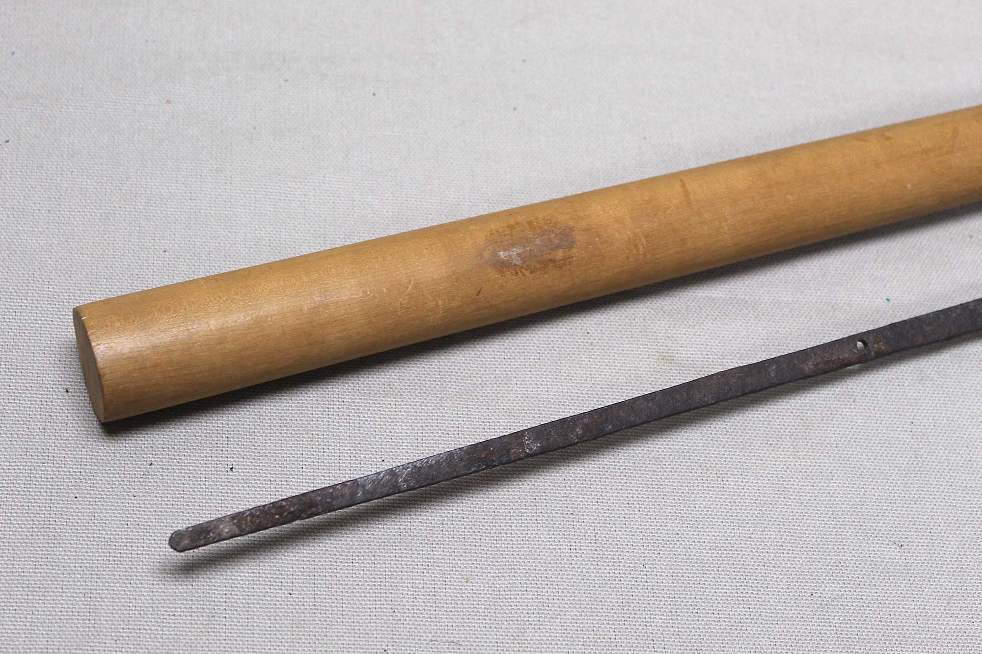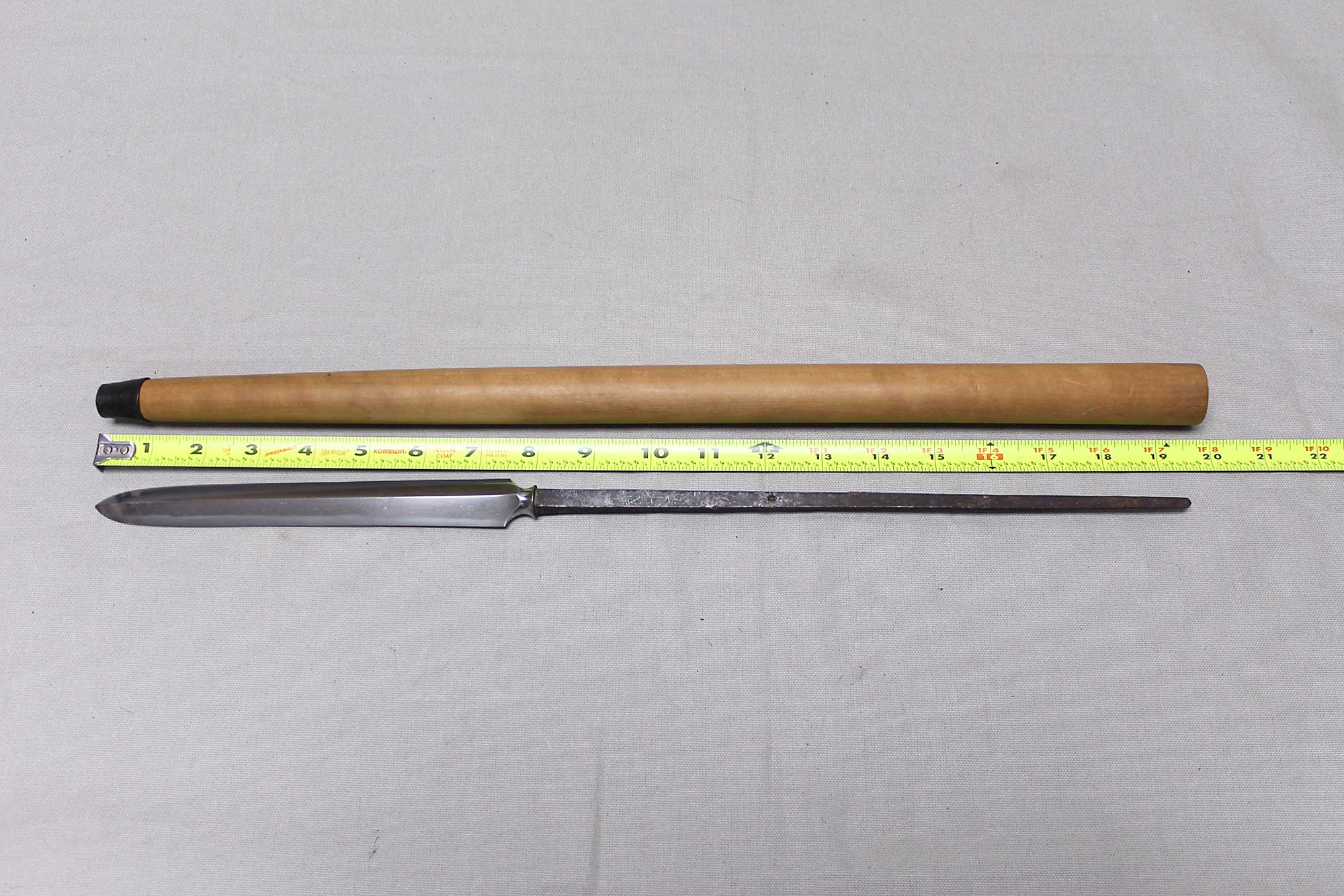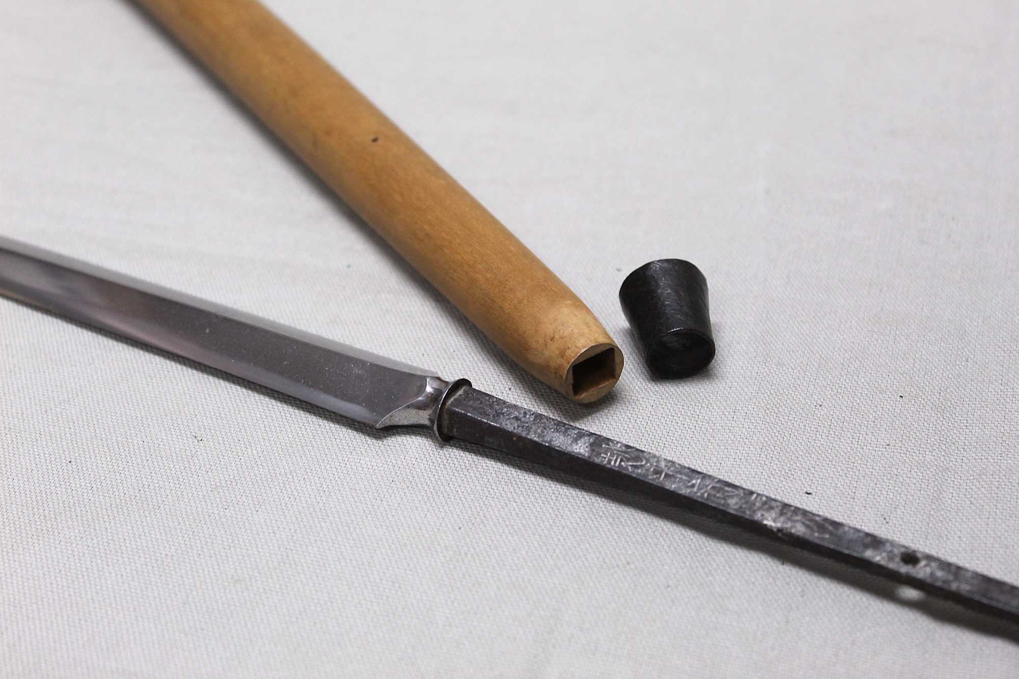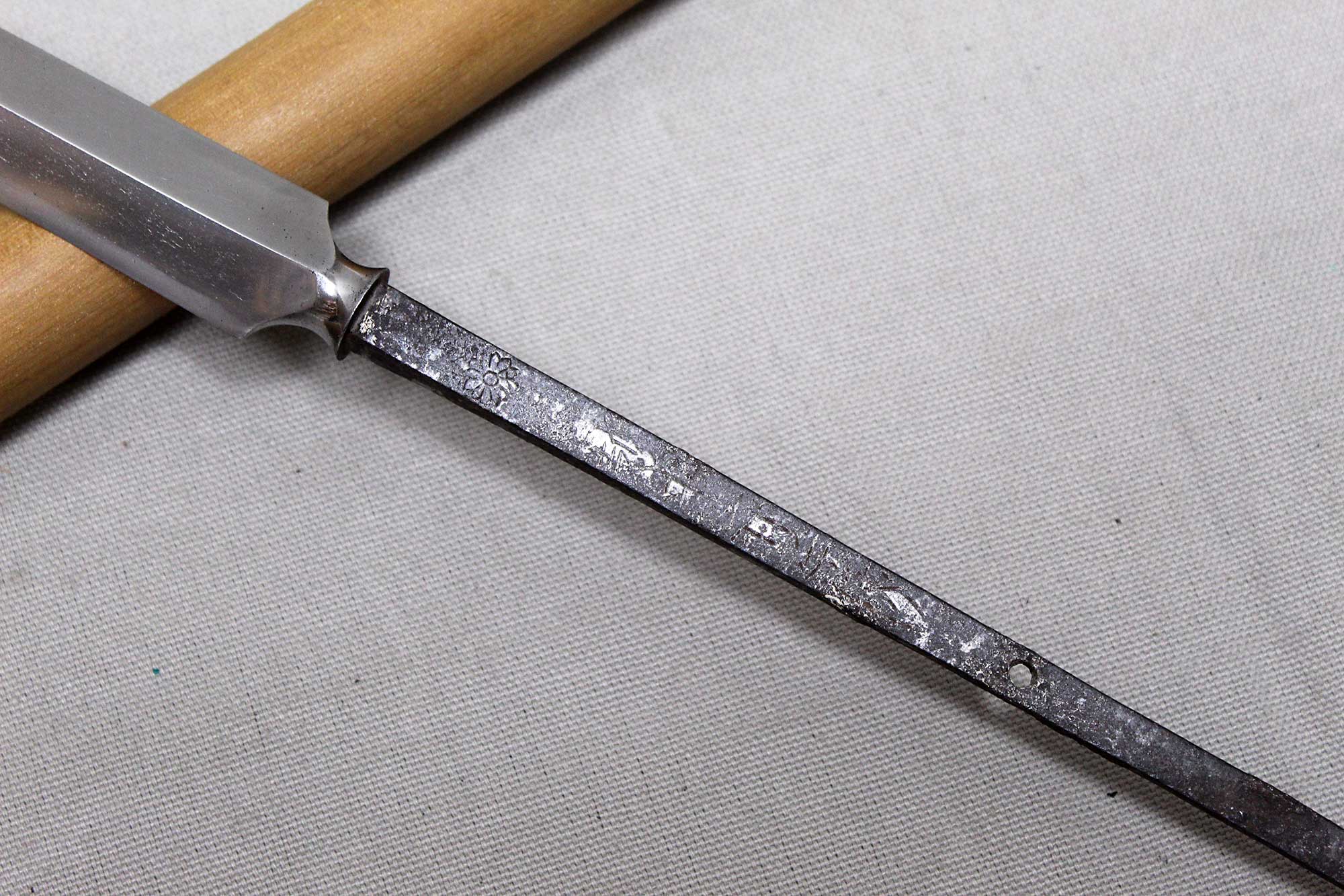 Japanese Yari (a traditionally-made blade in the form of a spear). Signed tang. Nice temper lines. Wooden display shaft. Most likely early Edo period from the 1600s range. Overall, nice displayable condition with decent old polish. Overall length of bare blade including tang approximately 19 1/2 inches, approximately 8 inches in length for blade spear.