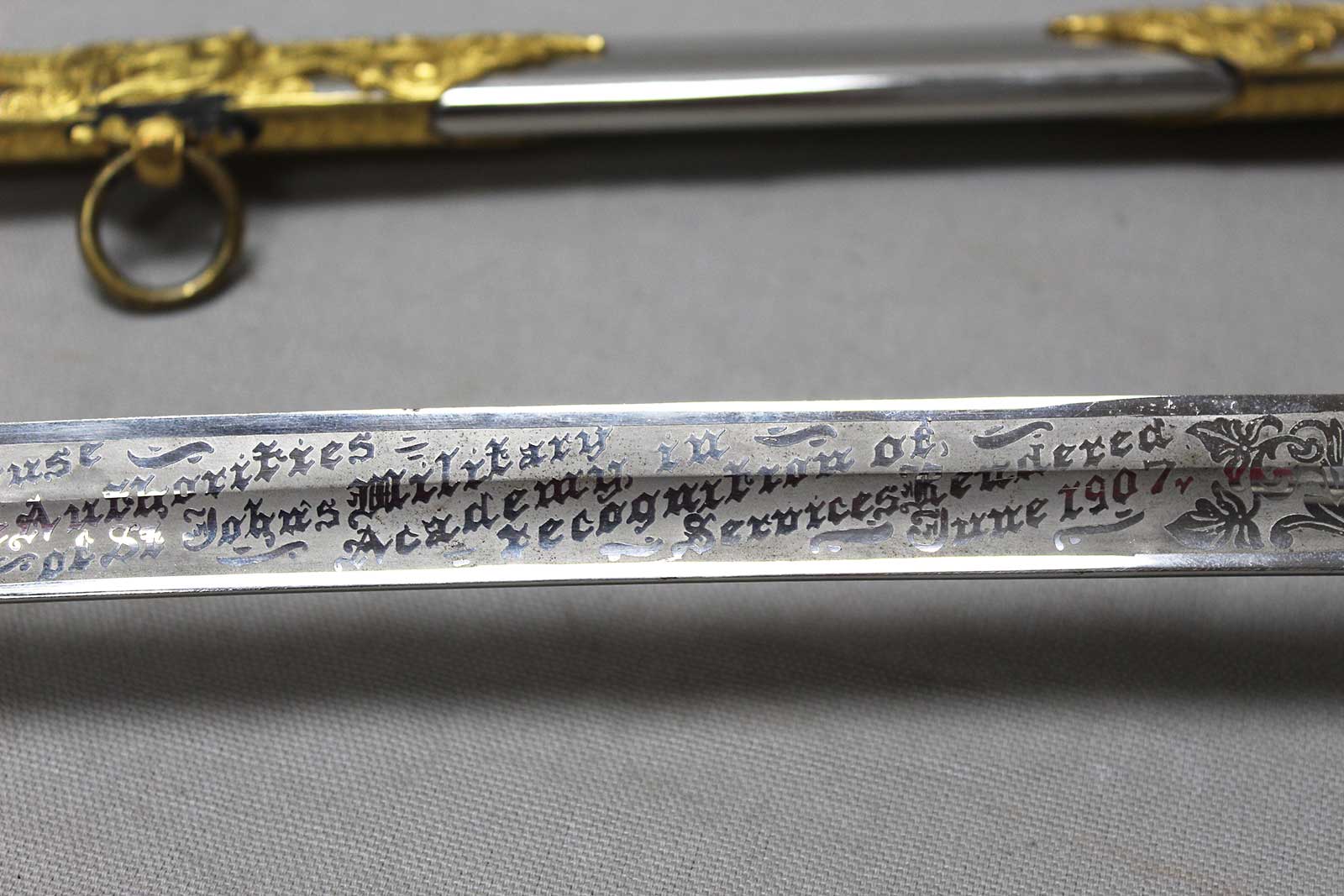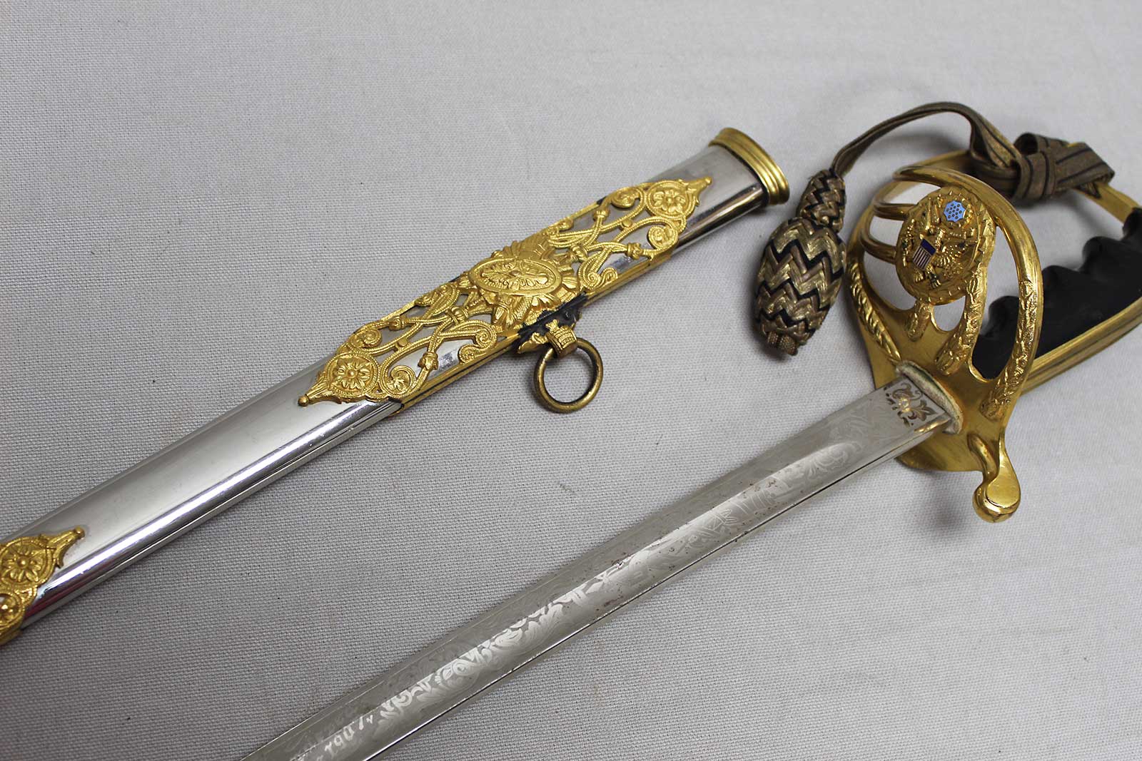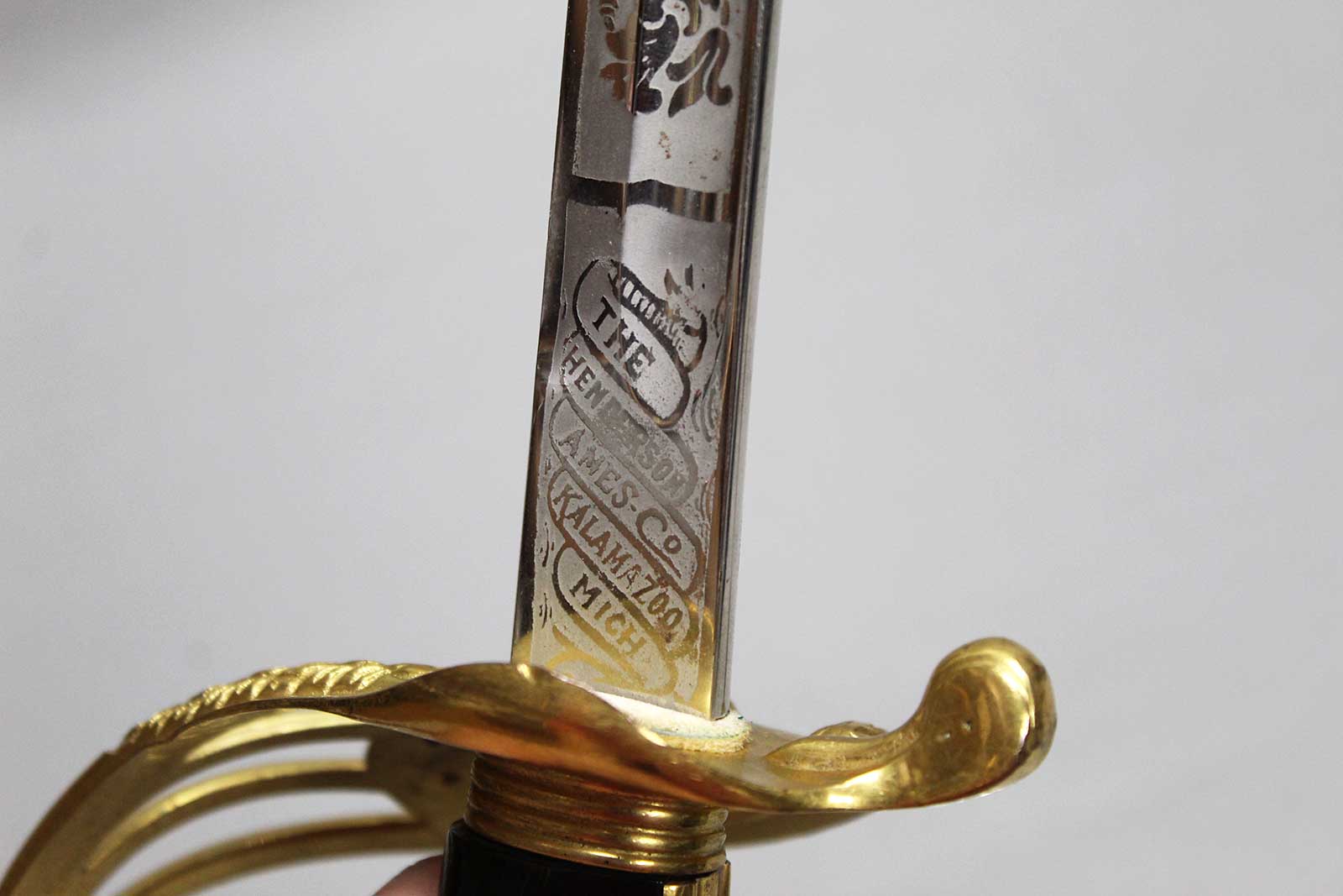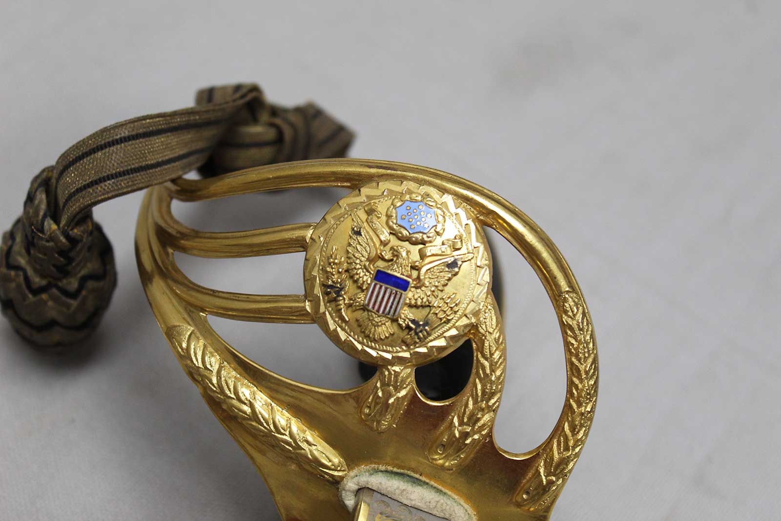 United States M-1902 High Grade Presentation Army Officer Sword with sword knot. This is not the standard M-1902 Army Officer Sword. This has gilded fittings and enhanced cross guard basket with a very nice eagle design with enamel work. Also, very nicely decorated scabbard. Blade is marker marked: The Henderson Ames Co. Kalamazoo Mich. The blade is also named with presentation information to on dedication panel (appears to be from what I can make out of the fancy script): Presented to Gerald W. Kanouse by the Authorities of St. John’s Military Academy in Recognition of Services Rendered June 1907. Blade length approximately 30 1/4 inches, overall length approximately 35 inches. Worn condition. Very nice-looking M-1902 High Grade Presentation Army Officer Sword.
