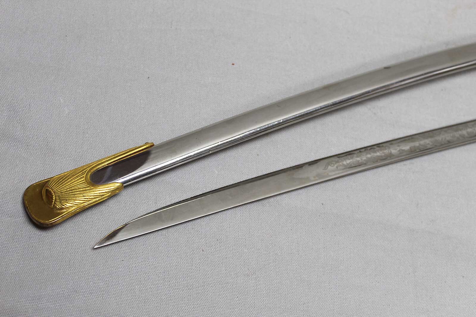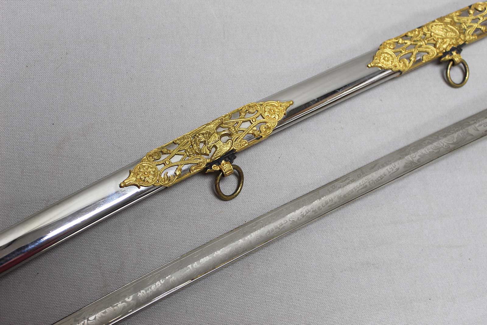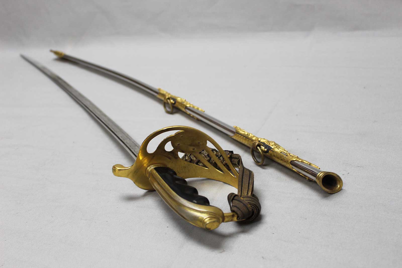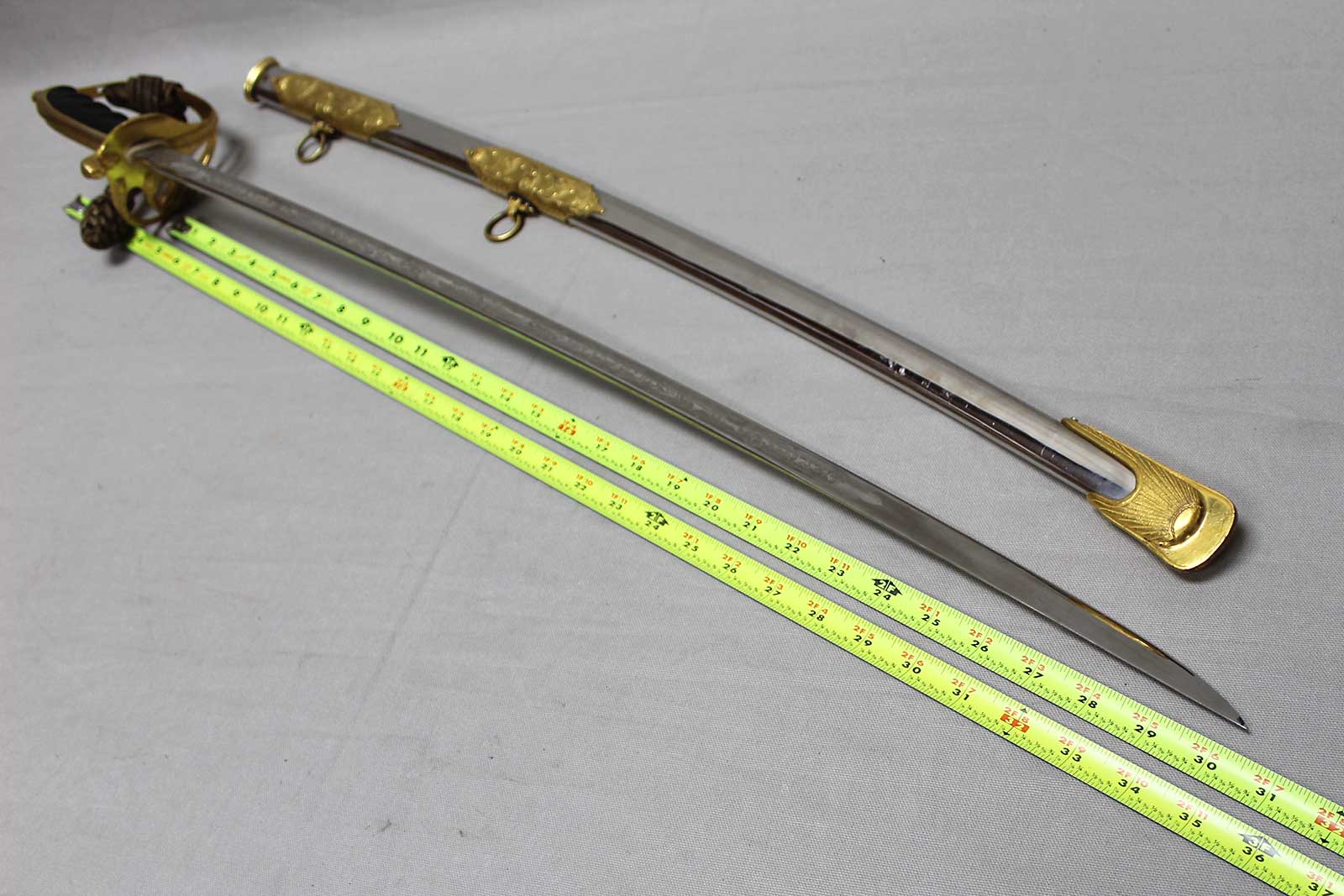 United States M-1902 High Grade Presentation Army Officer Sword with sword knot. This is not the standard M-1902 Army Officer Sword. This has gilded fittings and enhanced cross guard basket with a very nice eagle design with enamel work. Also, very nicely decorated scabbard. Blade is marker marked: The Henderson Ames Co. Kalamazoo Mich. The blade is also named with presentation information to on dedication panel (appears to be from what I can make out of the fancy script): Presented to Gerald W. Kanouse by the Authorities of St. John’s Military Academy in Recognition of Services Rendered June 1907. Blade length approximately 30 1/4 inches, overall length approximately 35 inches. Worn condition. Very nice-looking M-1902 High Grade Presentation Army Officer Sword.