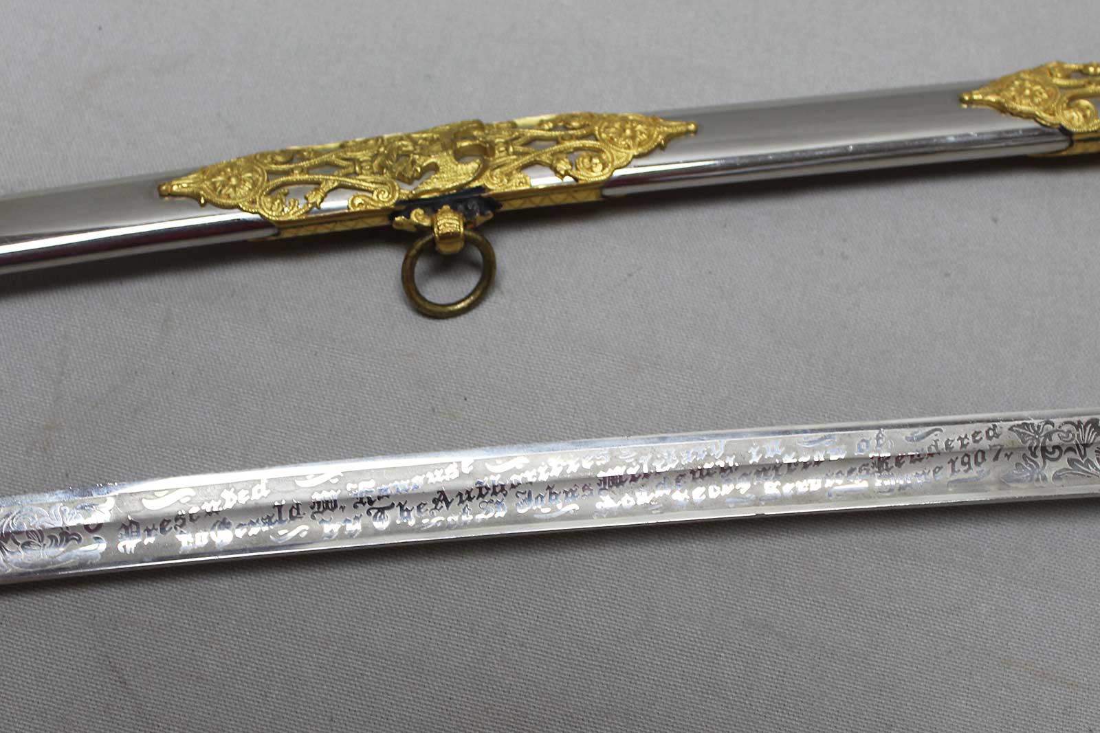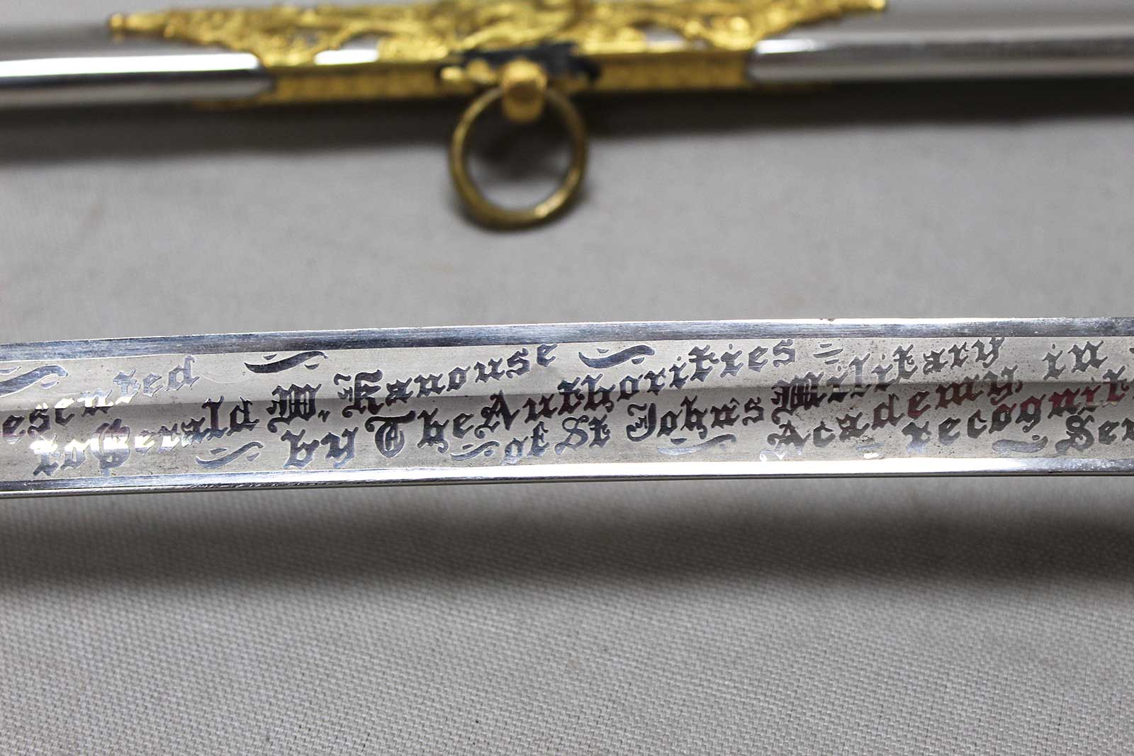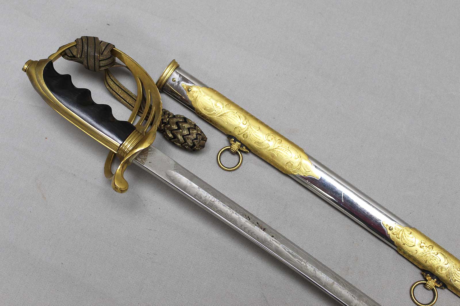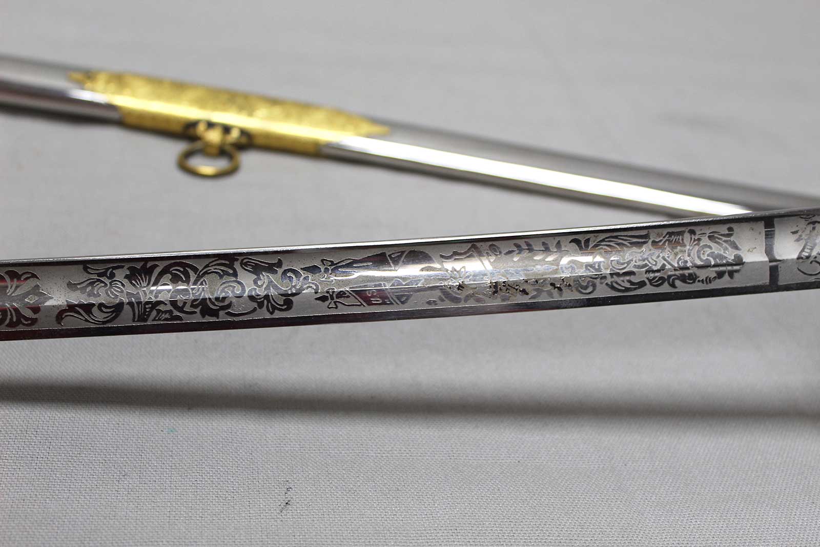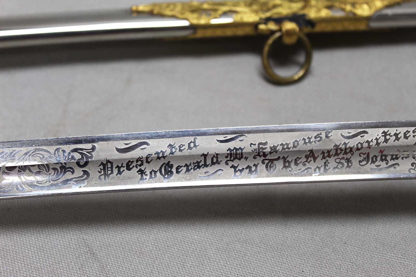 United States M-1902 High Grade Presentation Army Officer Sword with sword knot. This is not the standard M-1902 Army Officer Sword. This has gilded fittings and enhanced cross guard basket with a very nice eagle design with enamel work. Also, very nicely decorated scabbard. Blade is marker marked: The Henderson Ames Co. Kalamazoo Mich. The blade is also named with presentation information to on dedication panel (appears to be from what I can make out of the fancy script): Presented to Gerald W. Kanouse by the Authorities of St. John’s Military Academy in Recognition of Services Rendered June 1907. Blade length approximately 30 1/4 inches, overall length approximately 35 inches. Worn condition. Very nice-looking M-1902 High Grade Presentation Army Officer Sword.