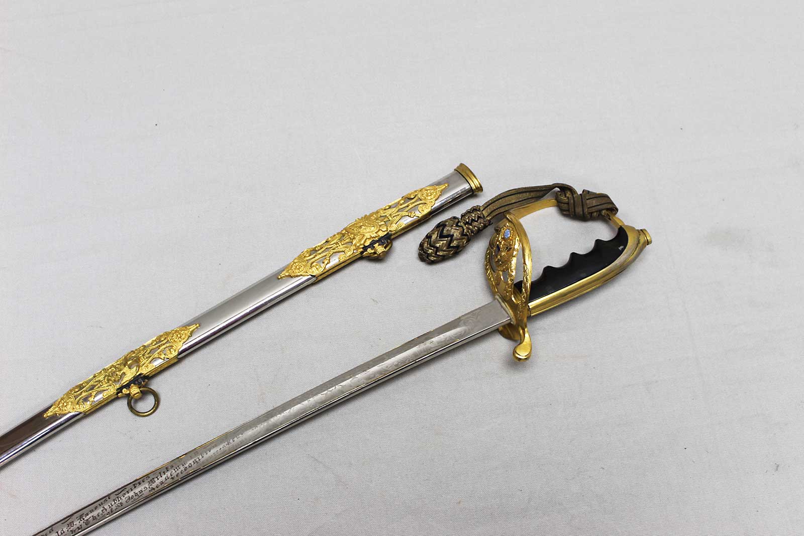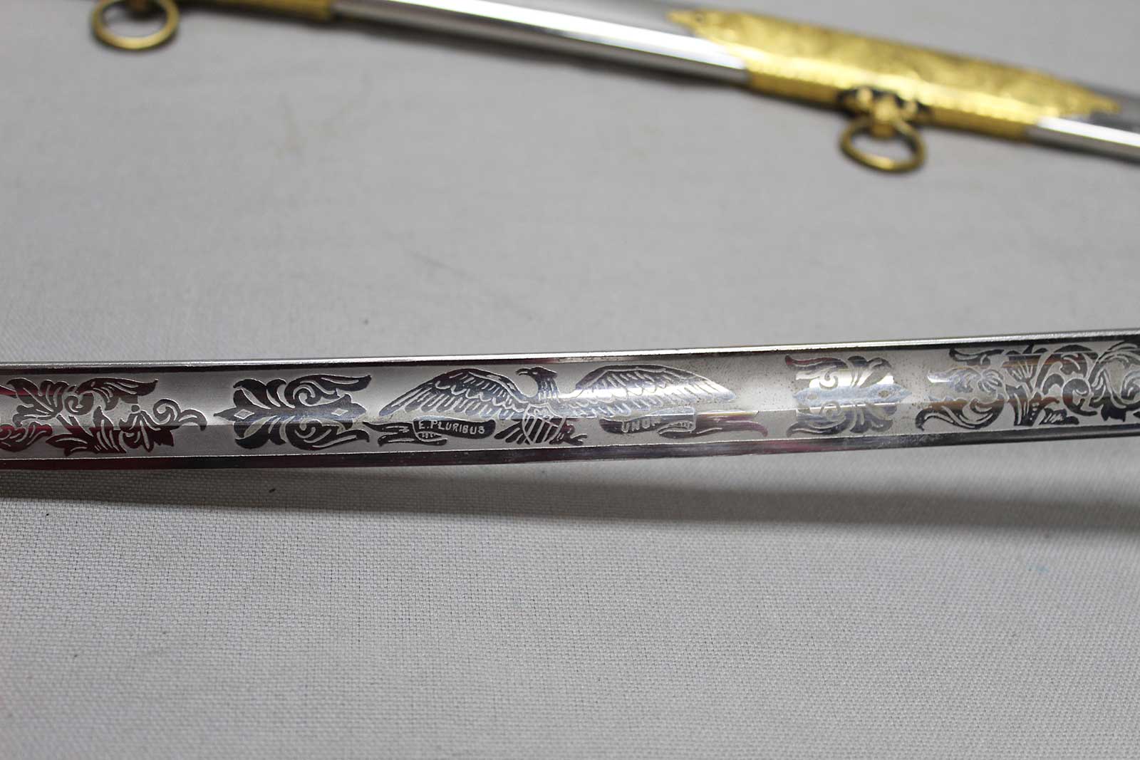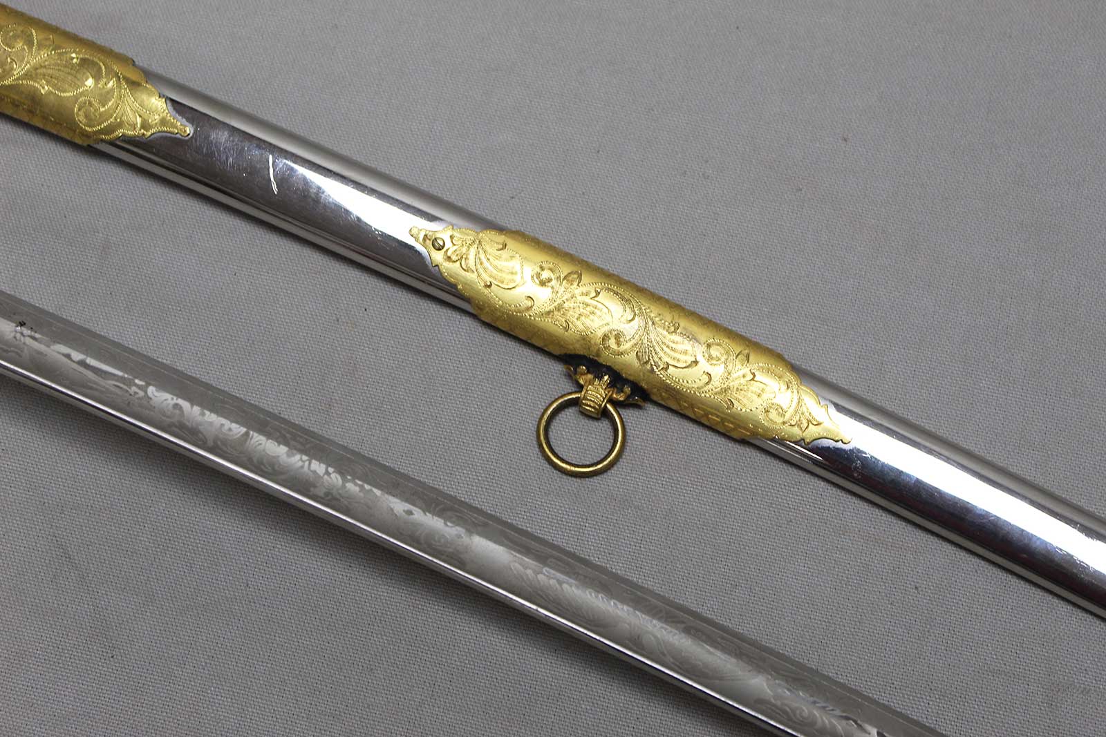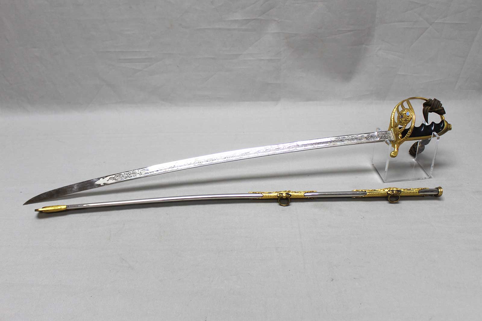 United States M-1902 High Grade Presentation Army Officer Sword with sword knot. This is not the standard M-1902 Army Officer Sword. This has gilded fittings and enhanced cross guard basket with a very nice eagle design with enamel work. Also, very nicely decorated scabbard. Blade is marker marked: The Henderson Ames Co. Kalamazoo Mich. The blade is also named with presentation information to on dedication panel (appears to be from what I can make out of the fancy script): Presented to Gerald W. Kanouse by the Authorities of St. John’s Military Academy in Recognition of Services Rendered June 1907. Blade length approximately 30 1/4 inches, overall length approximately 35 inches. Worn condition. Very nice-looking M-1902 High Grade Presentation Army Officer Sword.