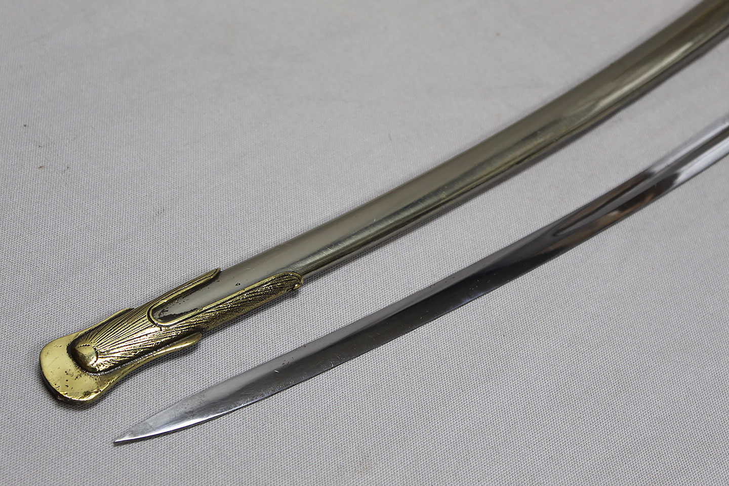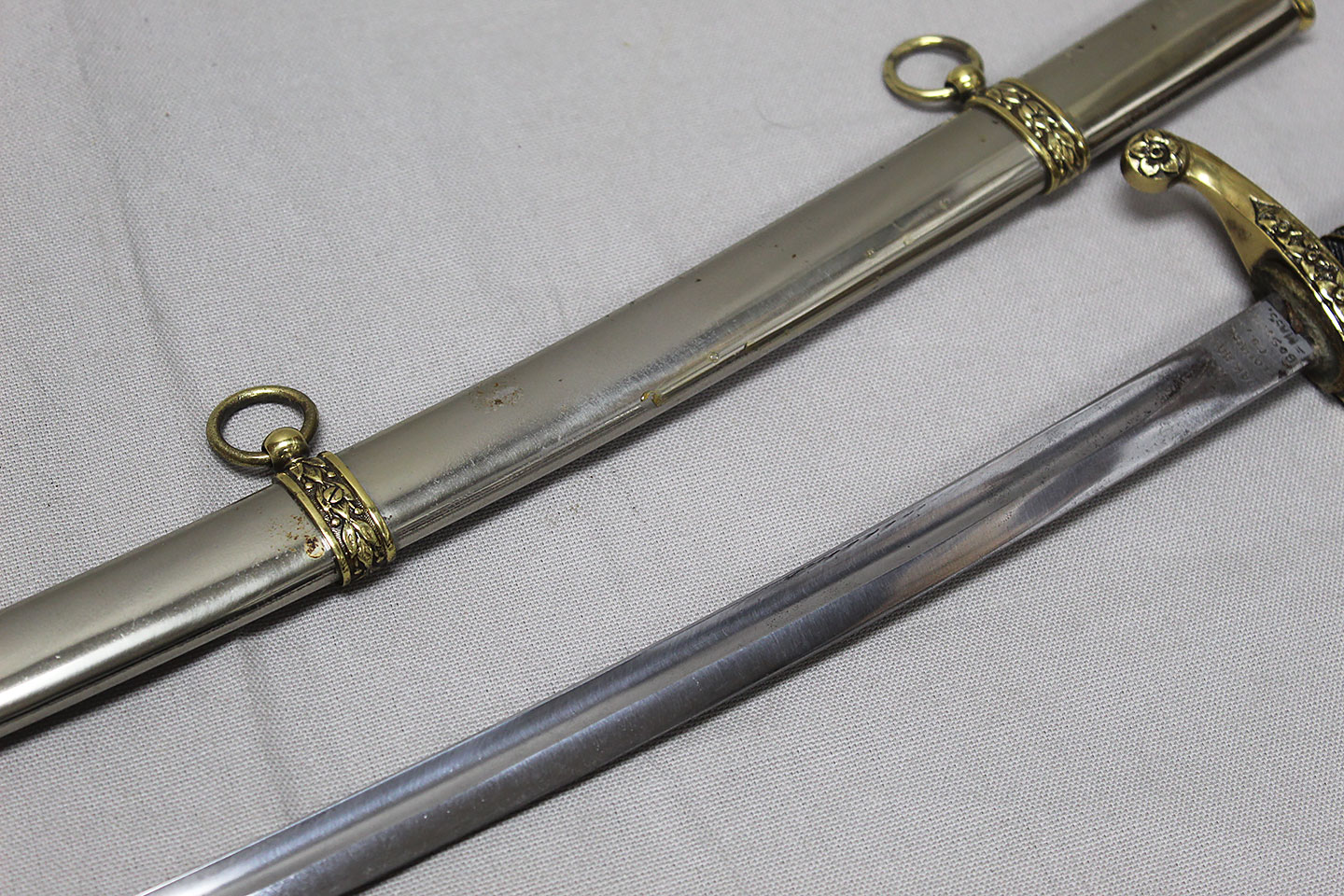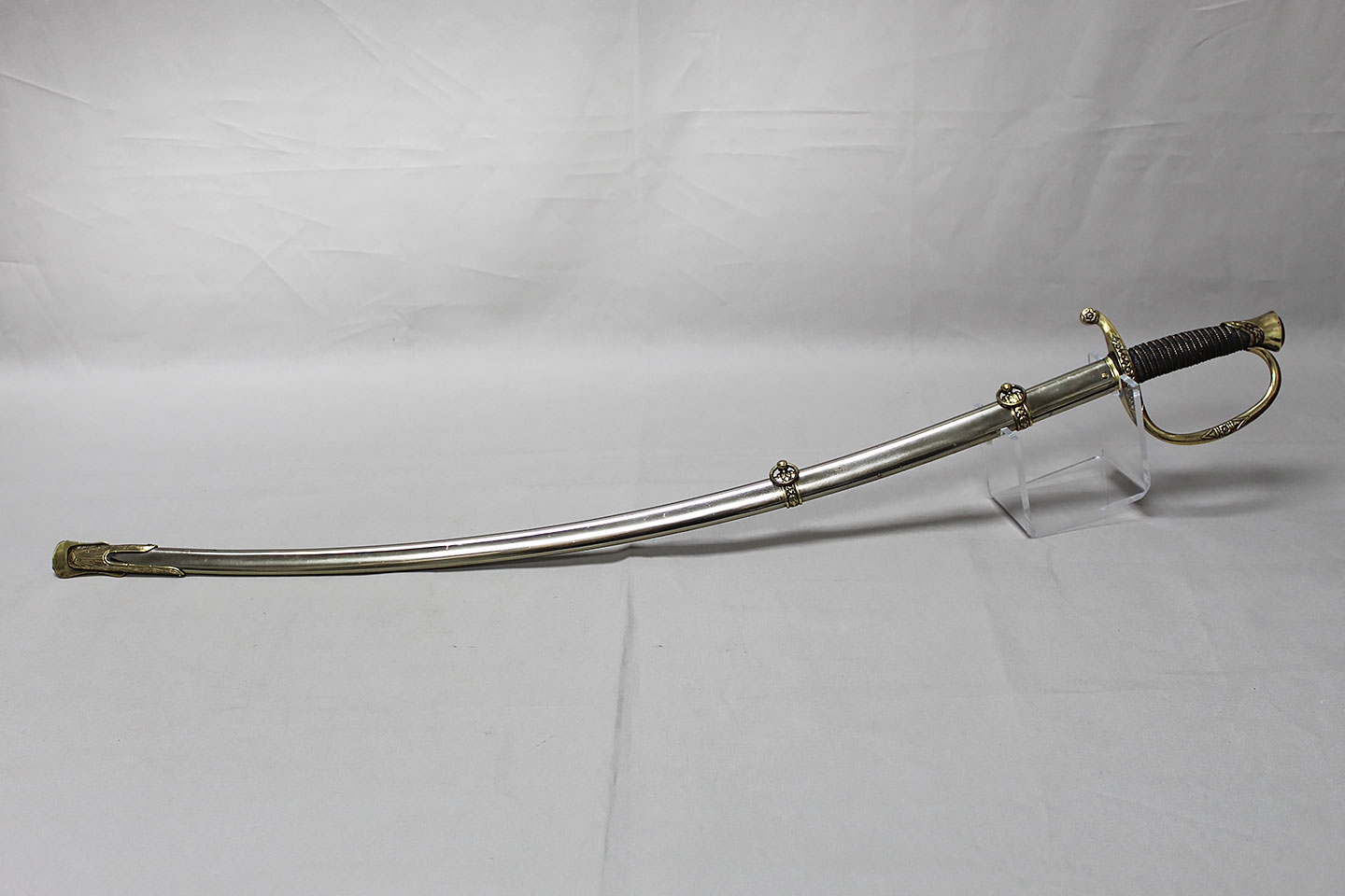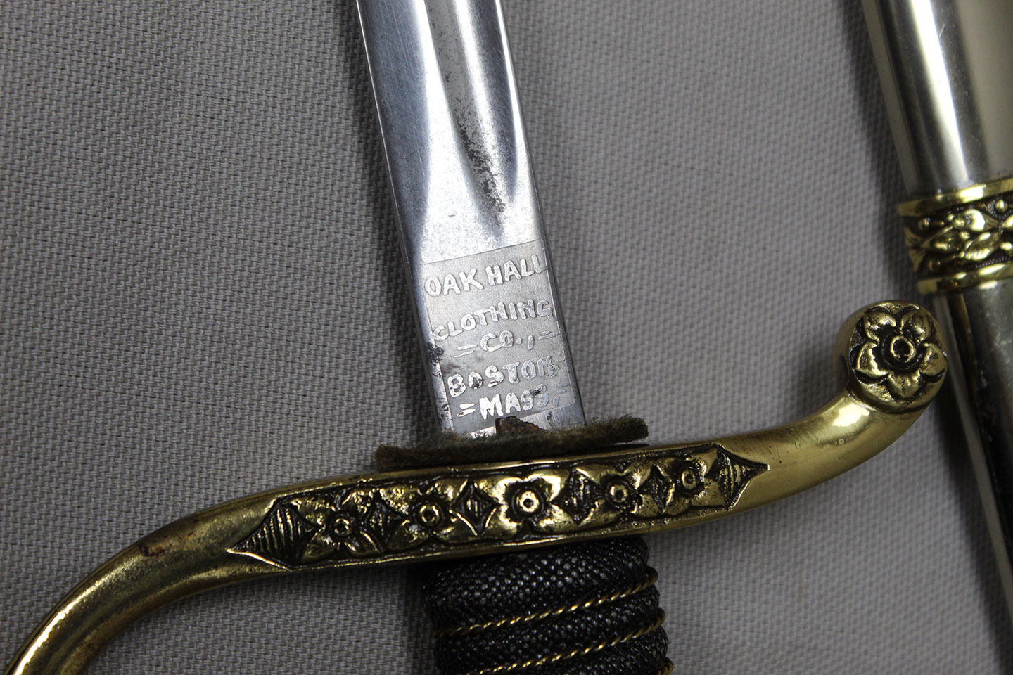 US M-1872 Artillery Officers Presentation Grade Sword. Marker marked on blade ricasso “Oak Hall Clothing Co., Boston Mass”. Presentation named to individual on one side on blade in dedication panel. Overall very good condition presentation grade sword.