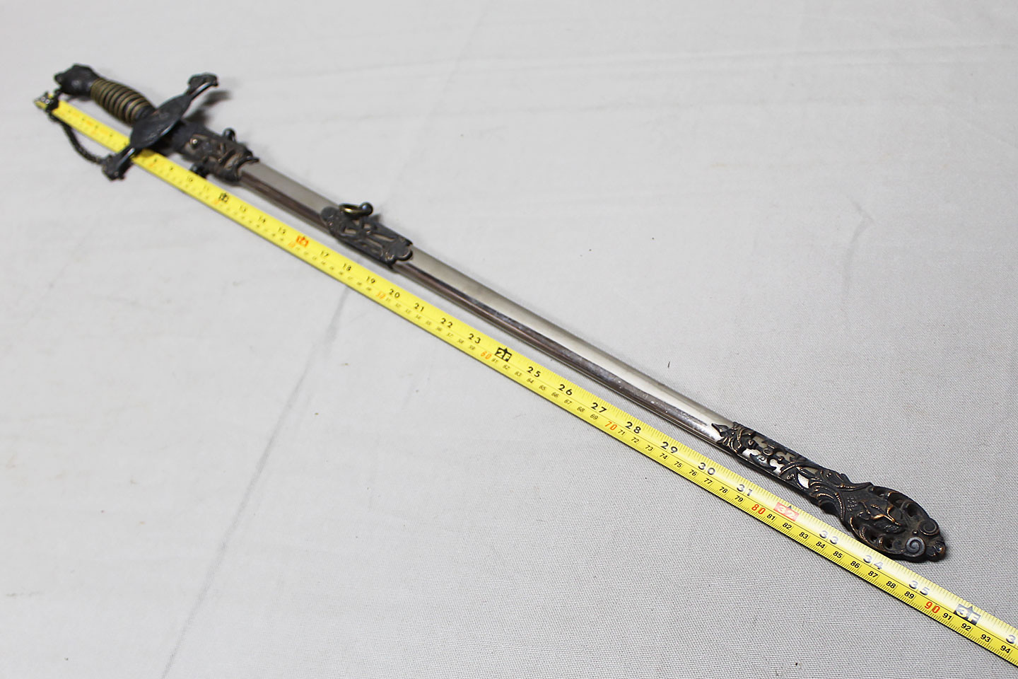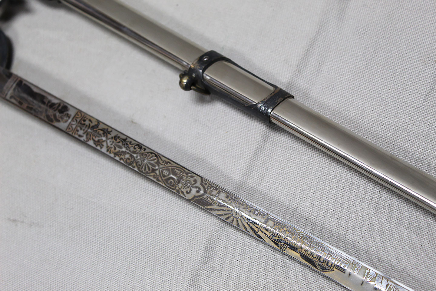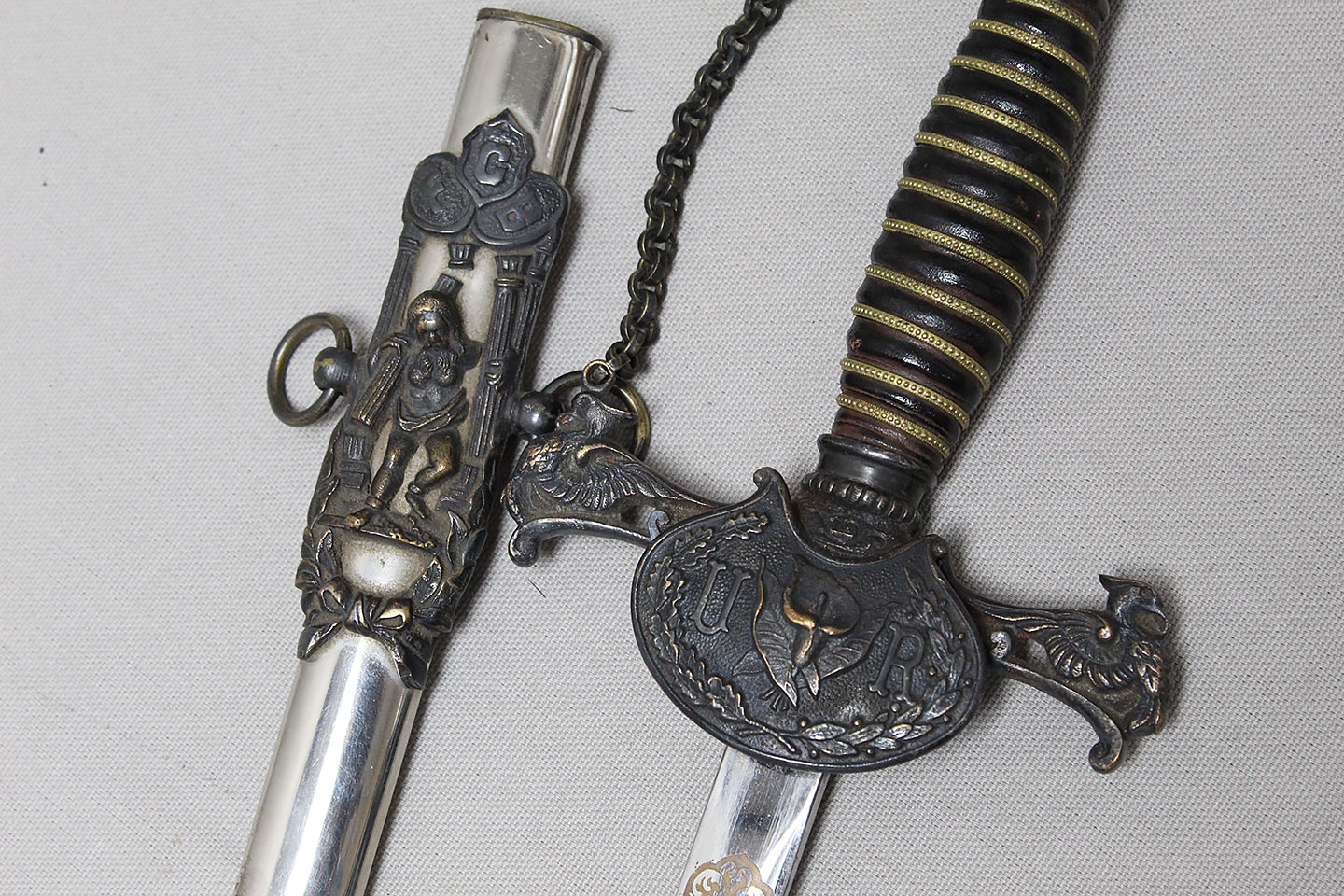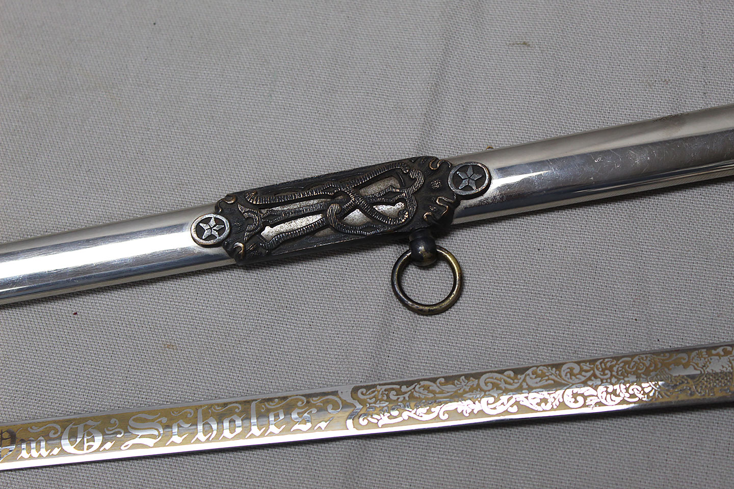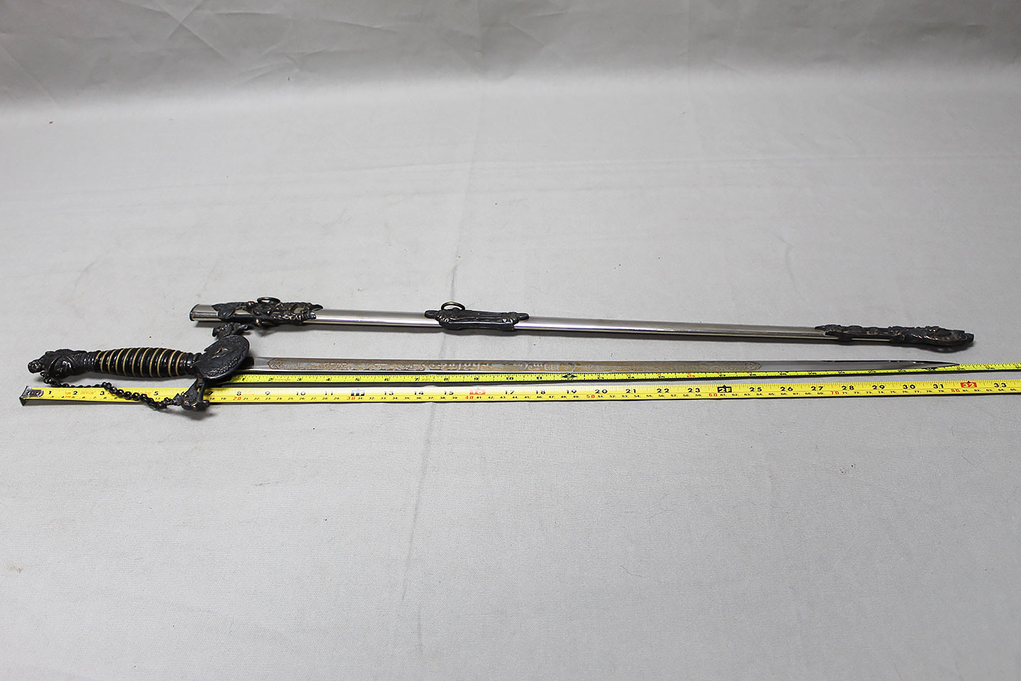 American Lodge Ceremonial Sword. KP Knights of Pythias. Guard decorated with a Calla Lilly and the letters U.R. (Unformed Rank) on one side and the letters F.C.B. (Friendship, Charity, Benevolence) on the other side. Scabbard has three oval tablets with the letters FCB above a representation of Samson pulling down the pillars of a temple. Double engraved blade. Named in blade dedication panel. Marker marked The Armstrong Company on blade ricasso area. Blade length approximately 25 inches. Overall length approximately 35 inches. I believe this one would date from the early to mid 1900s.