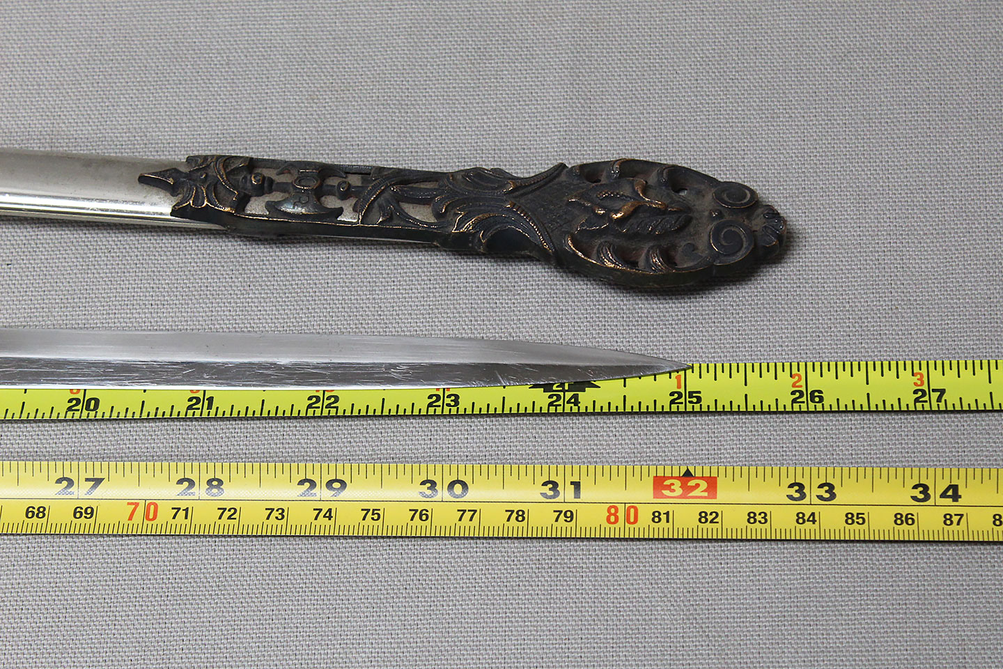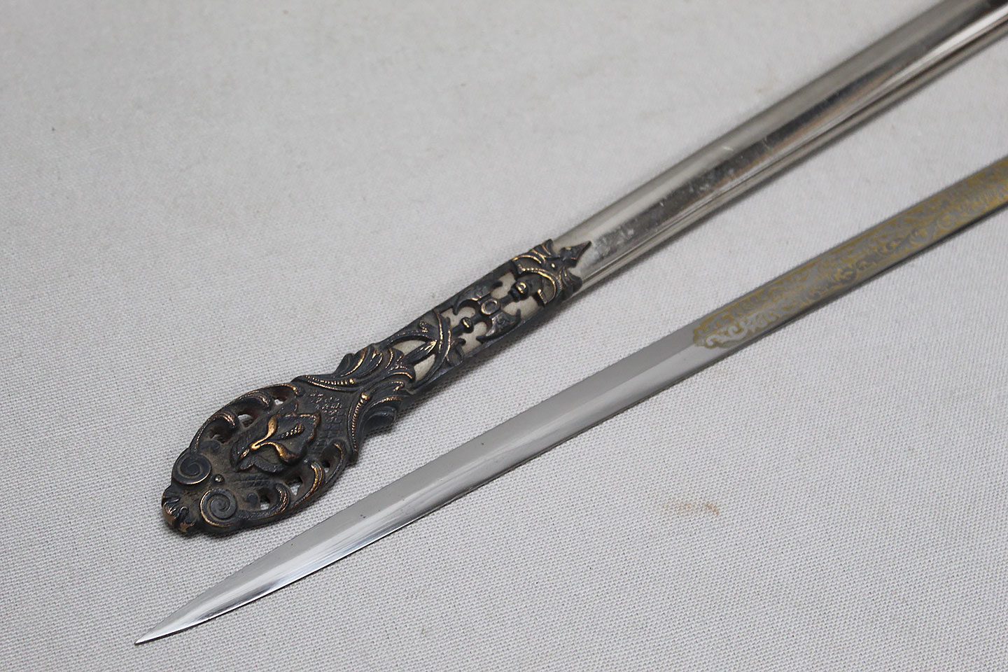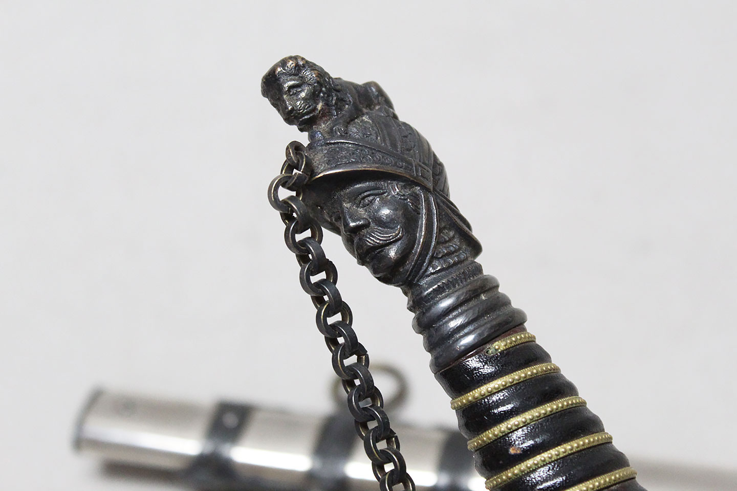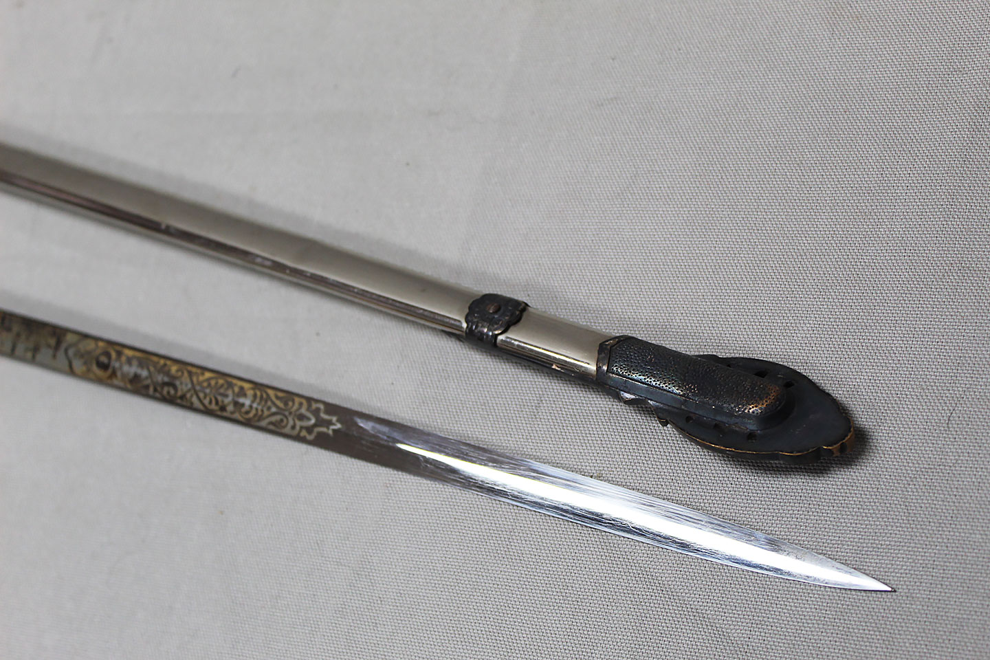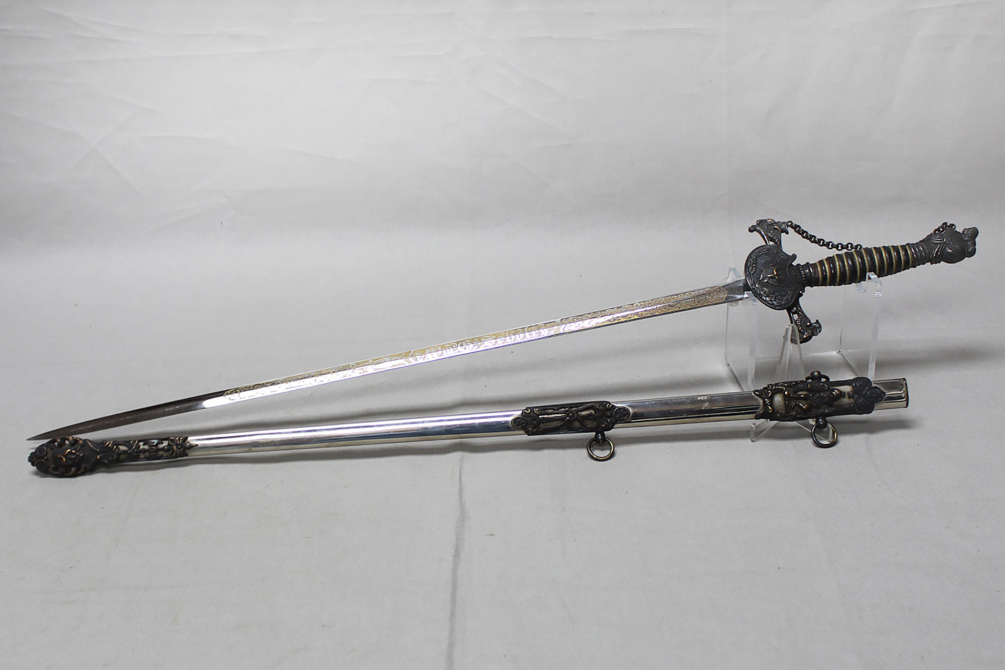 American Lodge Ceremonial Sword. KP Knights of Pythias. Guard decorated with a Calla Lilly and the letters U.R. (Unformed Rank) on one side and the letters F.C.B. (Friendship, Charity, Benevolence) on the other side. Scabbard has three oval tablets with the letters FCB above a representation of Samson pulling down the pillars of a temple. Double engraved blade. Named in blade dedication panel. Marker marked The Armstrong Company on blade ricasso area. Blade length approximately 25 inches. Overall length approximately 35 inches. I believe this one would date from the early to mid 1900s.