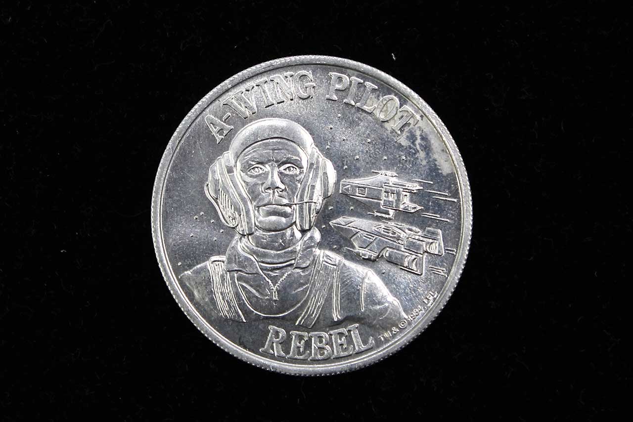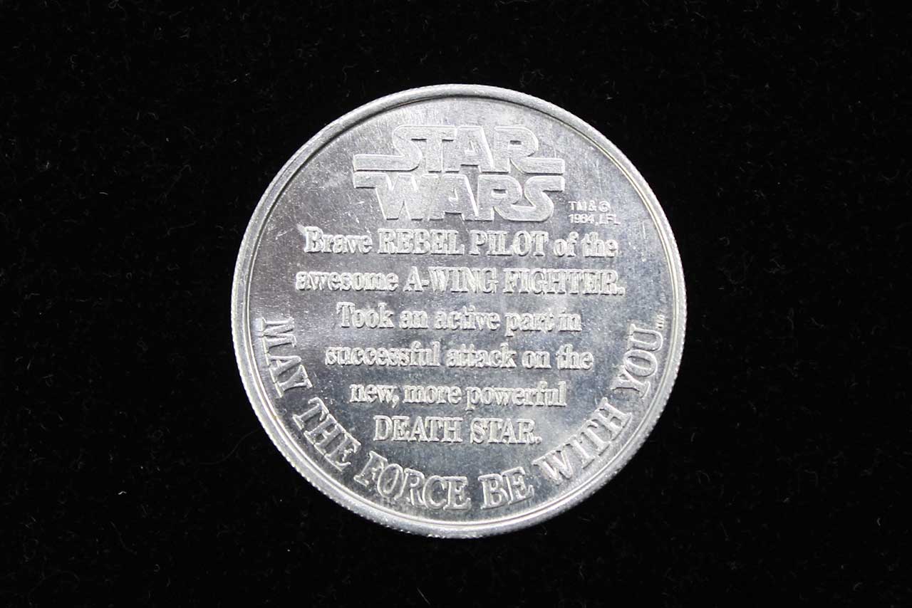 The coin was included in 1984–85 with the POTF “Last 17” A‑Wing Pilot action figure. It’s a silver‑tone, character‑stamped collector’s coin depicting the A‑Wing Pilot and his starfighter. Ungraded and worn condition.