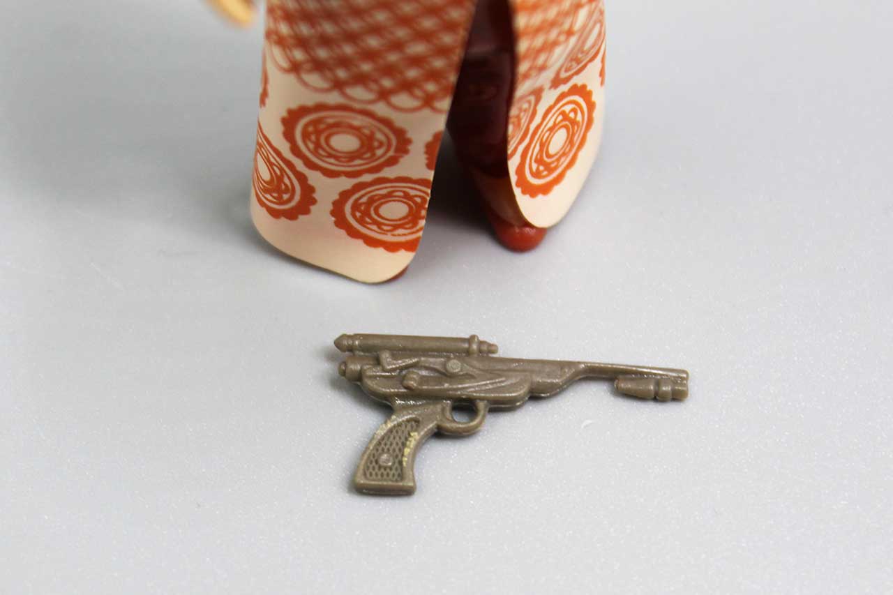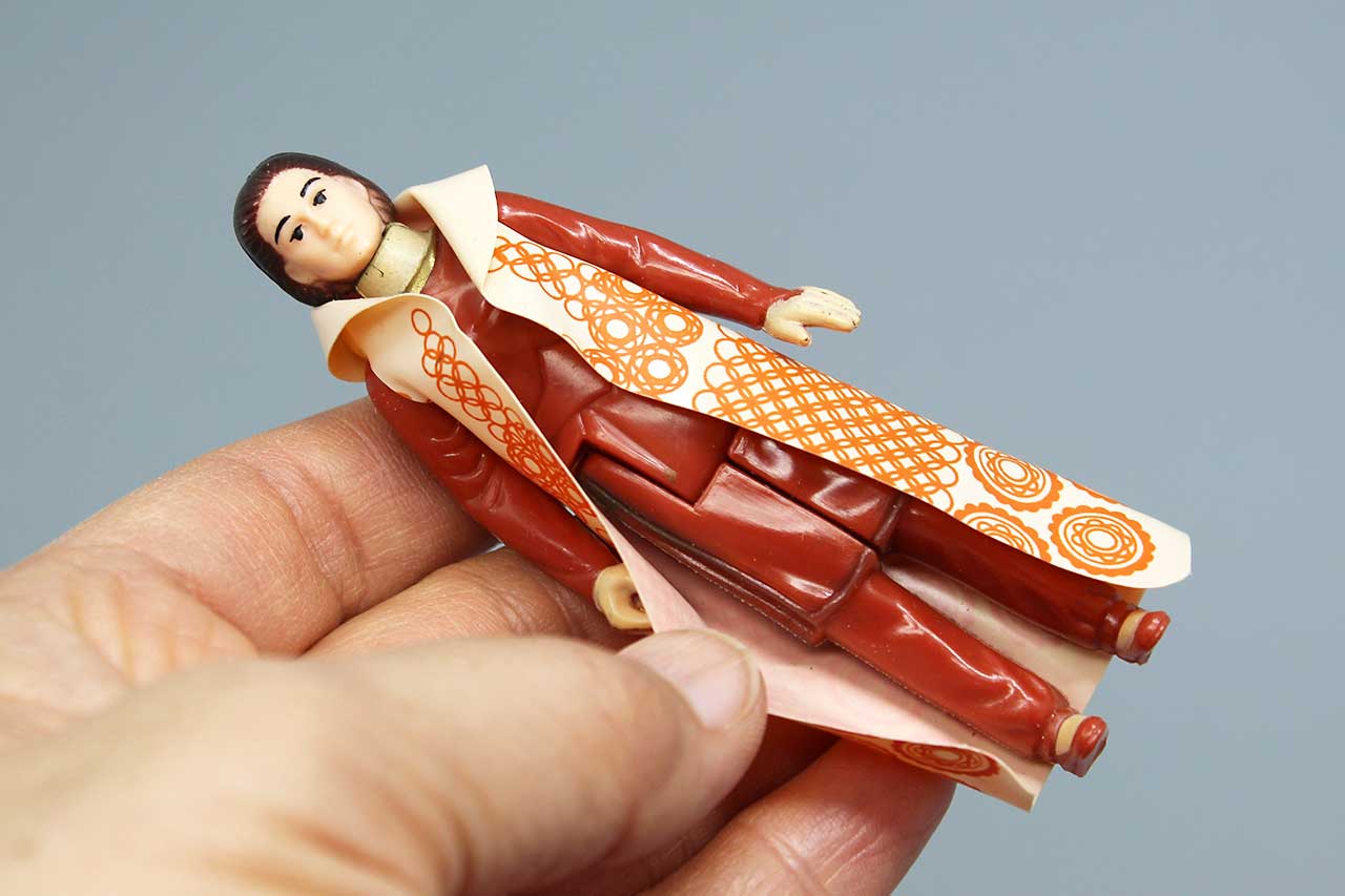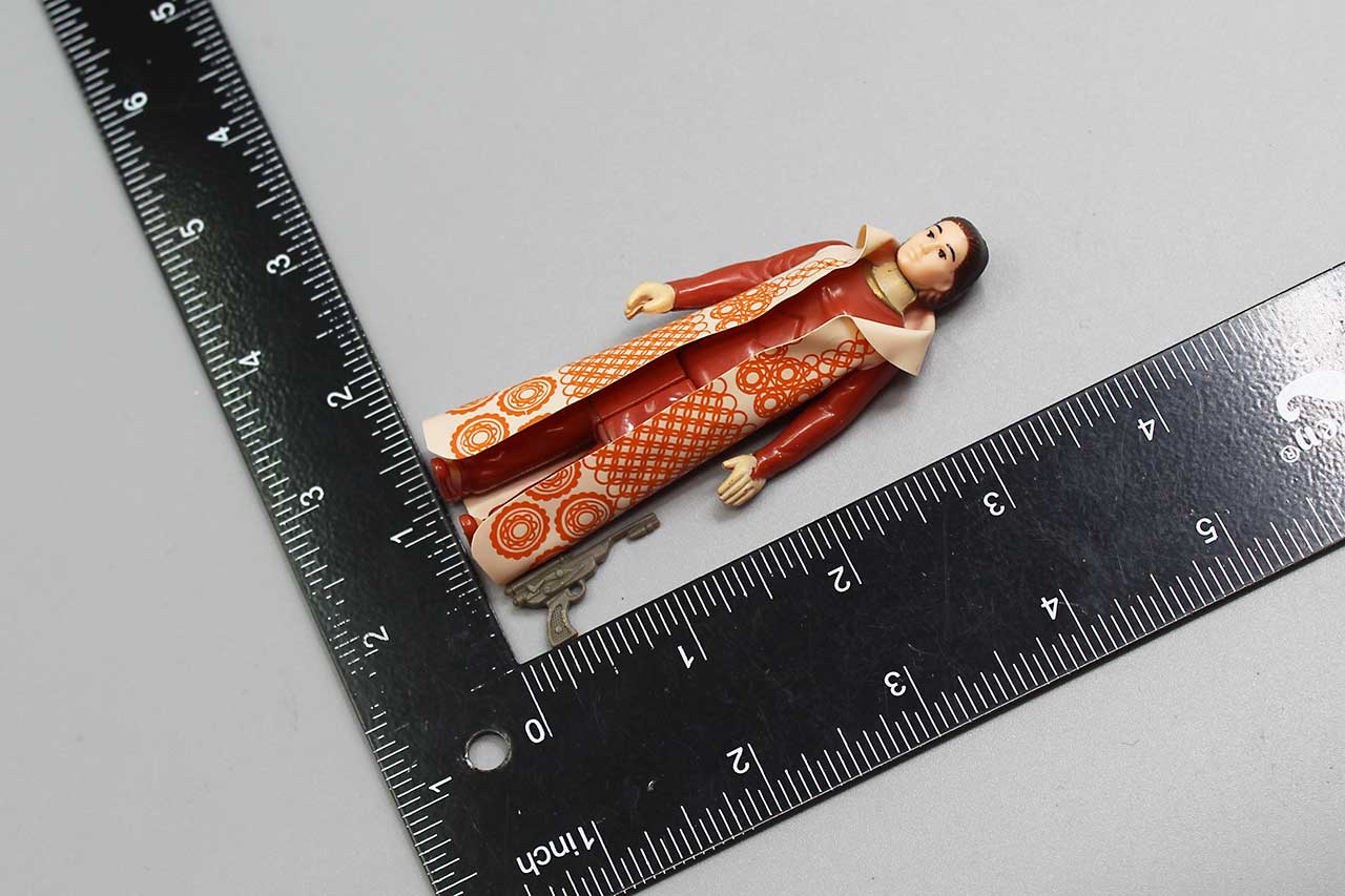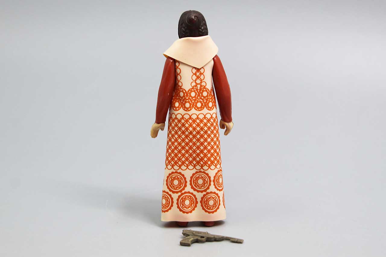 Vintage Original Star Wars action figure. 1980 Princess Leia Organa (Bespin Gown) with vinyl cape. Dated on leg 1980 L.F.L. Hong Kong. Also, figure has palace blaster in gray (not officially for figure, however, looks good with the figure). Approximately 3 3/4 inches in height. Good overall condition with some wear (see pictures for details) and nice tight joints and limbs.