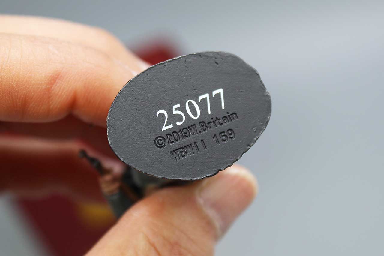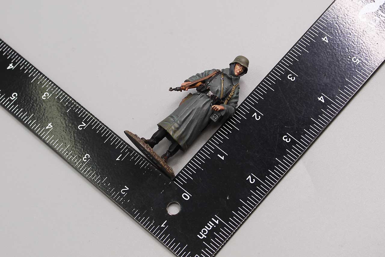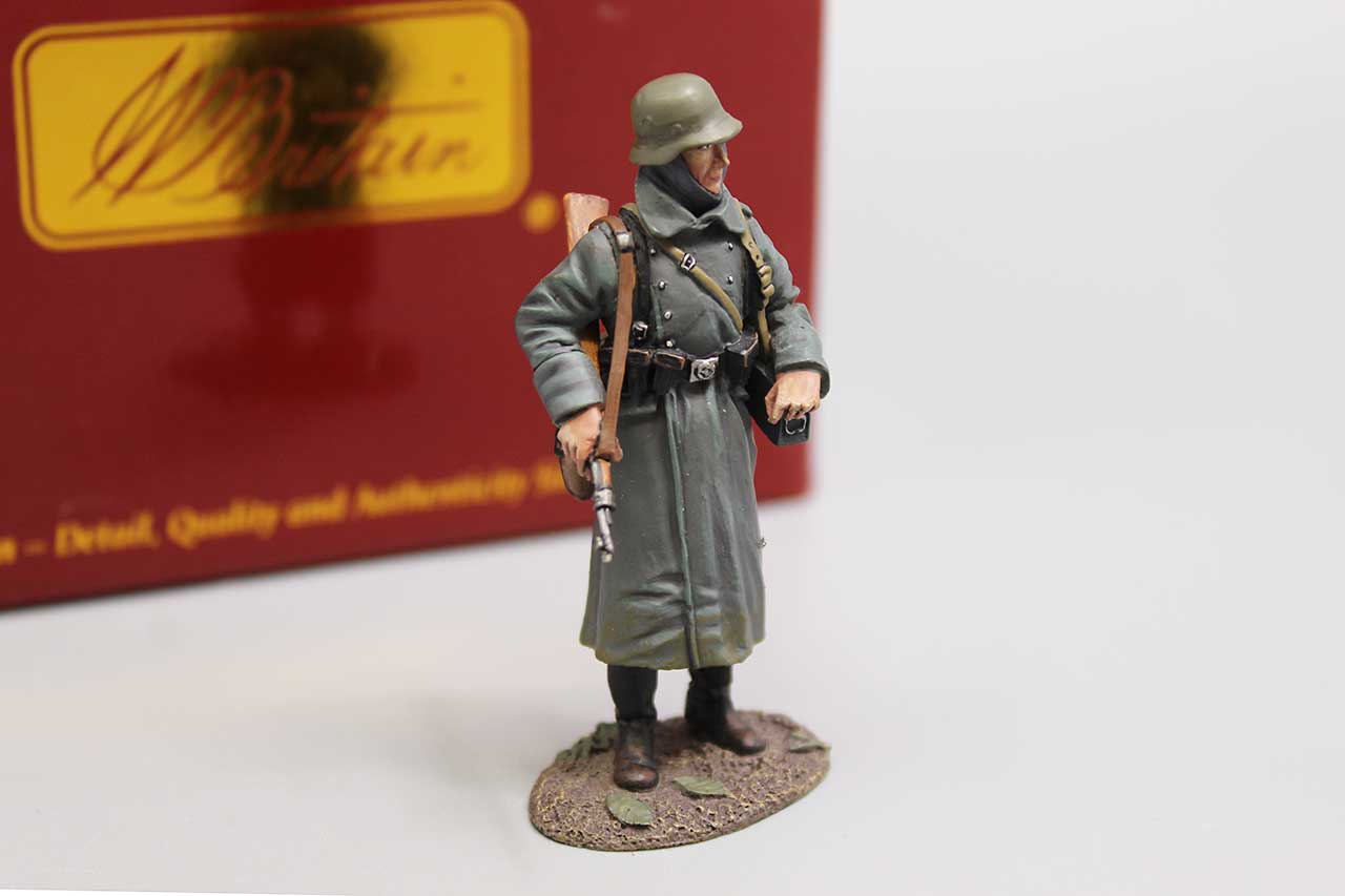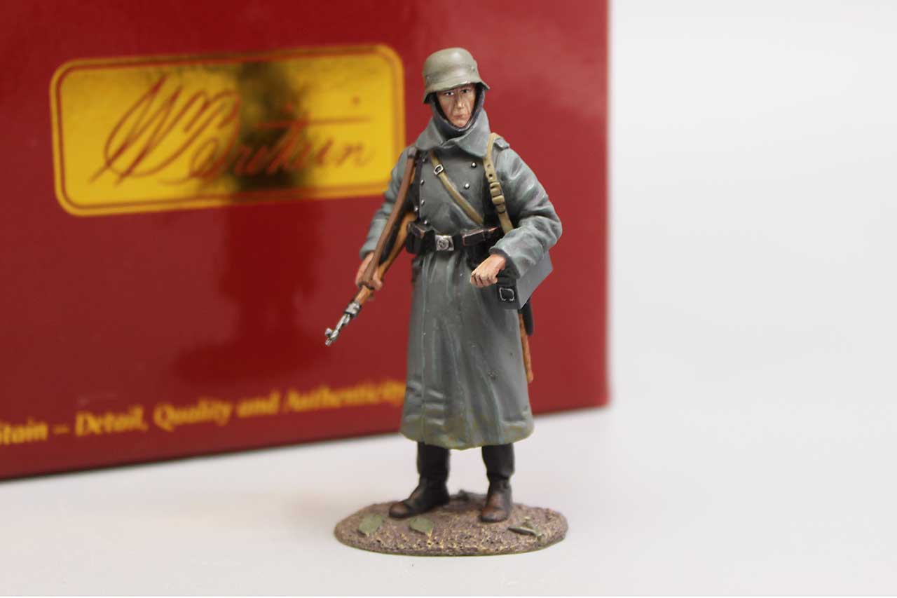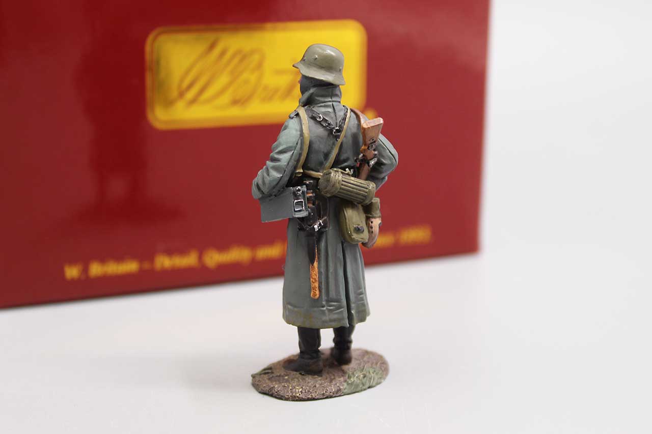 W. Britain Toy Soldier German Volksgrenadier in Greatcoat in Box. Numbered on bottom: 25077 2019 W. Britain. WBWII 159. Approximately 2 3/4 inches in height.