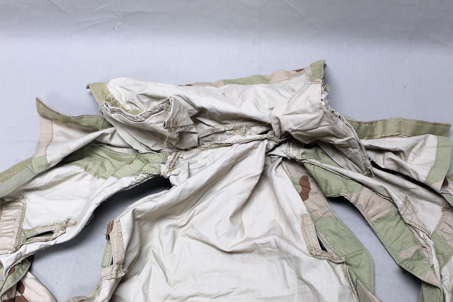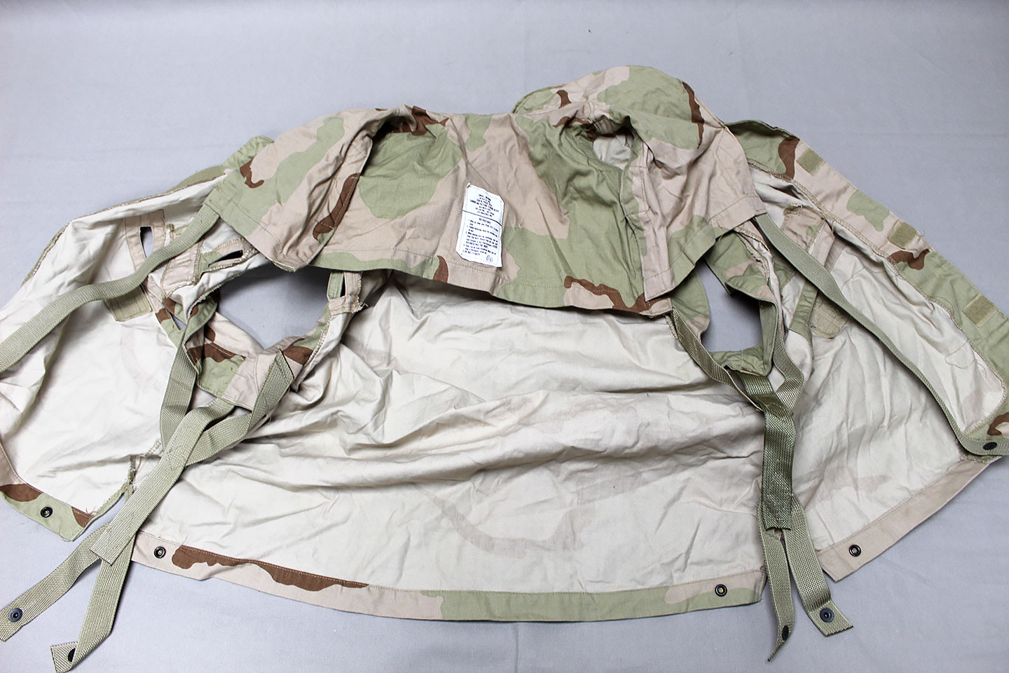 U.S. Military PASGT Vest 3-Color desert camoflauge. Contract tag is size marked Small/Medium and contract dated 91 and marked Cover, PASGT VEST, Camo Pattern (3 color) desert 50% Nylon 50% Cotton. Worn and used condition.