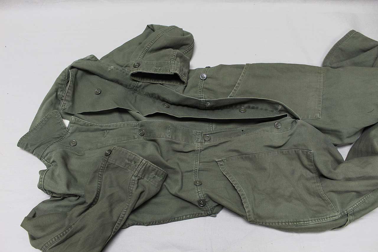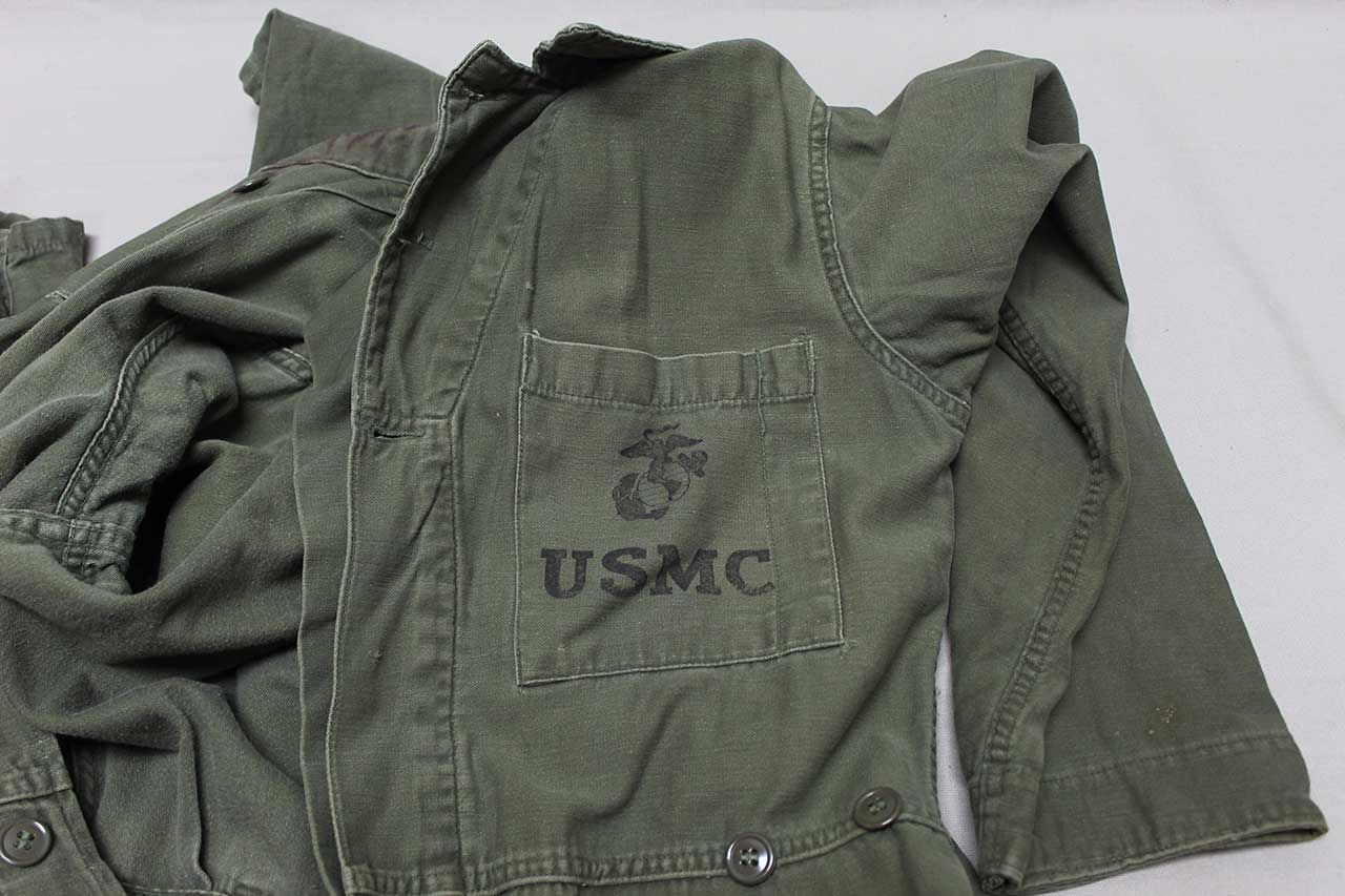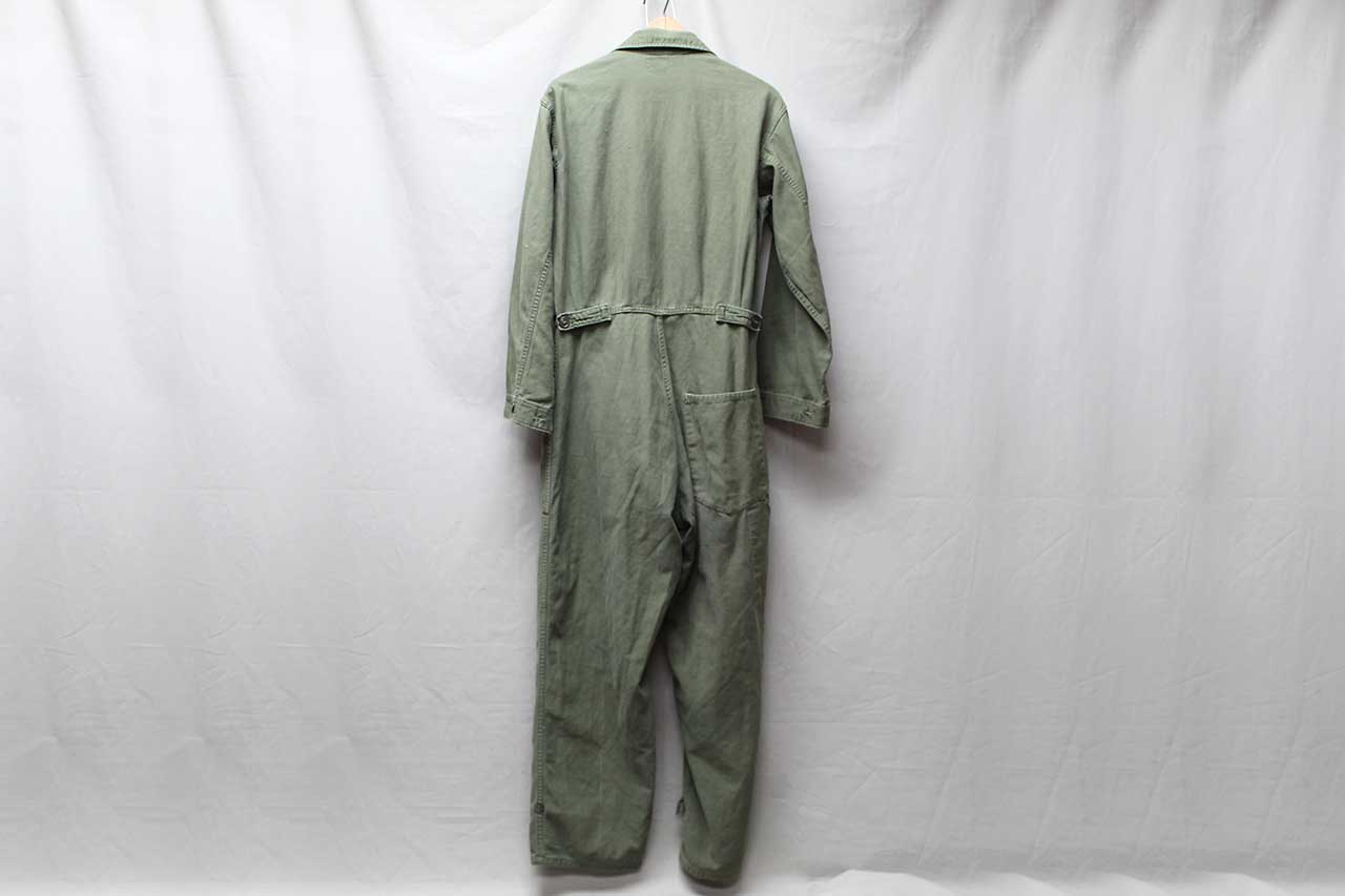 United States Marine Corps (USMC) One-Piece Coverall. Printed EGA on pocket area. Not quite sure what this one was for, some type of mechanic or work uniform. Contract tag washed out, however, written in pen size Large. Also, not sure about material, appears to be most likely some type of cotton or cotton blend. Most likely 1950s-1960 era. Worn and used condition.