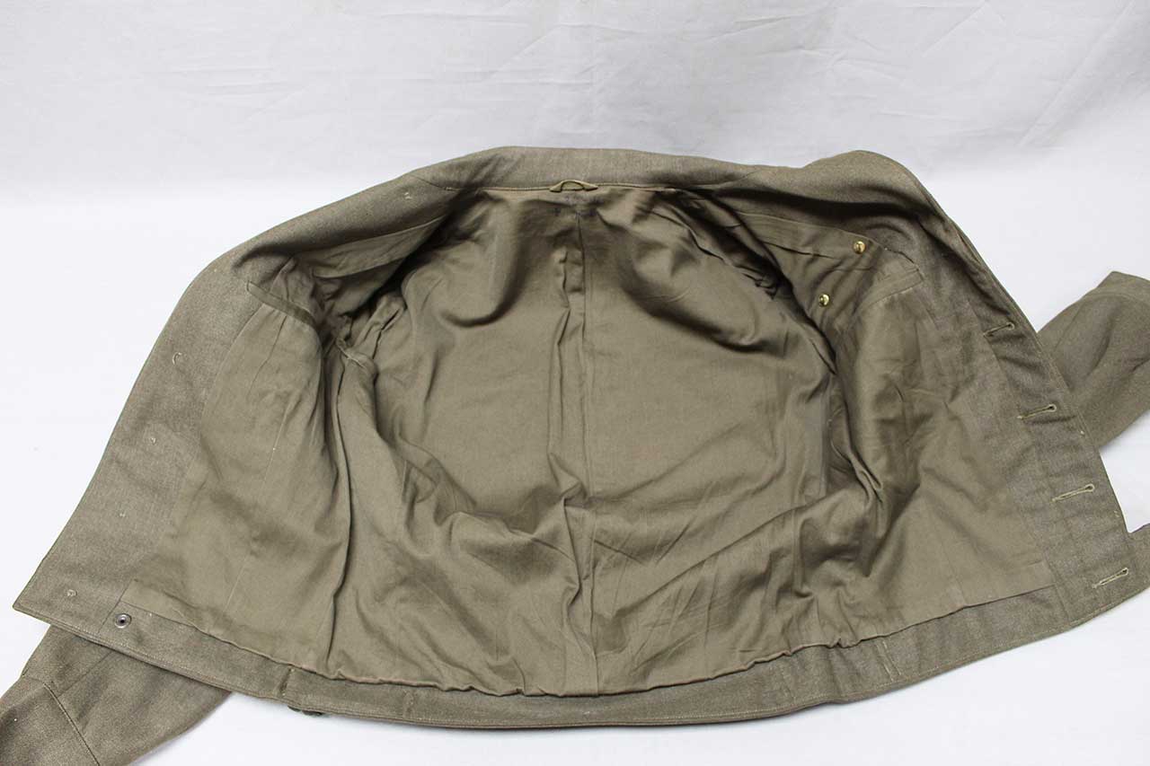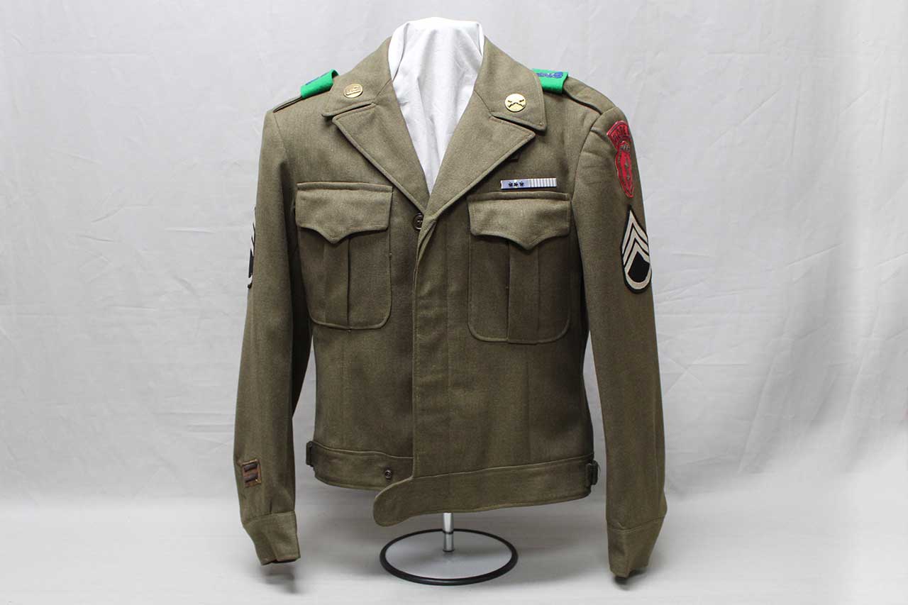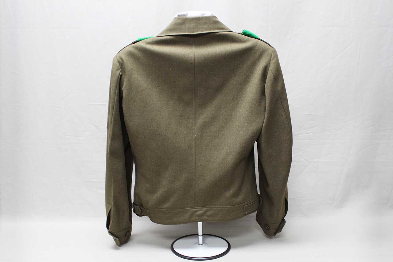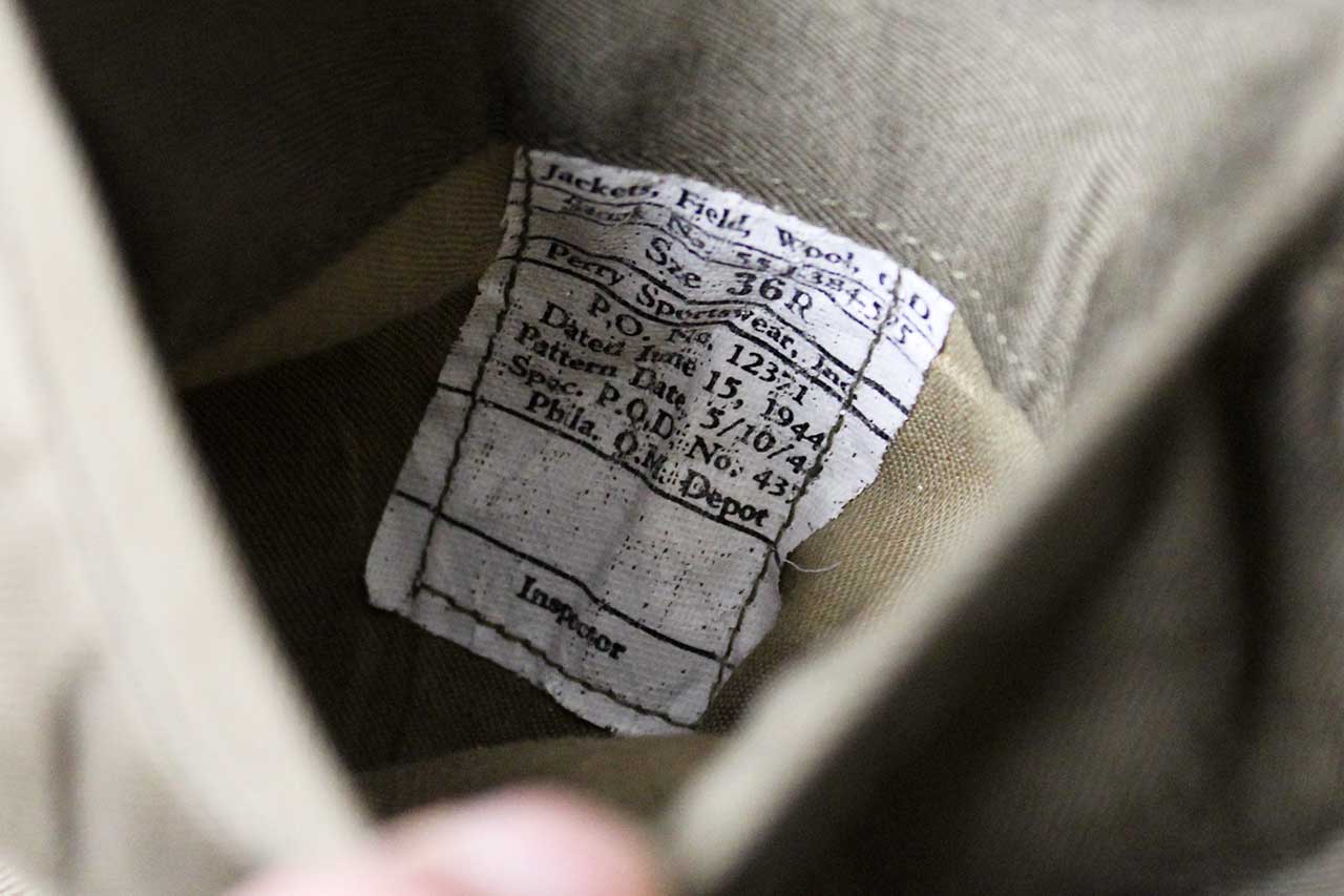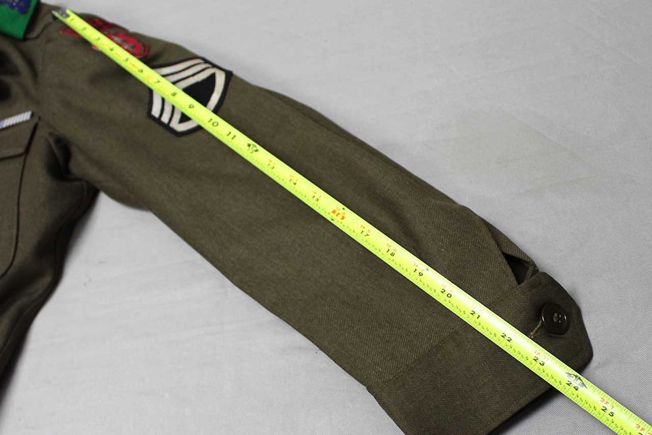 Additional Notes: The Eisenhower jacket also known as “Ike” jacket, officially listed as the Jacket, Field, Wool, Olive Drab, is a type of waist length jacket developed for the US. Army during the later stages of WW2 and named after Dwight Eisenhower. Intended to be worn on its own or as an insulating layer beneath the M-1943 Field Jacket and over the standard wool flannel shirt and wool sweater, it featured a pleated back, adjustable waist band, fly front buttons, bellows chest pockets, slash side pockets, and shoulder straps.