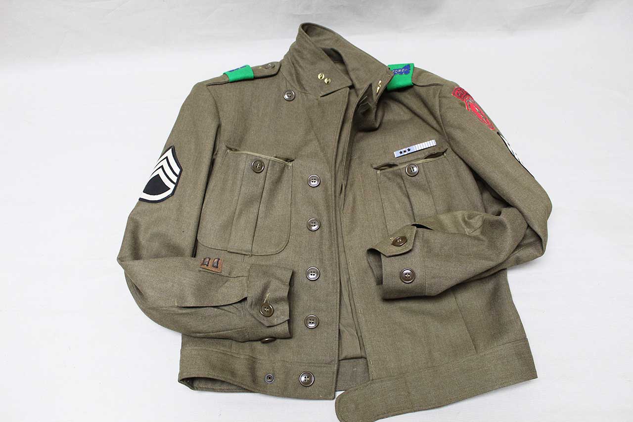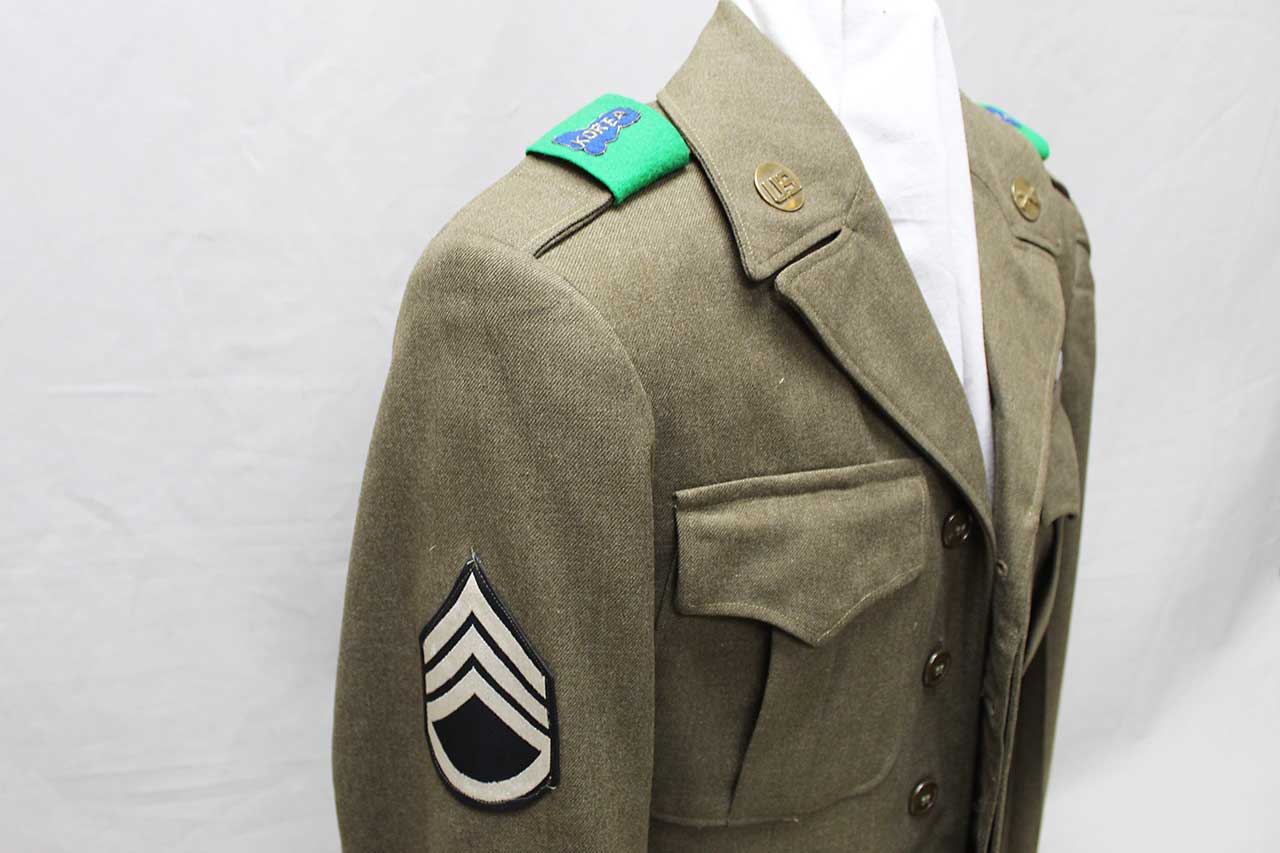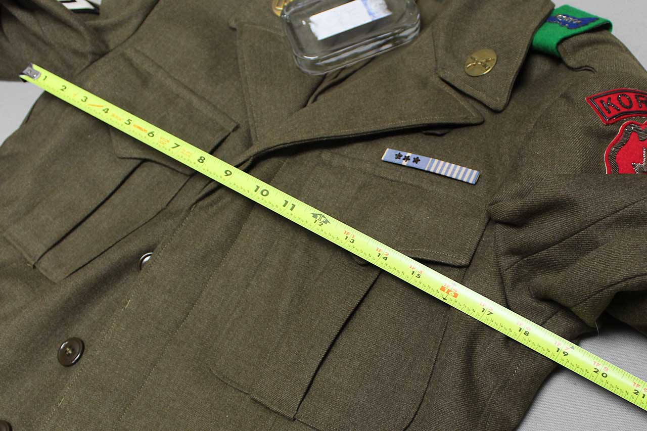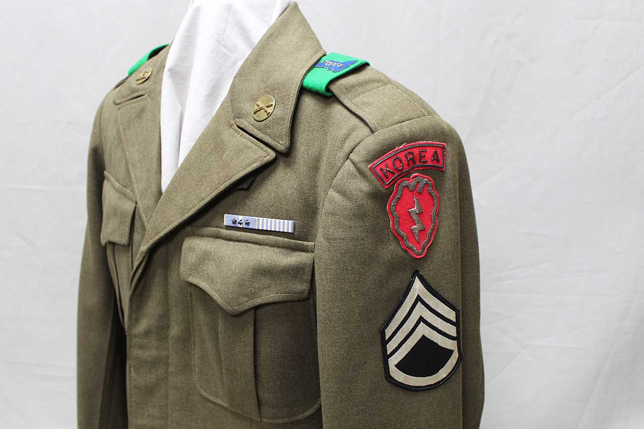 United States Army Field “Ike” Jacket. Wool O.D. Jacket. Has very nice 25th Division bullion shoulder sleeve insignia (patch) on one sleeve with bullion “Korea” tab above. Also, has Staff Sergeant cloth sleeve rank insignia on each sleeve. Has Infantry and U.S. collar disks and 2 place ribbon bar above pocket. Also, has bullion “Korea” green cloth insignia on shoulder straps. Uniform has two bullion overseas stripes on lower sleeve. Each stripe represents 6 months service in a combat zone. These 2 stripes would represent 1 year of service in a combat zone, Quarter Master (QM) size tag marked 36R and pattern 1944. 1950s Korea era jacket. Overall, nice condition with interesting bullion insignia.