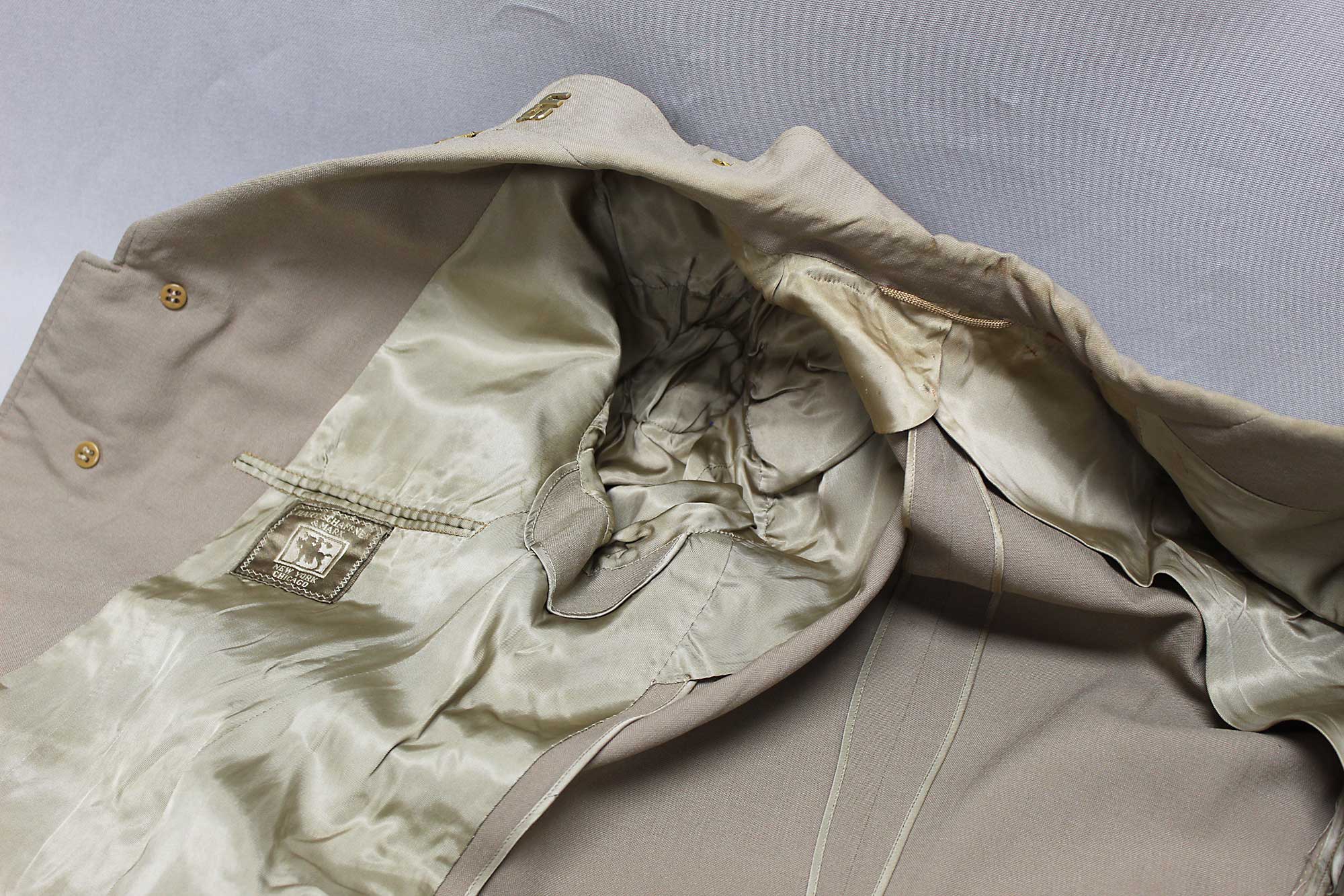 United States WW2 IX (9th) Corps Tropical Army Officer (Captain) Khaki Service Tunic. Uniform has army officer Infantry (crossed rifles) insignia on collar area, and “U.S.” officer collar insignia as well. Captain metal rank insignia on shoulder strap area. Upper sleeve has XI (9th) Corps shoulder sleeve insignia (patch). Also, has three (3) bullion overseas war (combat) service bars (1 1/2 years war service) on the one lower sleeve. Private purchase Tailor tag on interior: Hart, Scheaffer, and Marx New York Chicago. Also, has interior laundry number marks as well. Overall, good condition for age.