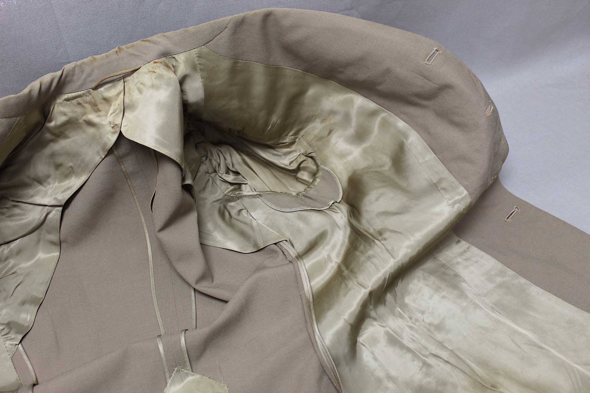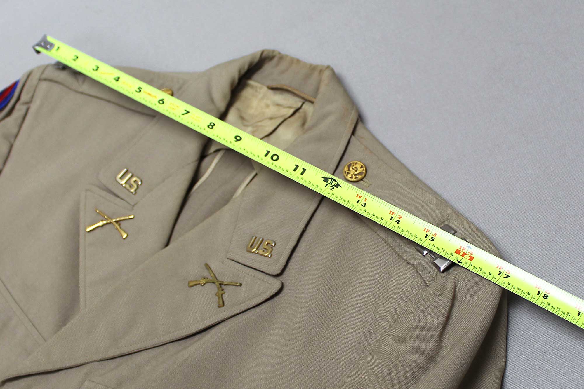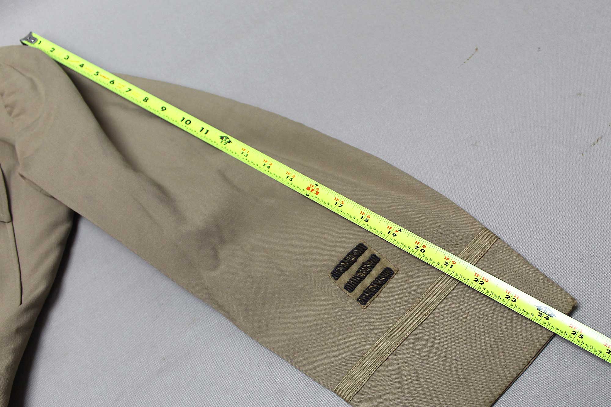 Additional Notes: The United States (U.S.) Army basic service uniforms consisted of a winter service uniform of olive drab (OD) wool worn in temperate weather, and a summer service uniform of khaki (a shade of tan) cotton fabric worn in tropical weather. In addition to the basic service uniforms, there were also a variety of fatigue and combat uniforms utilized as well. During ww2 era, summer and winter service uniforms were worn during their respective seasons while on duty within the United States. During wartime deployment, the European Theater of Operations was considered a year-round temperate zone and the Pacific Theater of Operations a year-round tropical uniform zone. In the Mediterranean Theater of Operations, U.S. soldiers wore both seasonal uniforms.