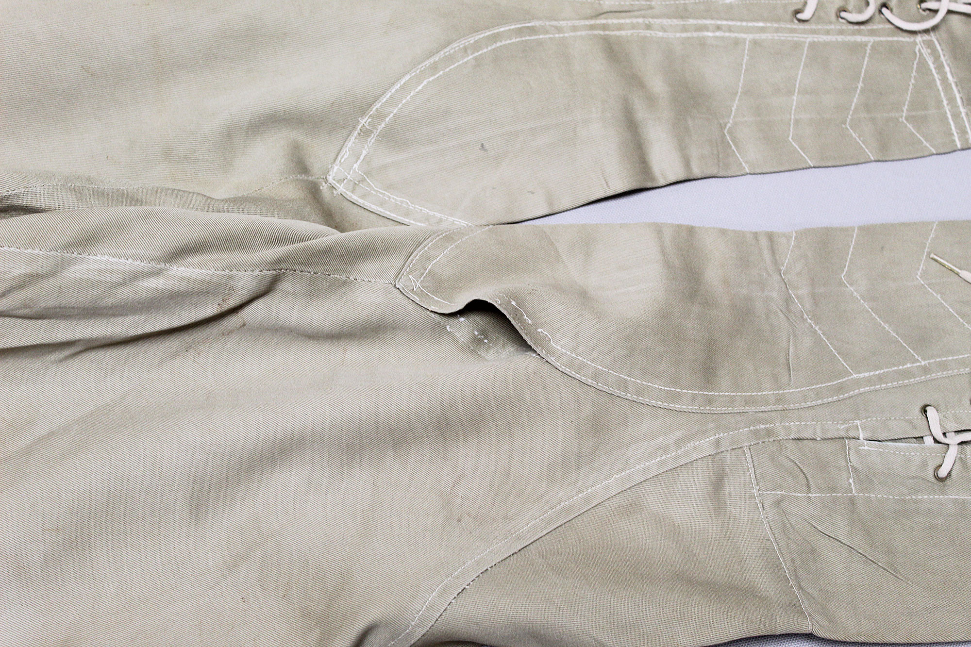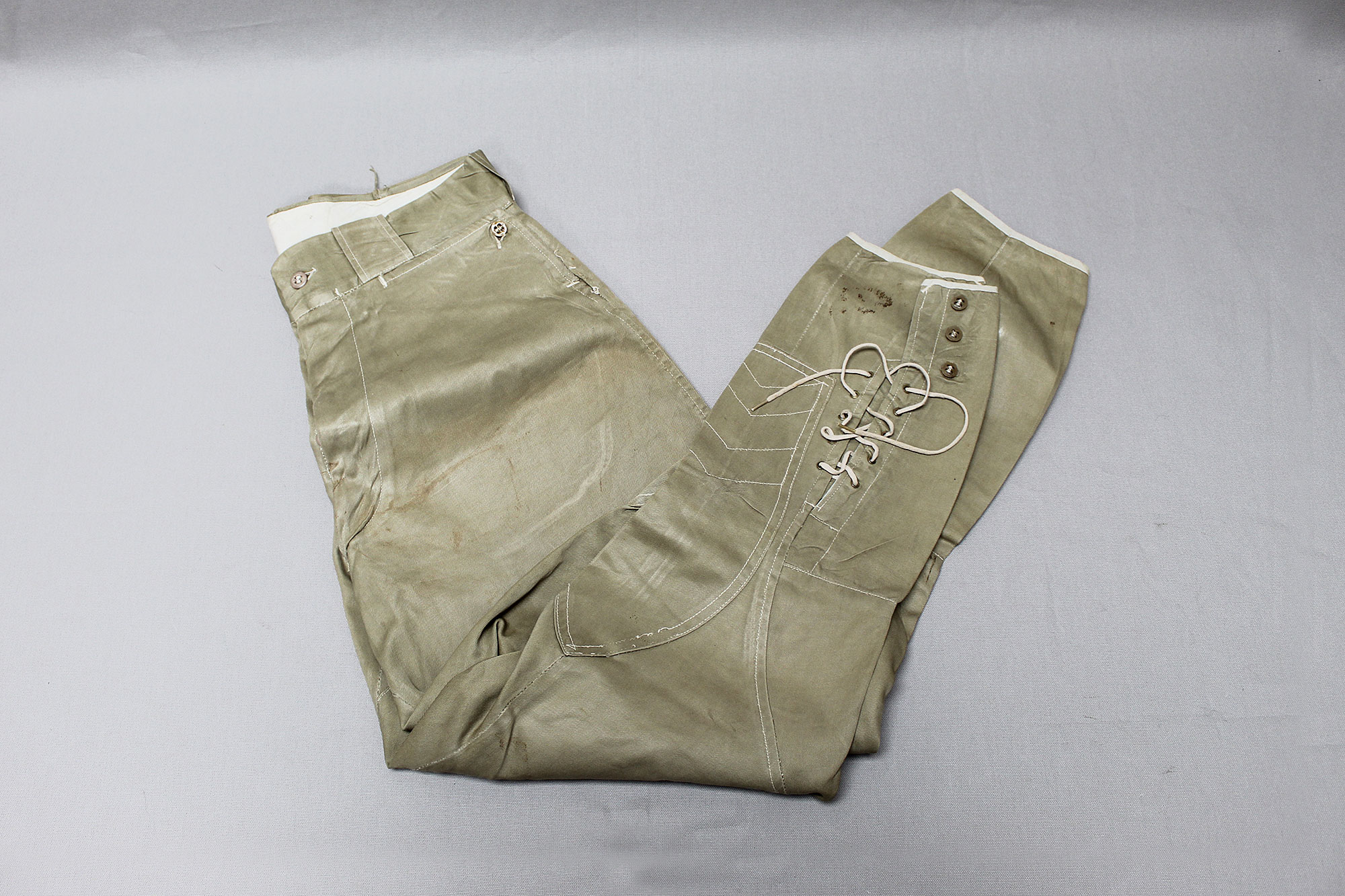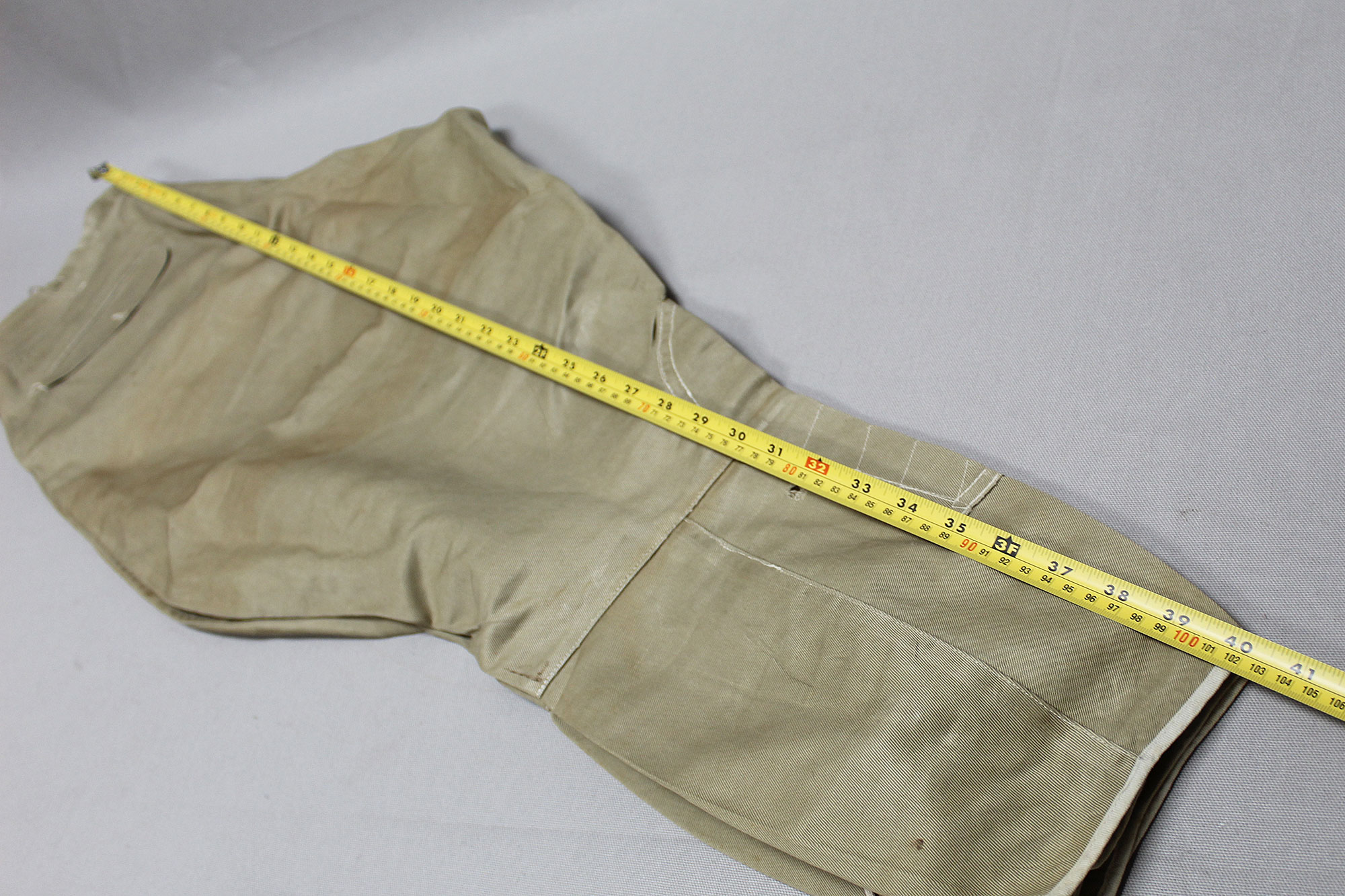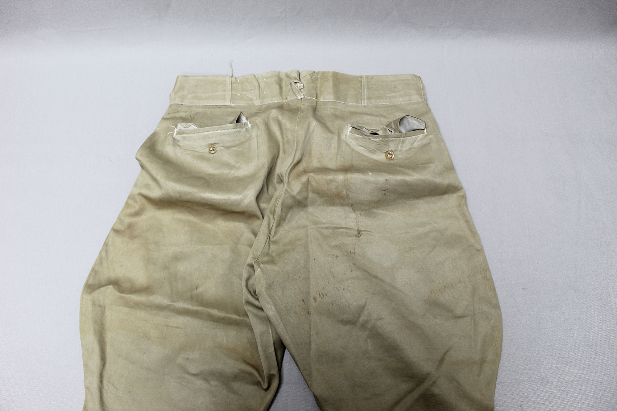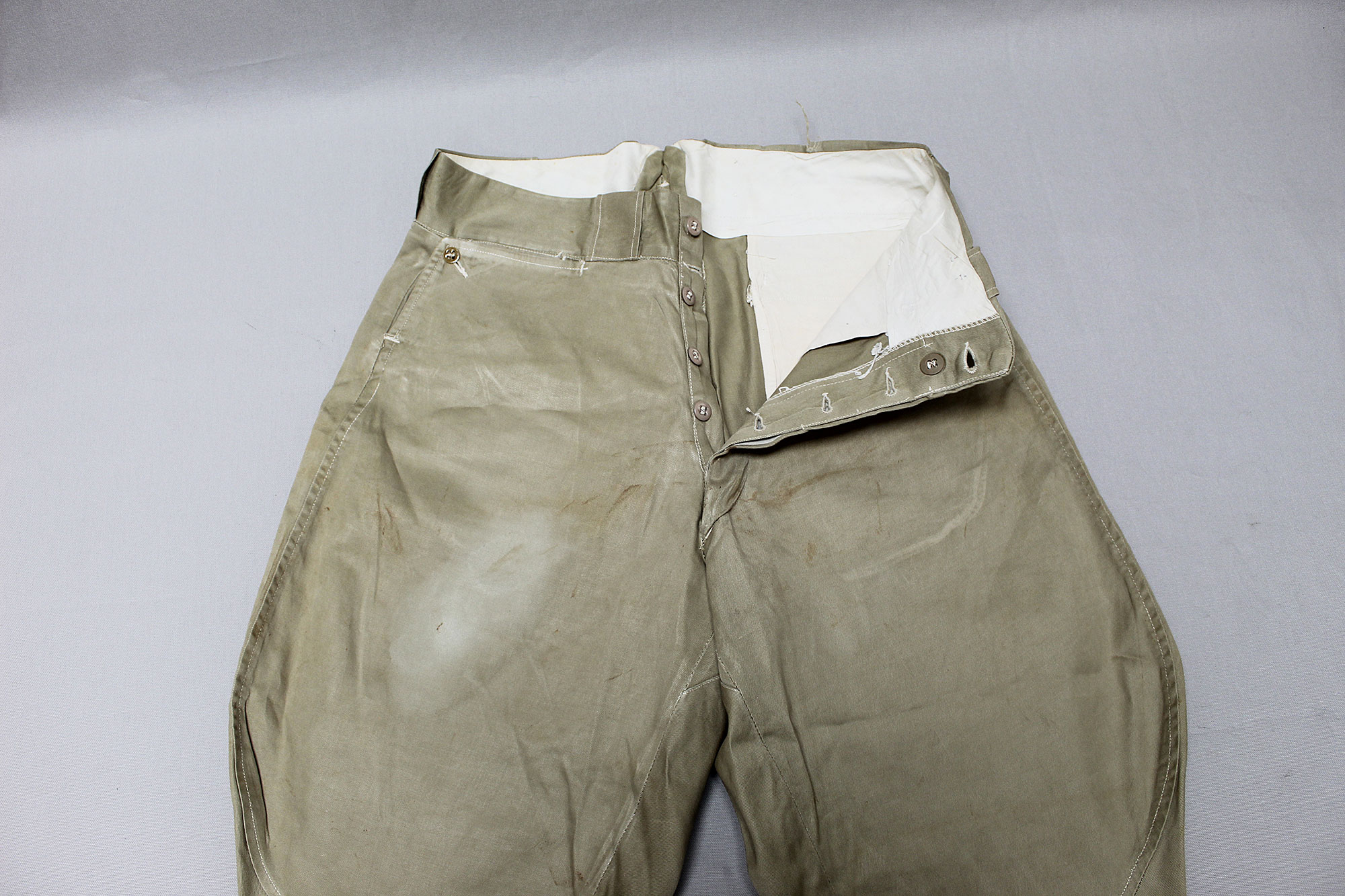 United States (U.S.) Army Officer Trousers. Riding-style pants for a Cavalry or Armored Officer. Button fly front. Appears to have military laundry marks on interior and inked in initials. No size tag I could find, however, waist appears to be about 15 1/2 inches across (31 inch waist), Inseam appears to be about 26 1/2 inches, and overall length about 40 inches. I believe this is 1930s-1940s (WW2) era. Very worn and used condition with some staining, and snags/holes.