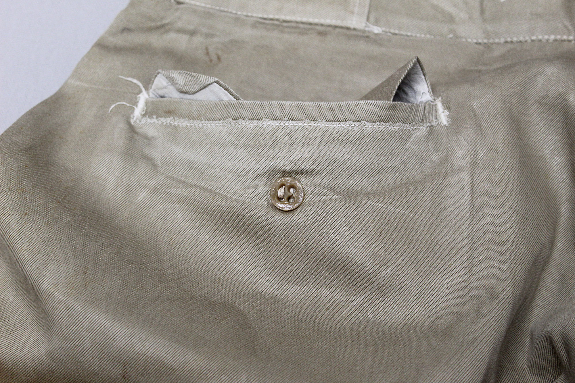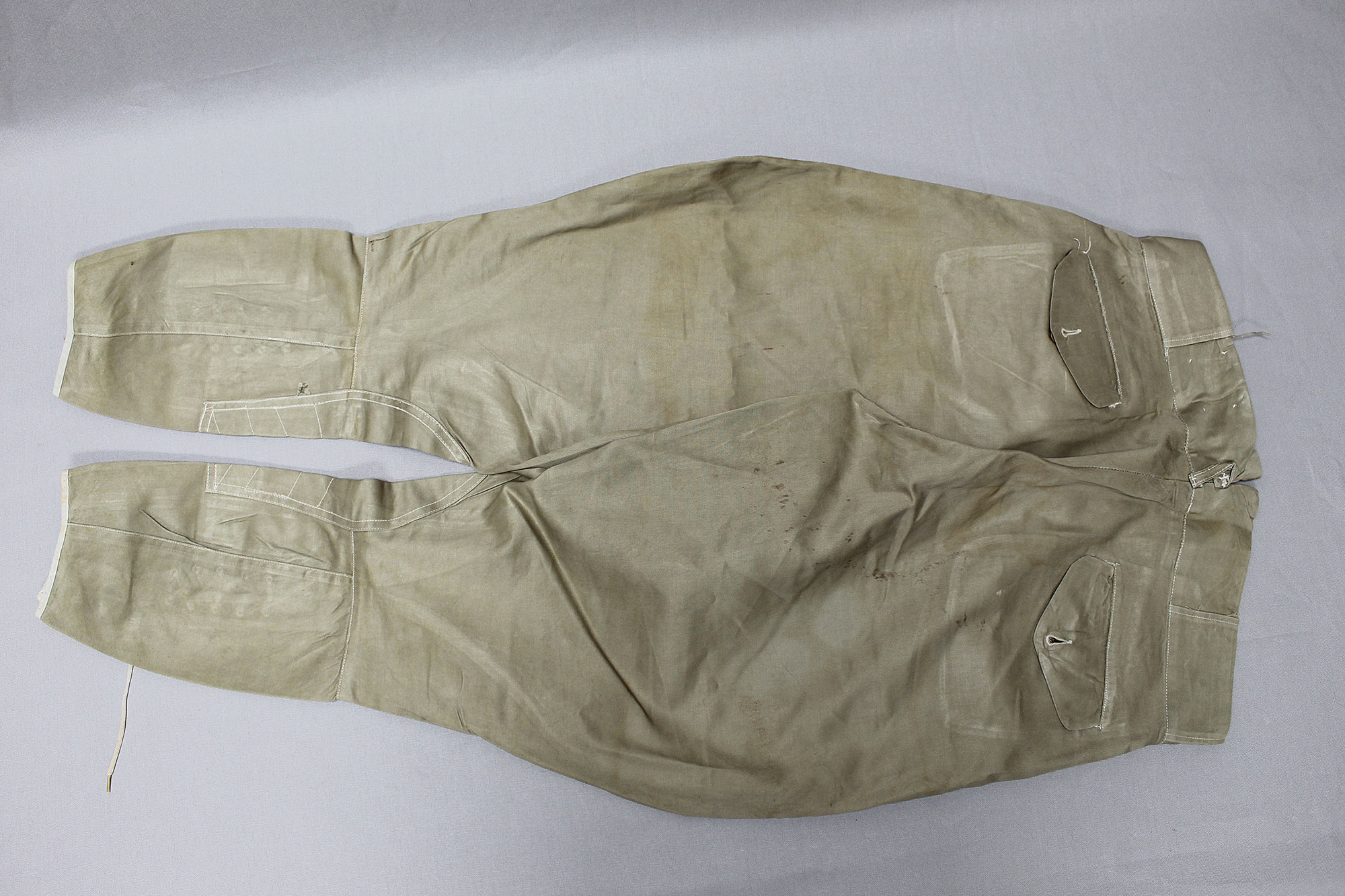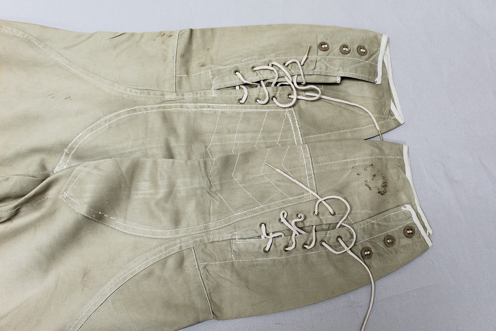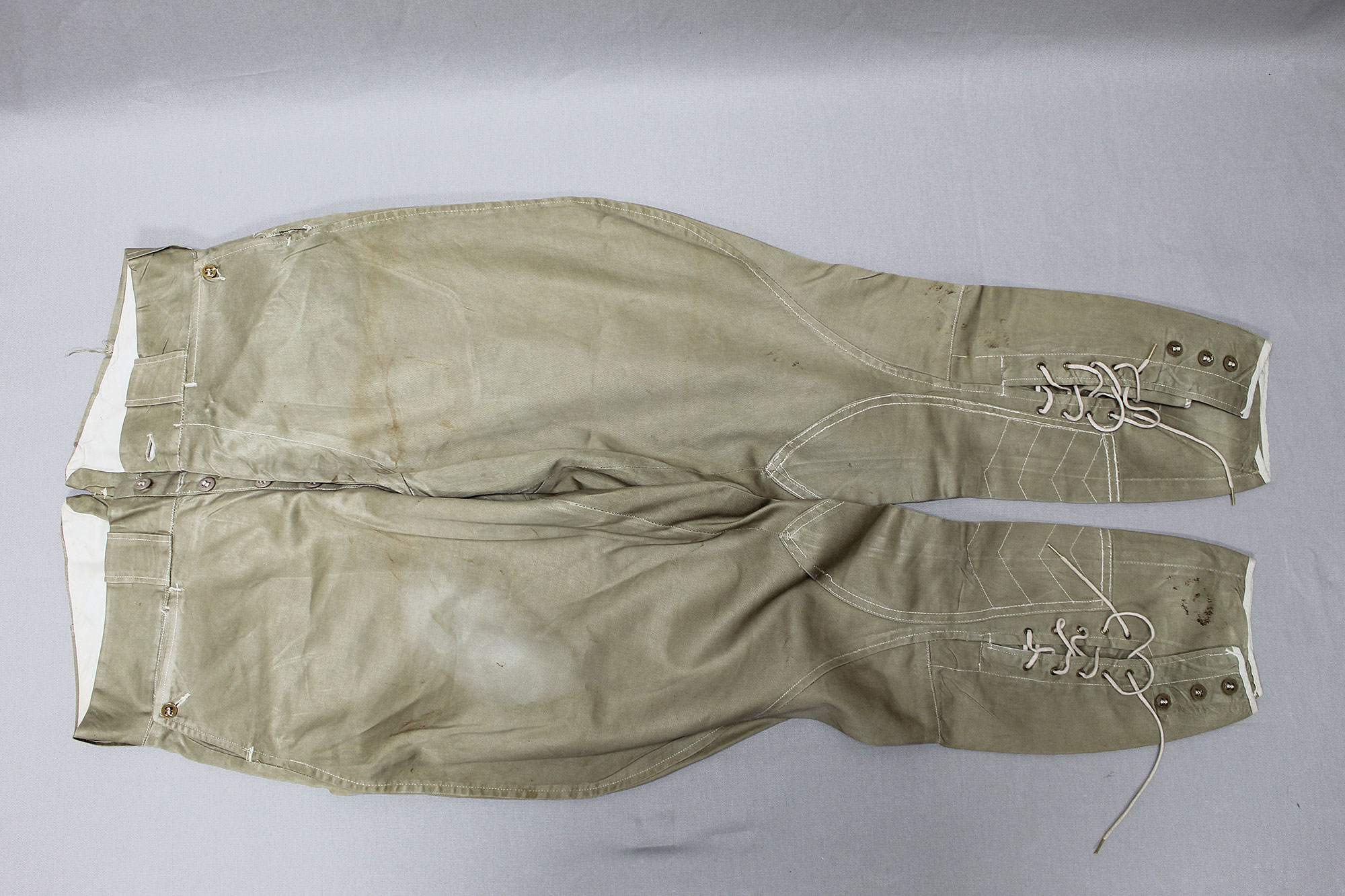 United States (U.S.) Army Officer Trousers. Riding-style pants for a Cavalry or Armored Officer. Button fly front. Appears to have military laundry marks on interior and inked in initials. No size tag I could find, however, waist appears to be about 15 1/2 inches across (31 inch waist), Inseam appears to be about 26 1/2 inches, and overall length about 40 inches. I believe this is 1930s-1940s (WW2) era. Very worn and used condition with some staining, and snags/holes.