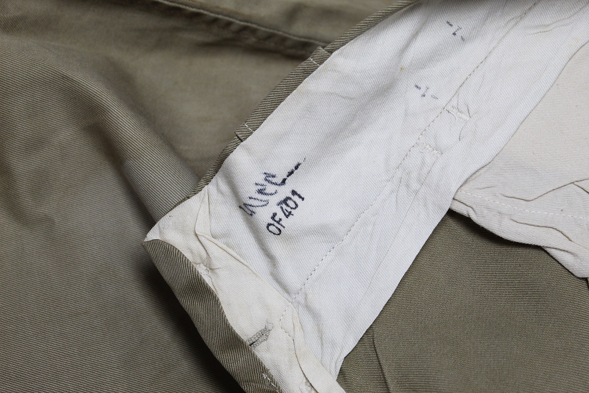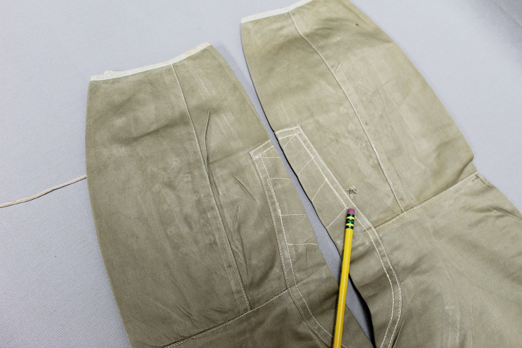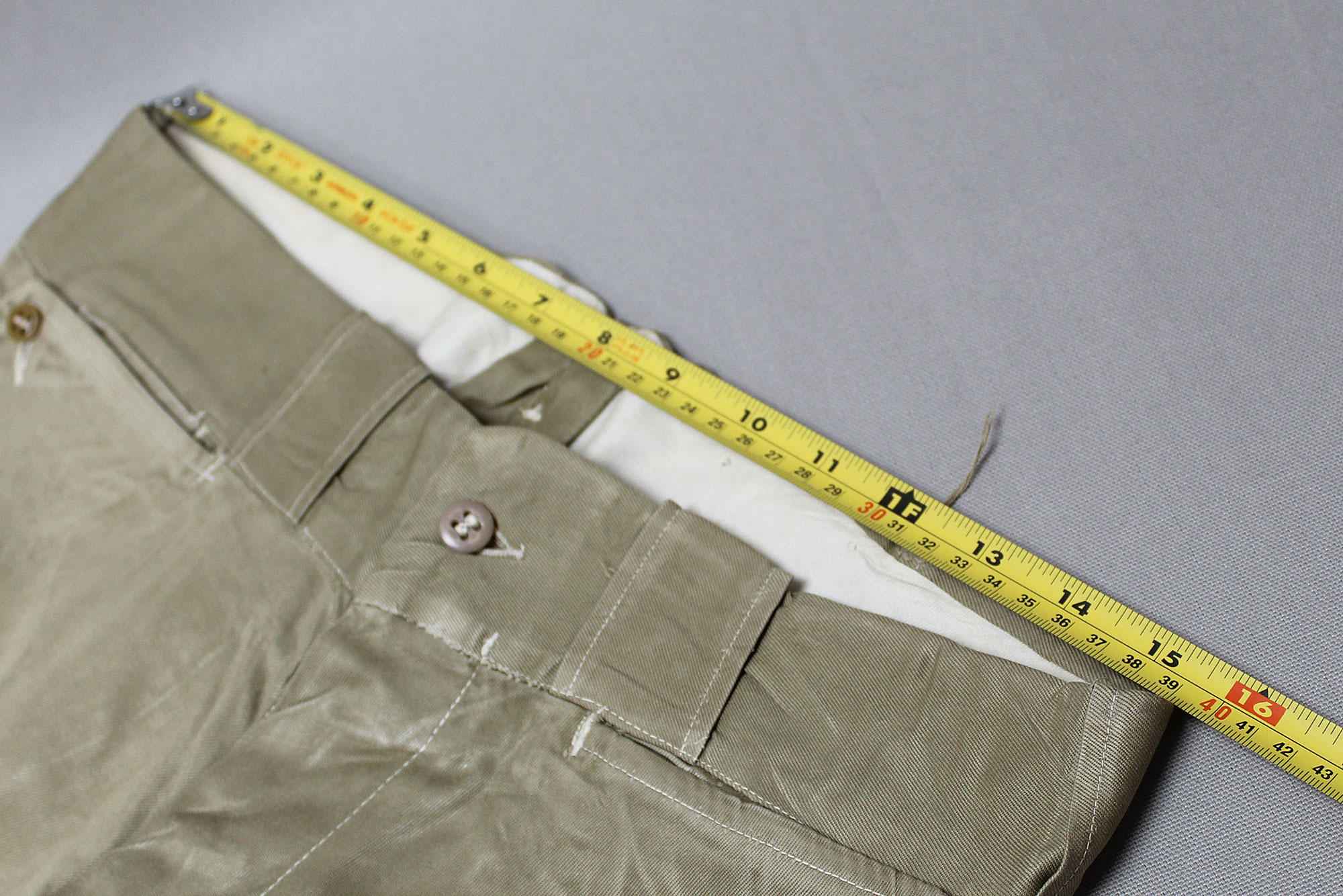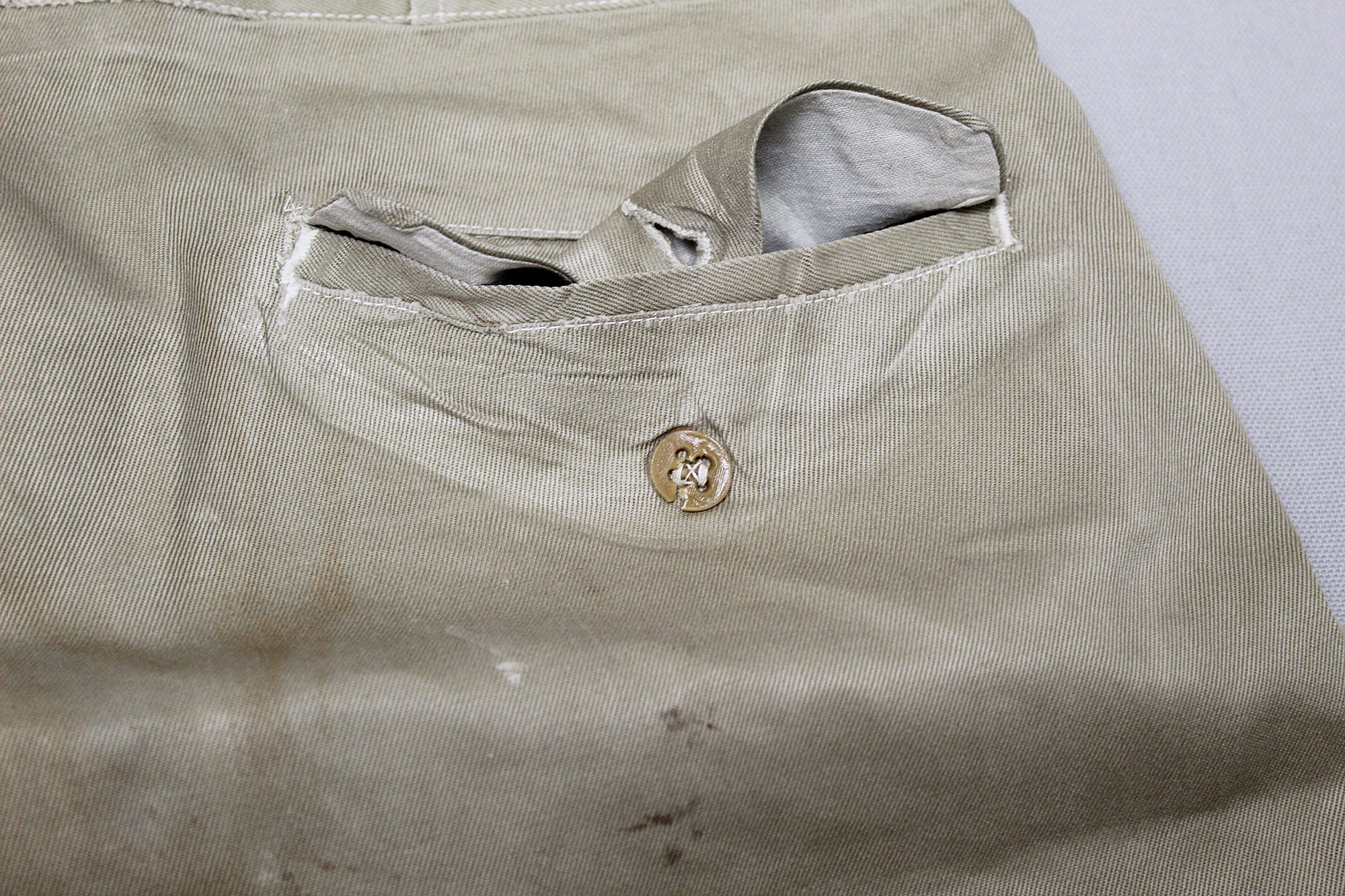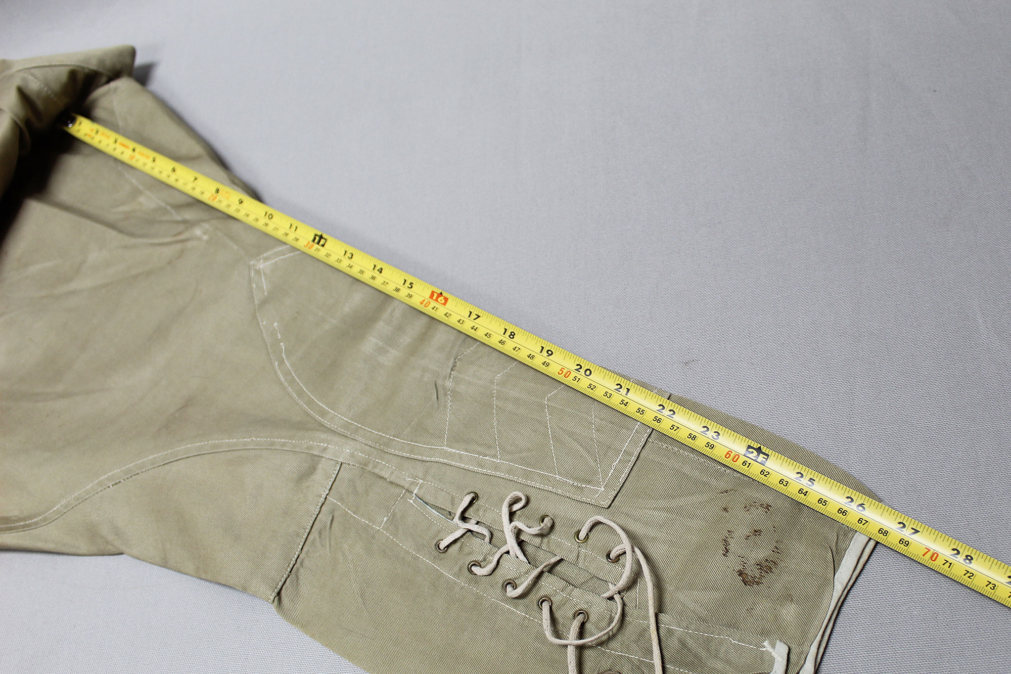 United States (U.S.) Army Officer Trousers. Riding-style pants for a Cavalry or Armored Officer. Button fly front. Appears to have military laundry marks on interior and inked in initials. No size tag I could find, however, waist appears to be about 15 1/2 inches across (31 inch waist), Inseam appears to be about 26 1/2 inches, and overall length about 40 inches. I believe this is 1930s-1940s (WW2) era. Very worn and used condition with some staining, and snags/holes.