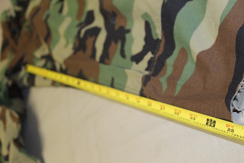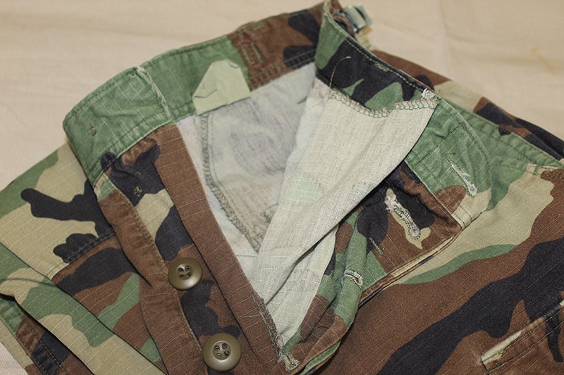 U.S. Army hot weather woodland camo trousers. Bottoms appear to be cut. Tags mostly washed out, however, it appears to state size Small Regular and waist 27 to 31 in. Also, appears to be missing the top two buttons on the fly area. Length from top of waist to bottom of pants approx 35″.