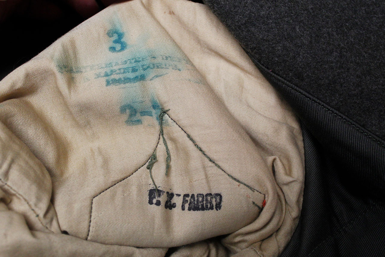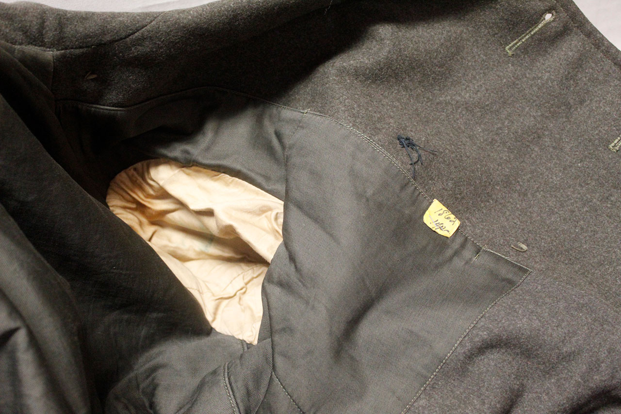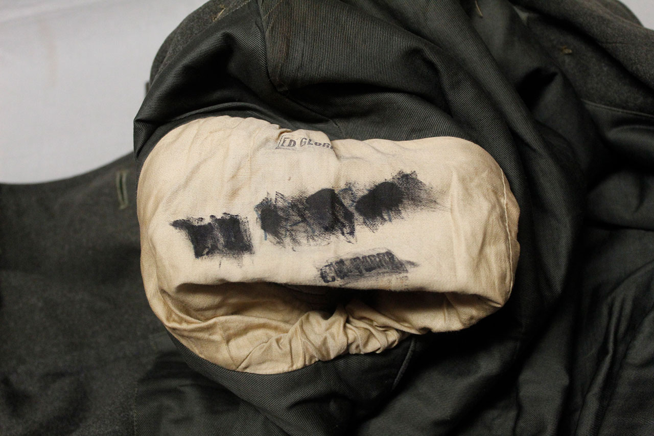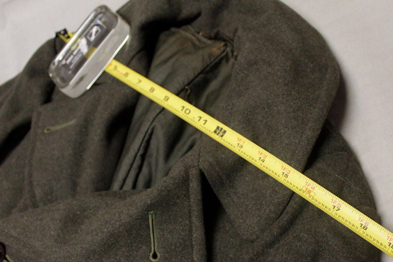 USMC WW2 Winter Wool Overcoat. Size marked 3 and 2-L and contract marked (hard to make out) in standard shoulder sleeve area along with a naming. Also, has a different naming (D. GLORIA) in other shoulder sleeve area (has a lot of other info in that sleeve shoulder area crossed/blacked out). Has cloth rank shoulder sleeve insignia on each sleeve. One front button (upper button) is replaced and does not match the other buttons on the front of the overcoat (a little more domed button which is a later button post-ww2). Worn and used condition.