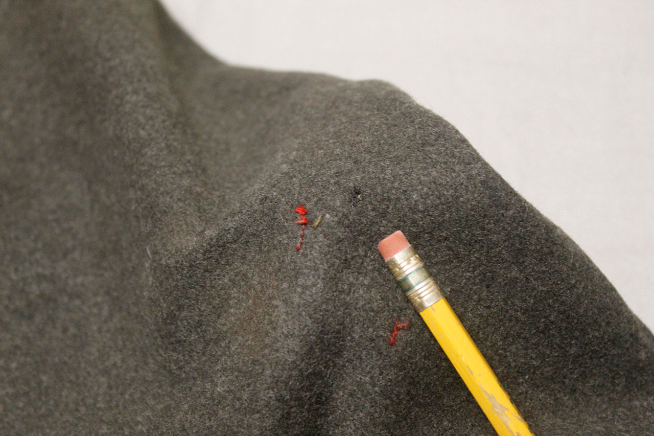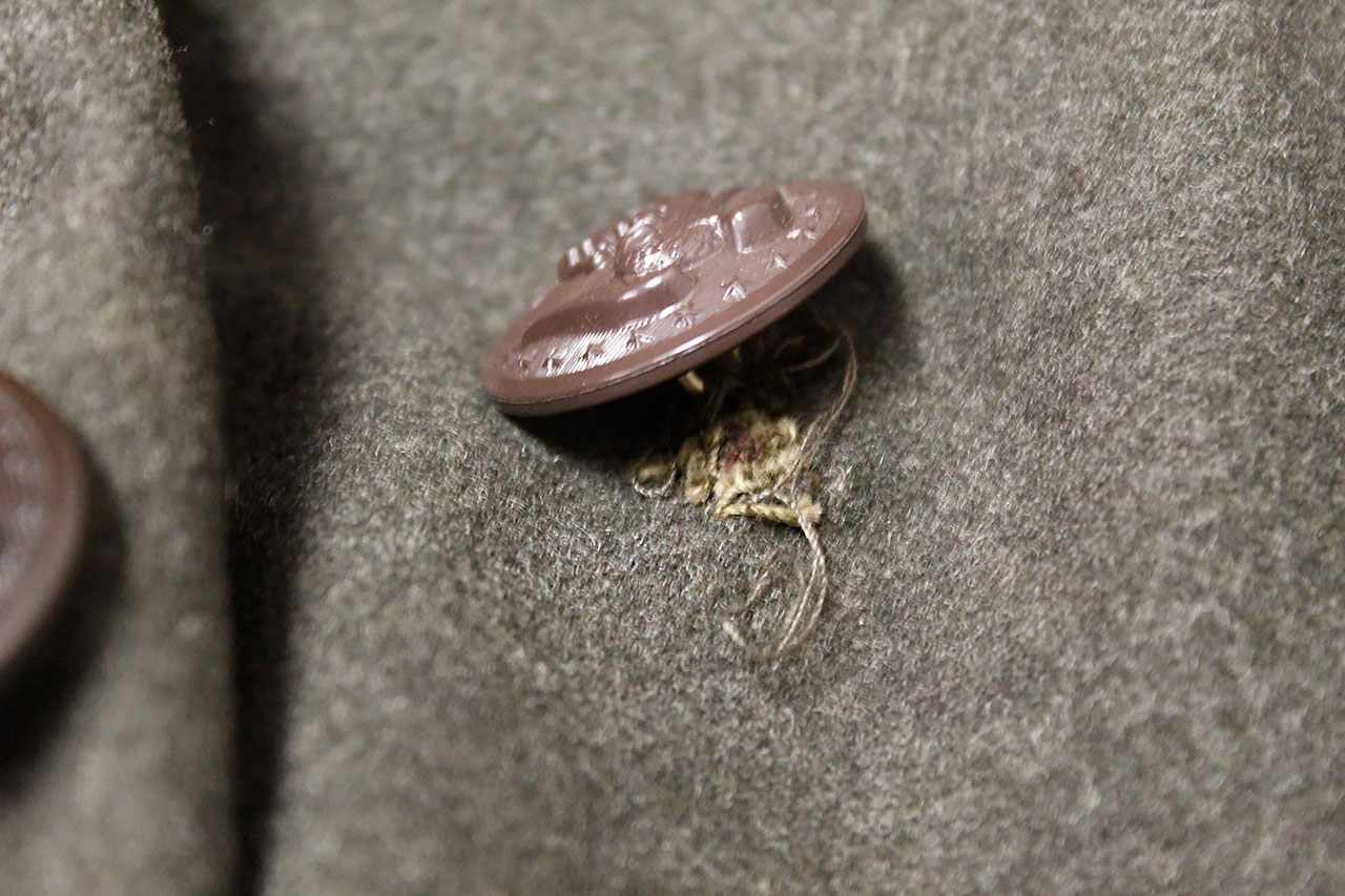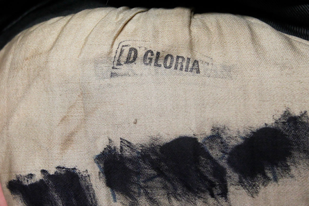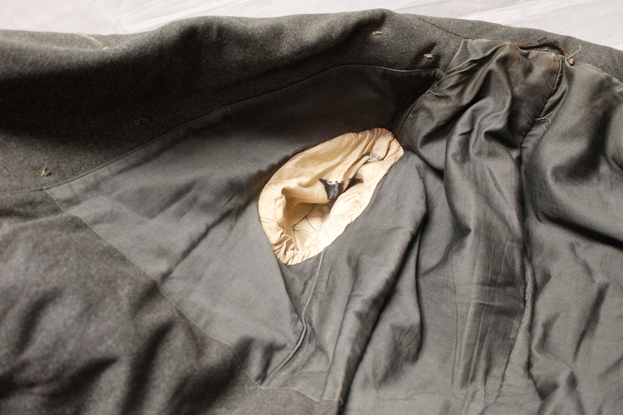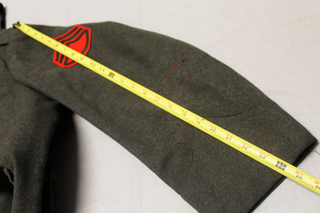 USMC WW2 Winter Wool Overcoat. Size marked 3 and 2-L and contract marked (hard to make out) in standard shoulder sleeve area along with a naming. Also, has a different naming (D. GLORIA) in other shoulder sleeve area (has a lot of other info in that sleeve shoulder area crossed/blacked out). Has cloth rank shoulder sleeve insignia on each sleeve. One front button (upper button) is replaced and does not match the other buttons on the front of the overcoat (a little more domed button which is a later button post-ww2). Worn and used condition.