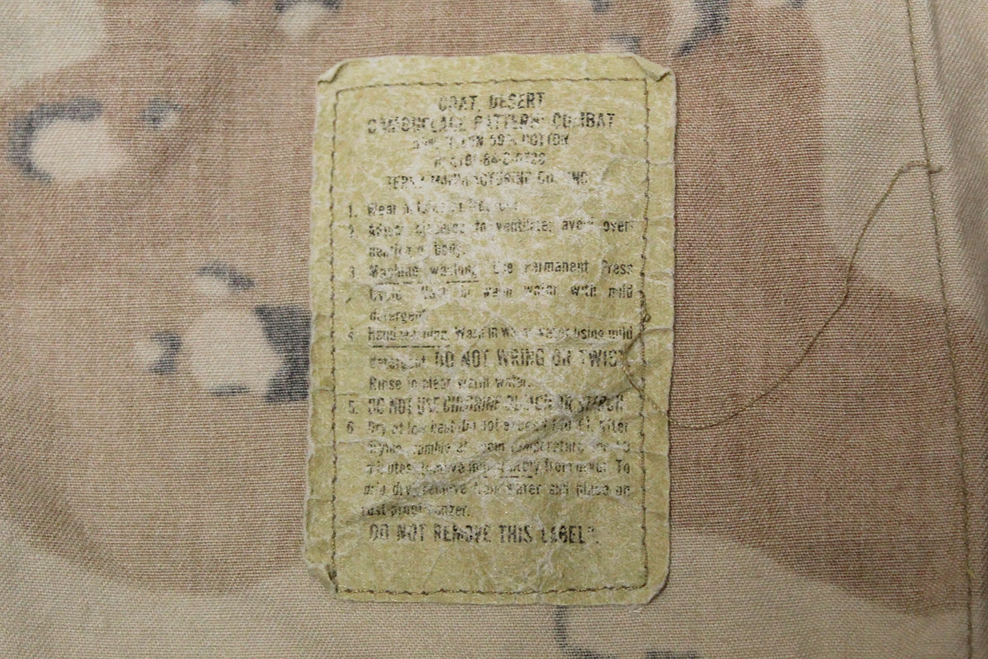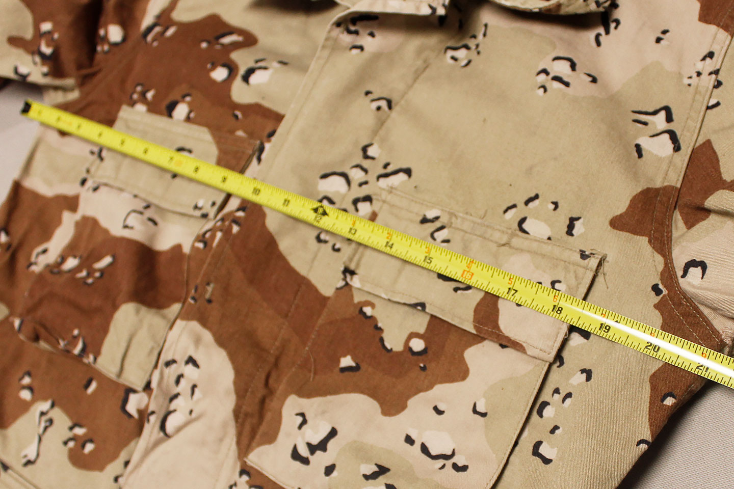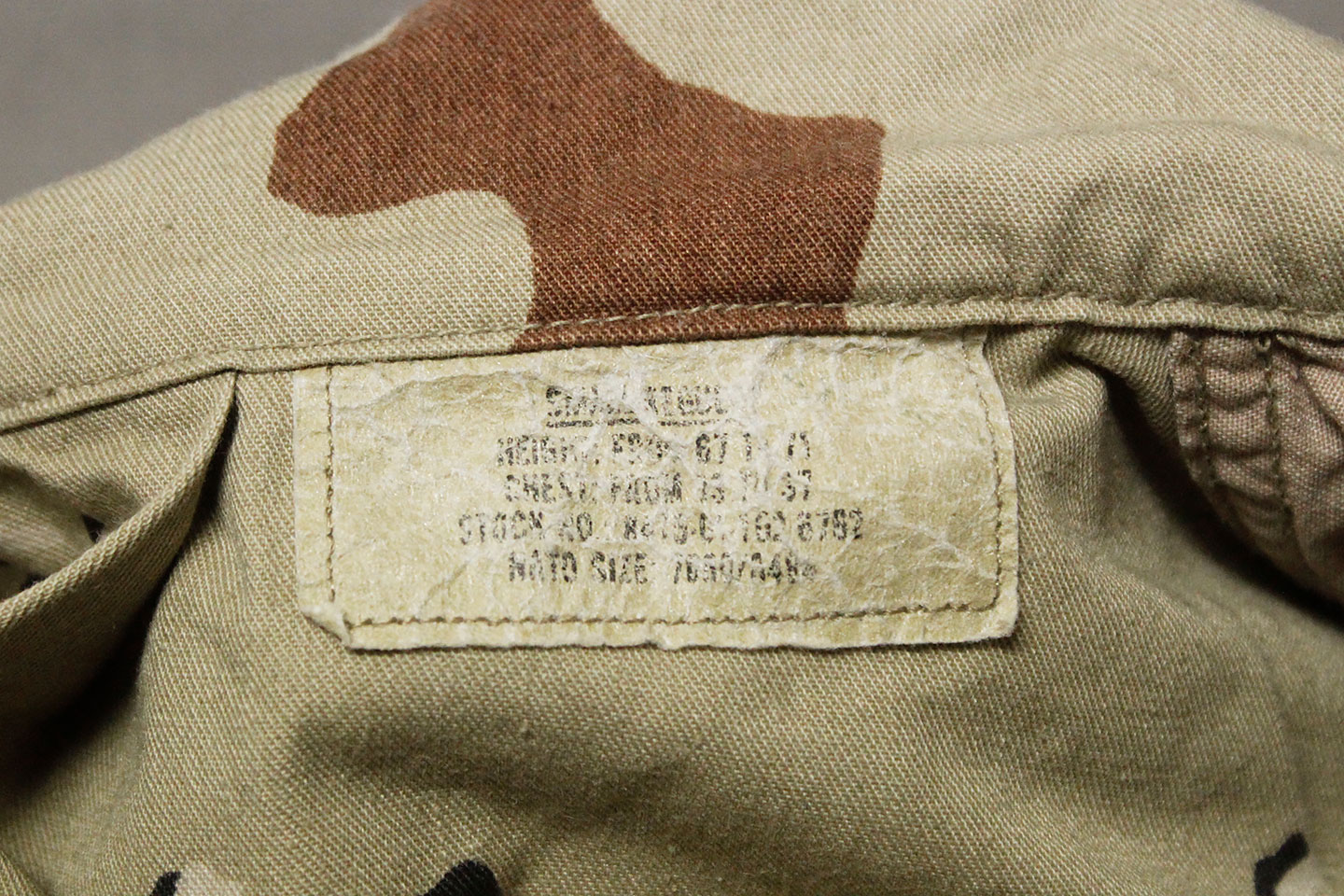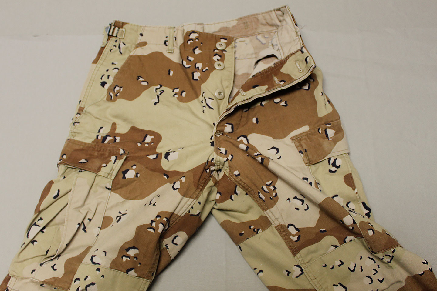 U.S. Army 1980s “Chocolate Chip” combat jacket and pants. Six Color Desert Camouflage. Tag very faded and bit washed out and hard to make out, however, appears to be a Small size. Worn and used condition.