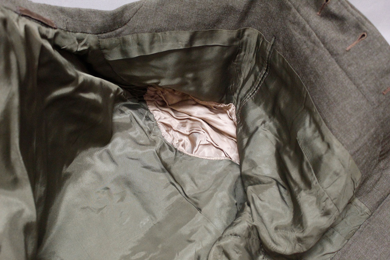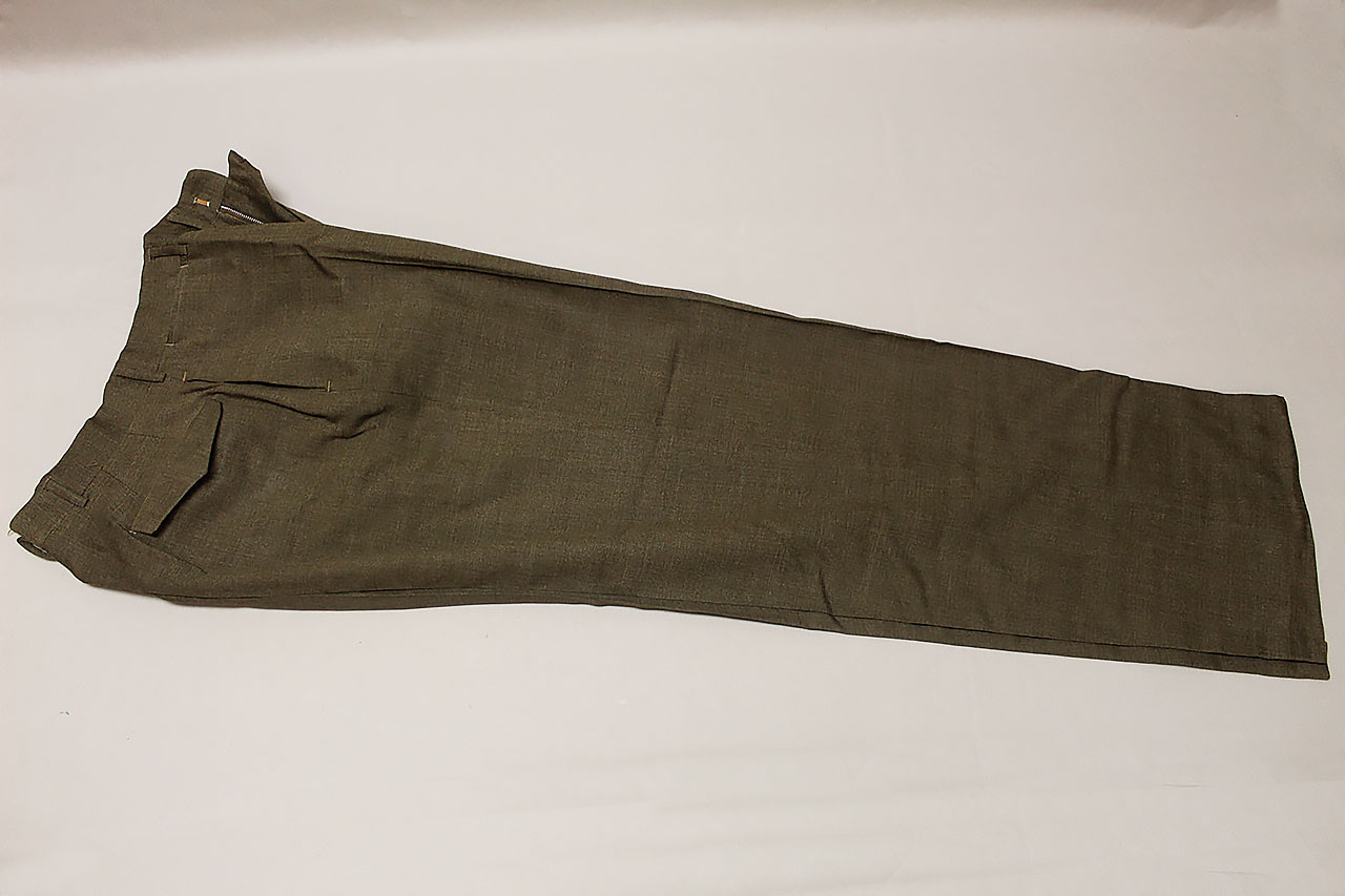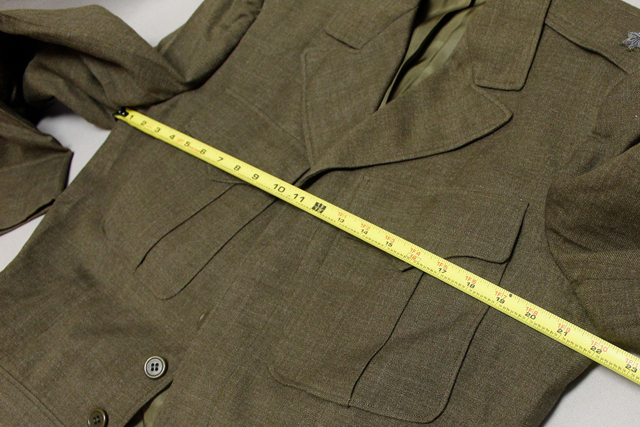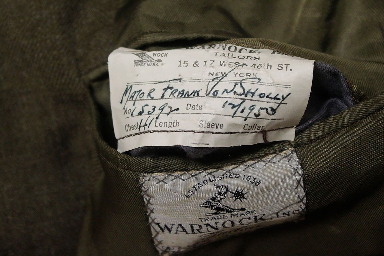 U.S. Army Officer OD Wool Field Jacket “Ike Jacket” with Pants. Nice bullion shoulder strap rank insignia on wool field jacket. Named to Major Frank Von Sholly and dated 12/1953 on tag inside jacket. Wool pants also has military laundry marks. Worn and used condition with several scattered moth nips, however, displays well overall.