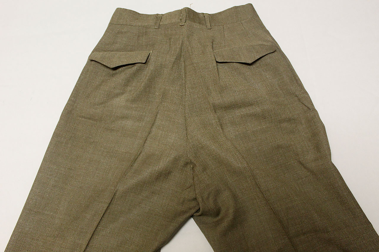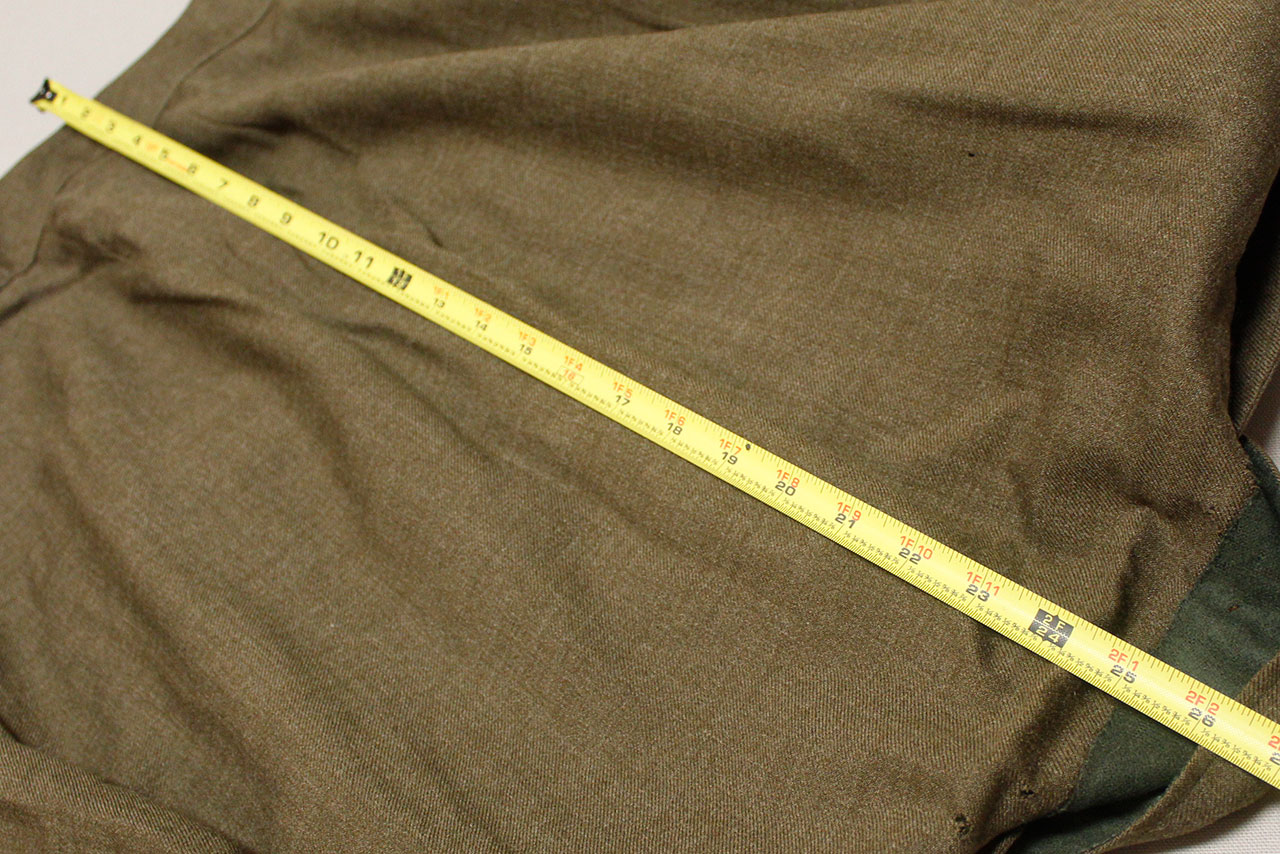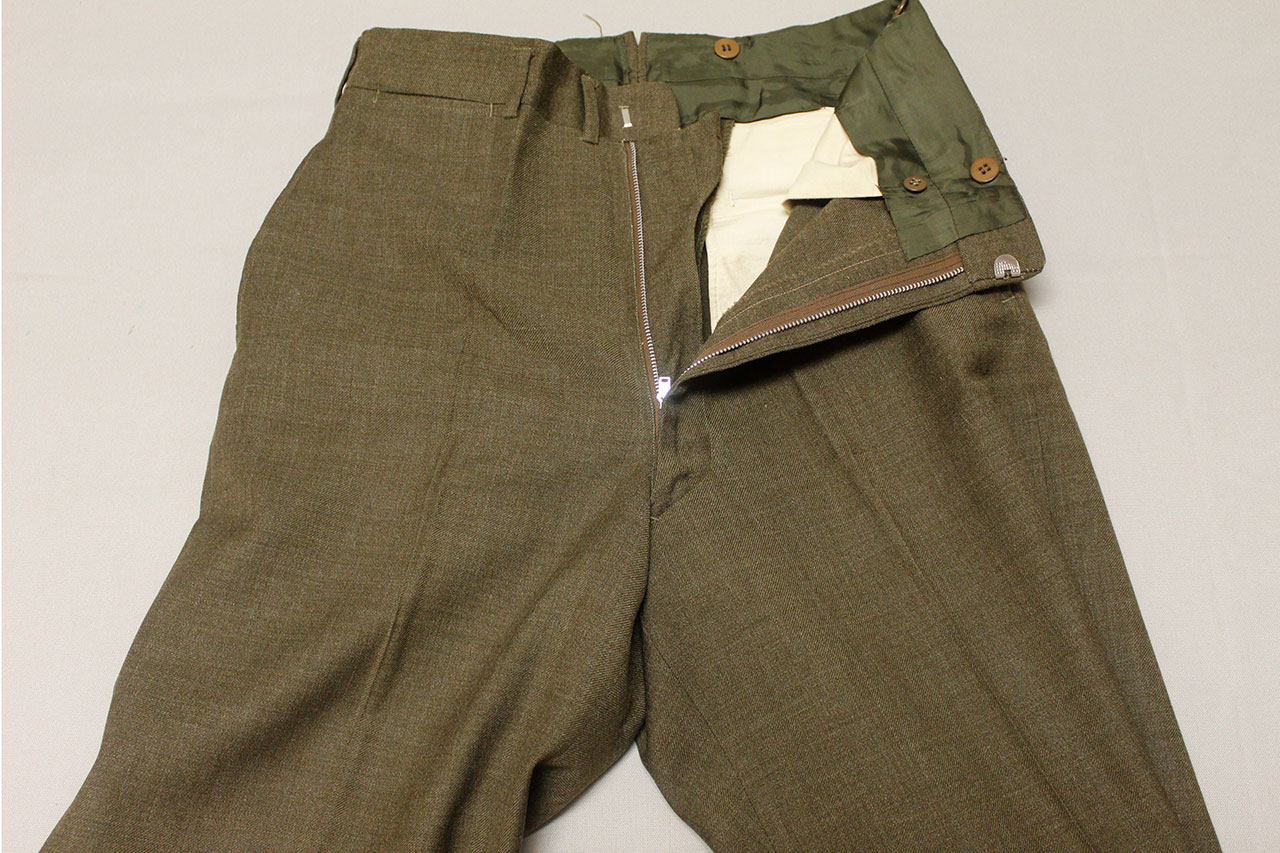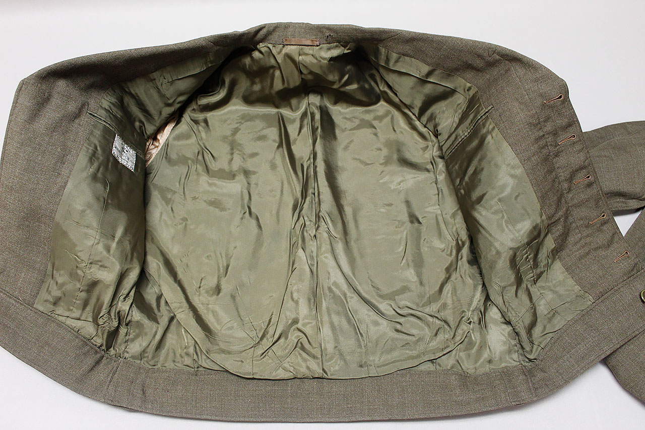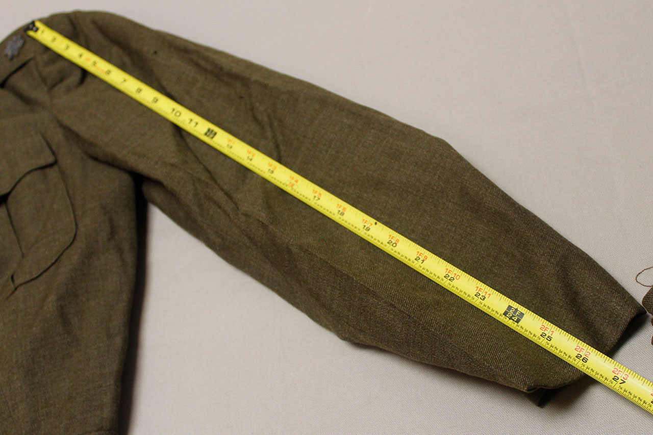 U.S. Army Officer OD Wool Field Jacket “Ike Jacket” with Pants. Nice bullion shoulder strap rank insignia on wool field jacket. Named to Major Frank Von Sholly and dated 12/1953 on tag inside jacket. Wool pants also has military laundry marks. Worn and used condition with several scattered moth nips, however, displays well overall.