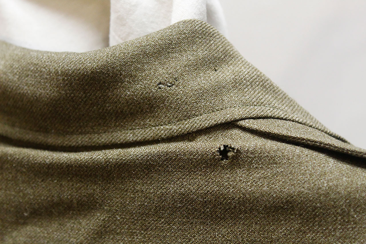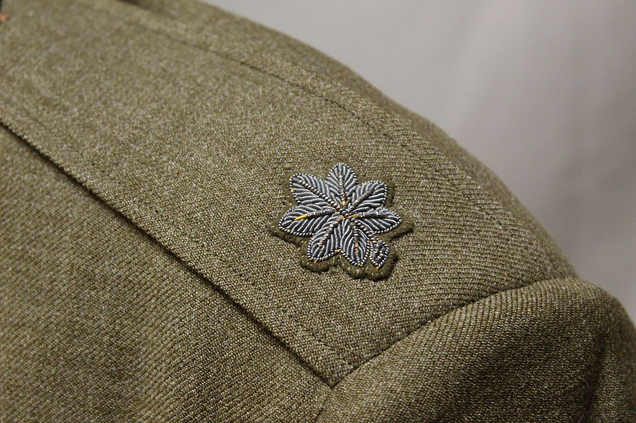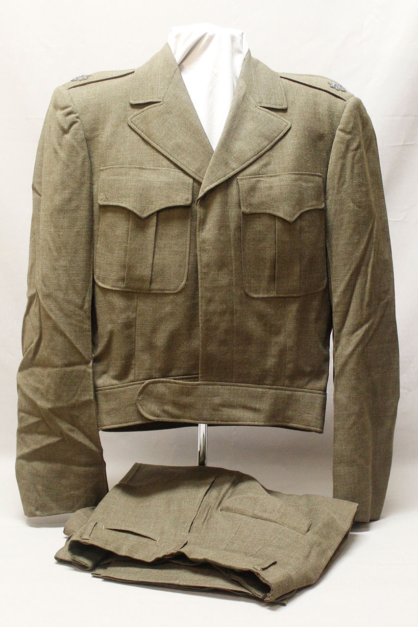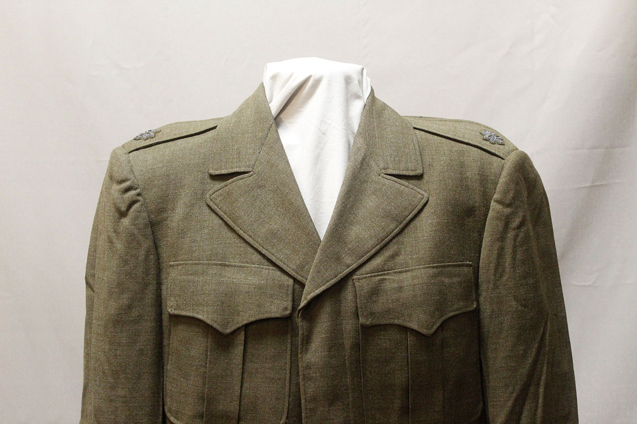 U.S. Army Officer OD Wool Field Jacket “Ike Jacket” with Pants. Nice bullion shoulder strap rank insignia on wool field jacket. Named to Major Frank Von Sholly and dated 12/1953 on tag inside jacket. Wool pants also has military laundry marks. Worn and used condition with several scattered moth nips, however, displays well overall.