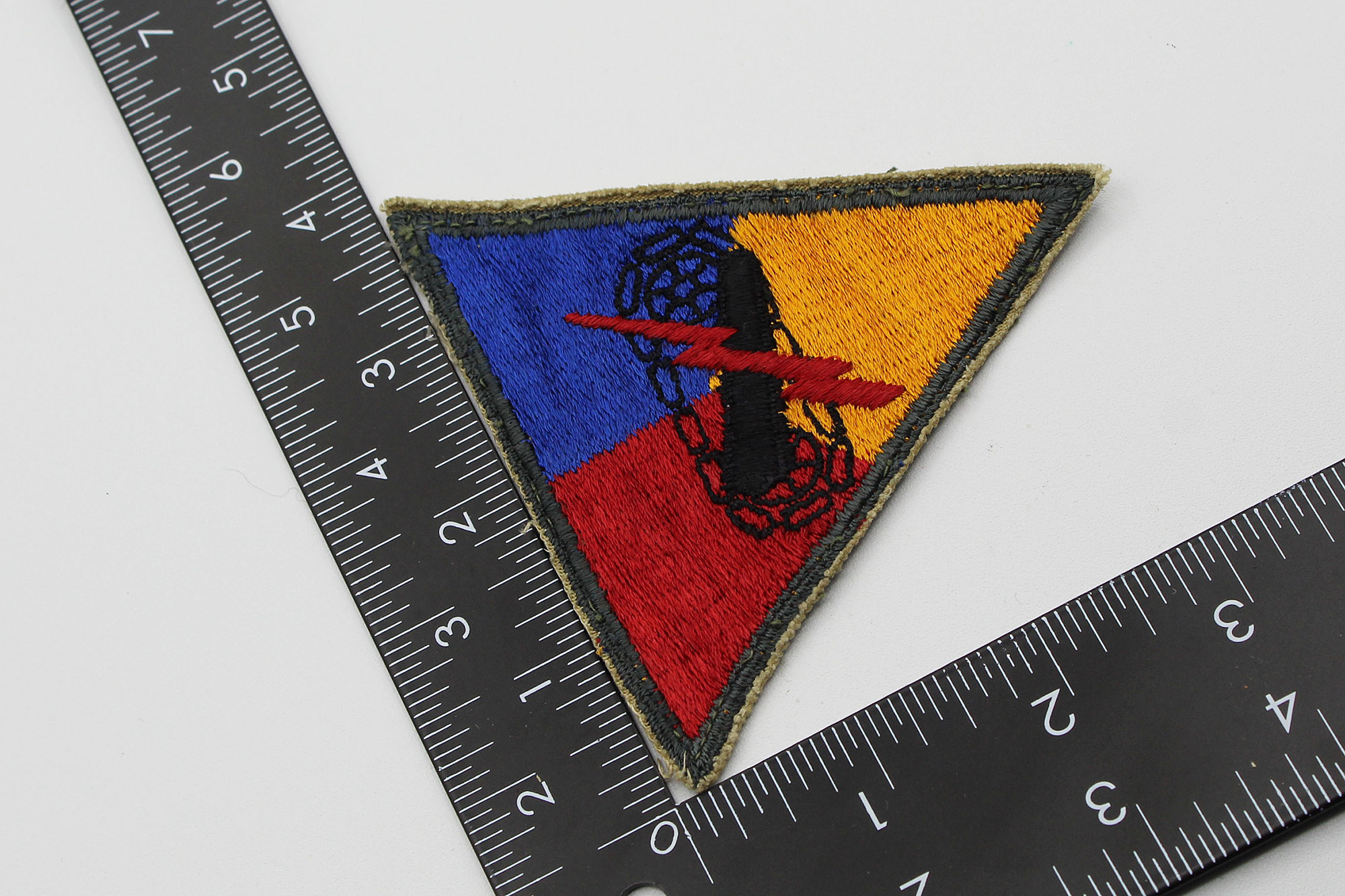 United States Army Armored Forces Shoulder Sleeve Insignia (Patch). The patch is fully embroidered with a snowy back. Most likely 1940s (WW2) era. The patch does not react to UV light (does not glow under blacklight). Worn condition.