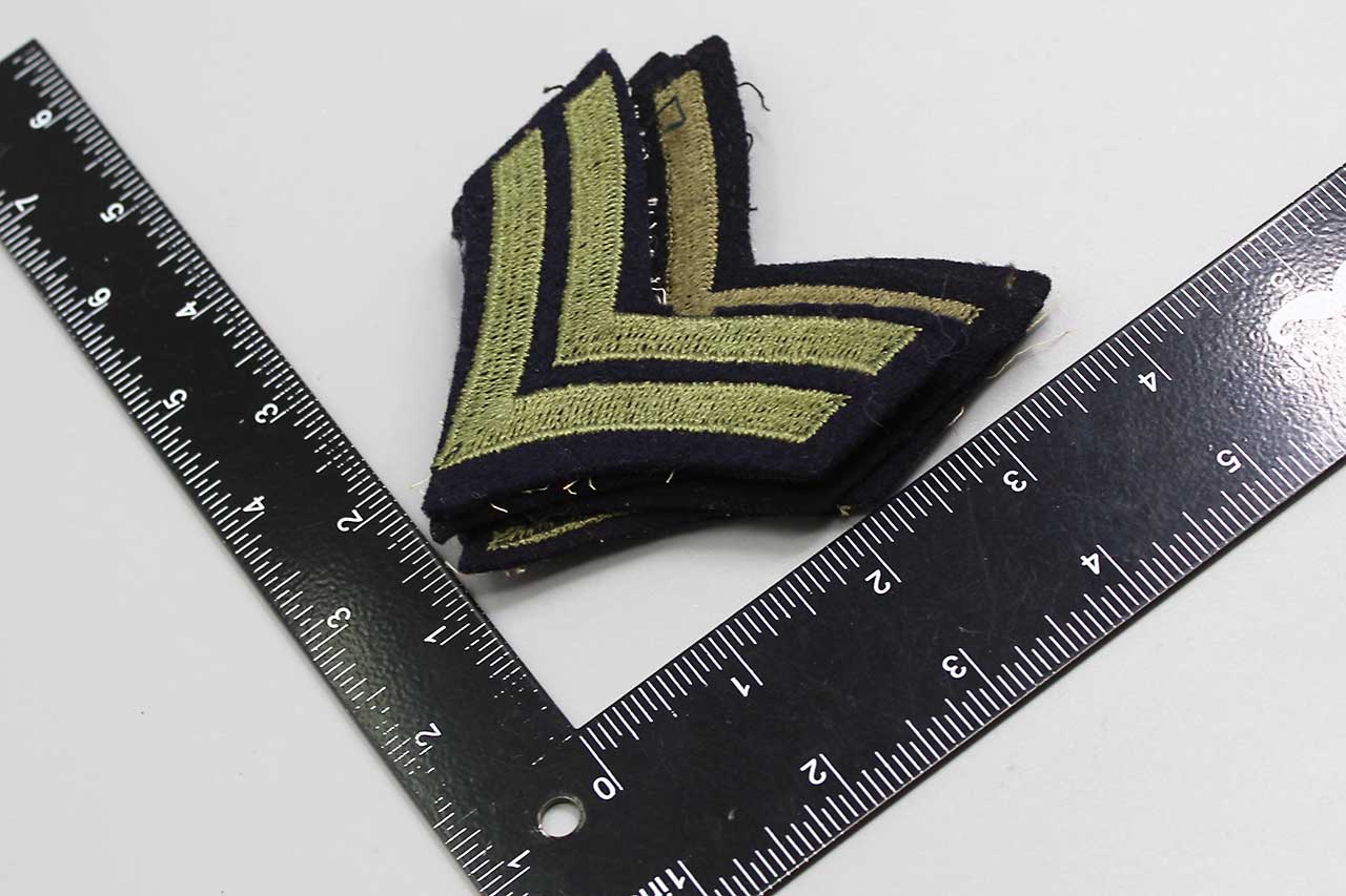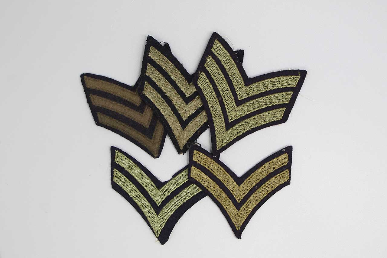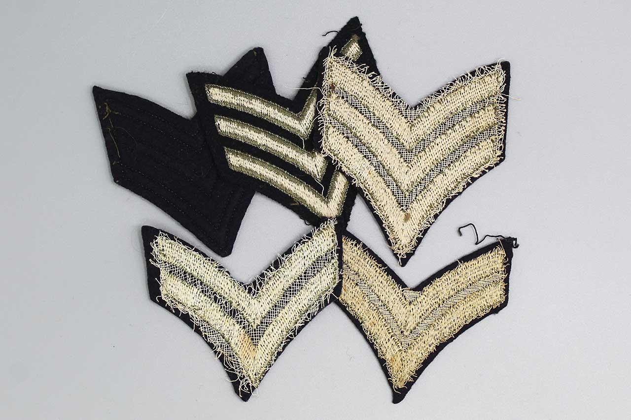 United States Army Group of Sleeve Rank Insignia (shoulder sleeve insignia or patch). Variety of US Army Enlisted ranks. Wool base material. 1940s (ww2) era. Worn condition.