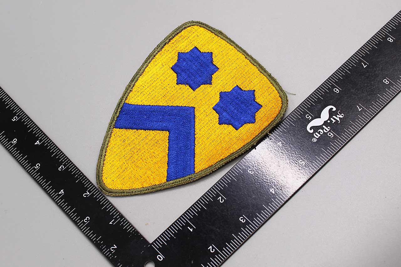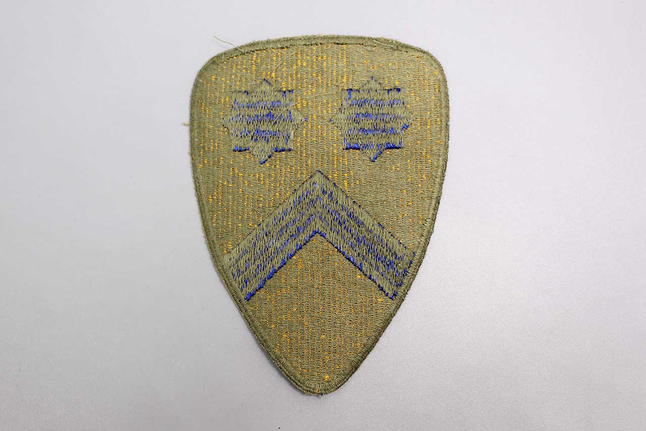 United States Army 2nd Cavalry Division shoulder sleeve insignia (patch). The patch is fully embroidered. Green back patch. Worn condition. Most likely 1940s (WW2) era. The patch does not react to UV light (does not glow under blacklight).