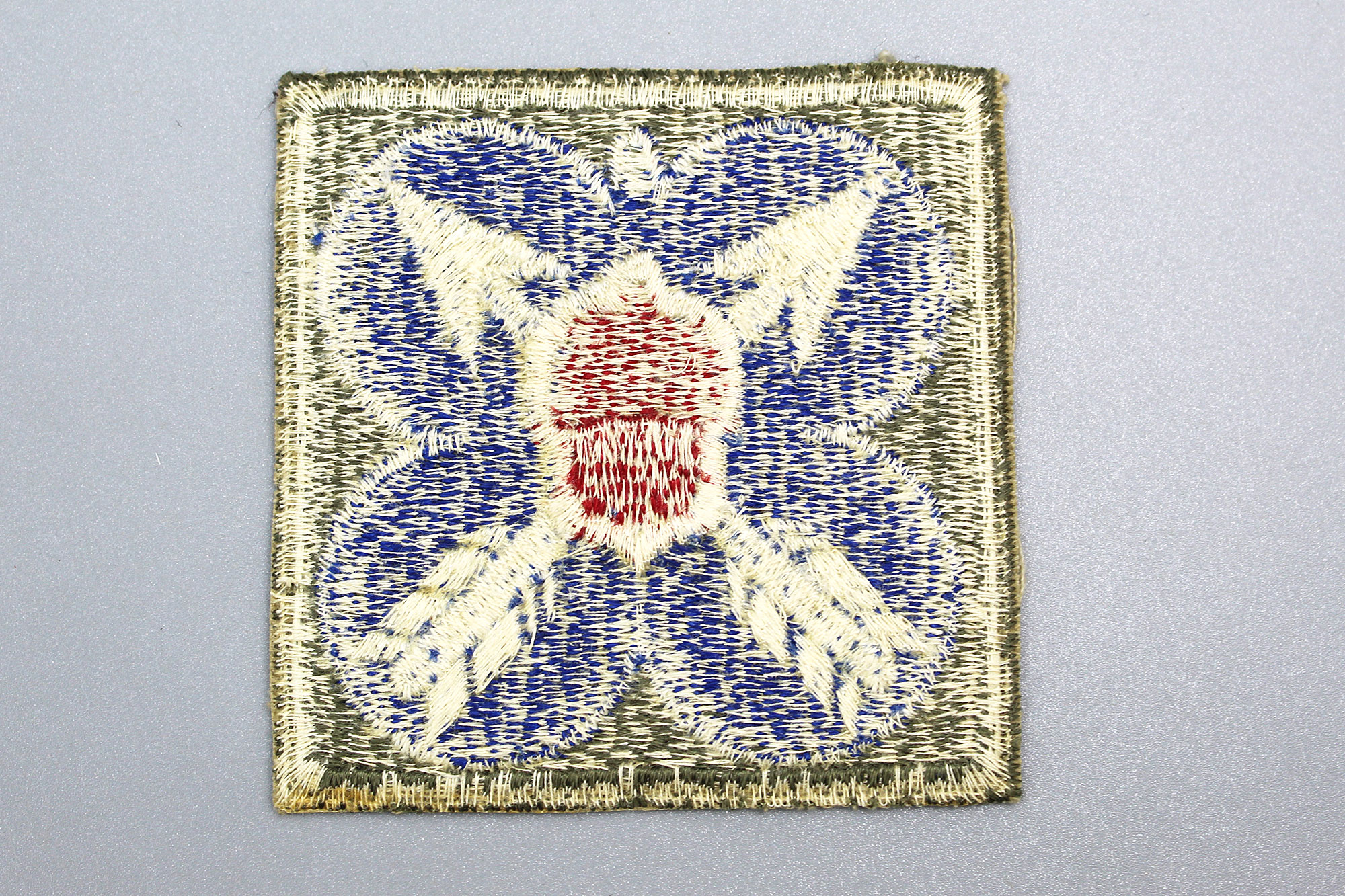 United States 21st (XXI) Army Corps shoulder sleeve insignia (patch). The patch is fully embroidered with a snowy back. Worn condition. Most likely 1940s (WW2) era. The patch does not react to UV light (does not glow under blacklight).