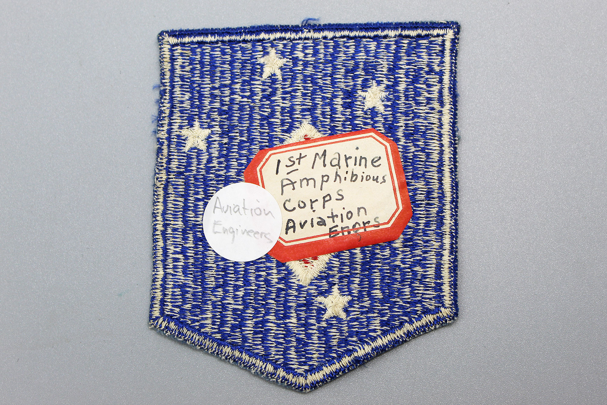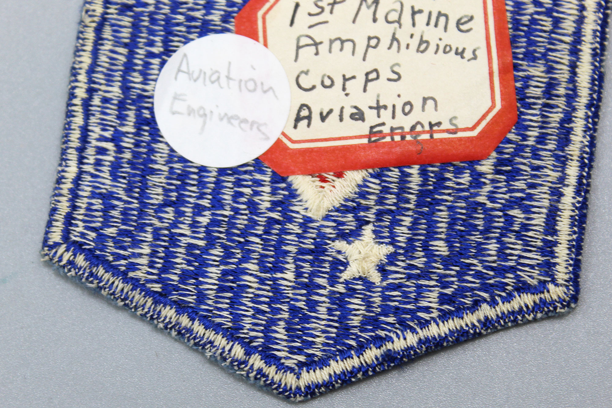 United States Marine Corps (USMC) WW2 1st Marine Amphibious Corps (M.A.C.) Aviation Engineers Battalion shoulder sleeve insignia (patch). The patch is fully embroidered with a medium snowy back. Worn condition. The patch does not react to UV light (does not glow under blacklight).