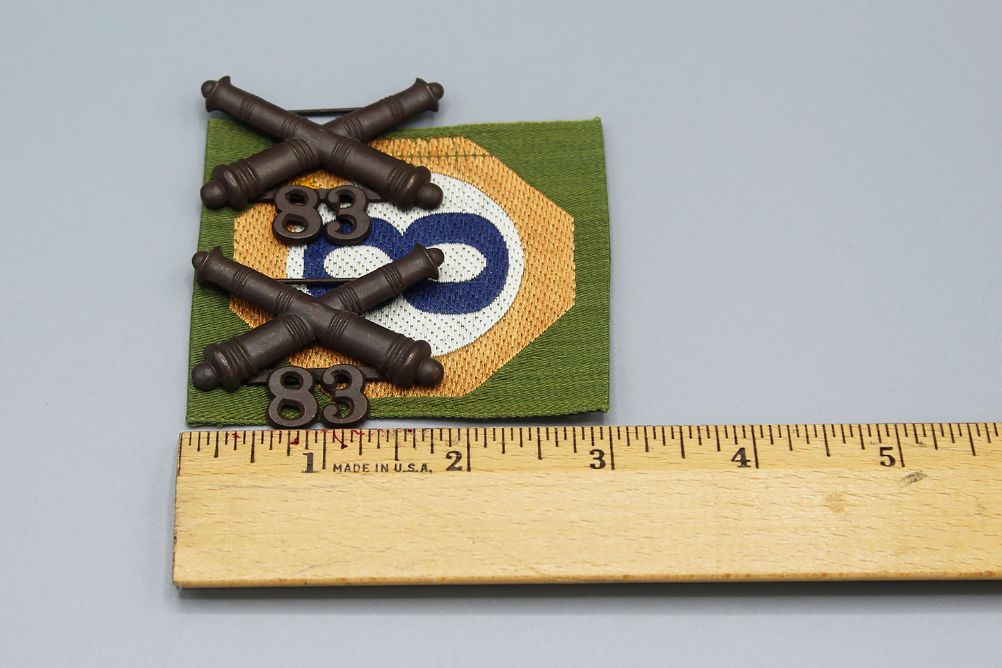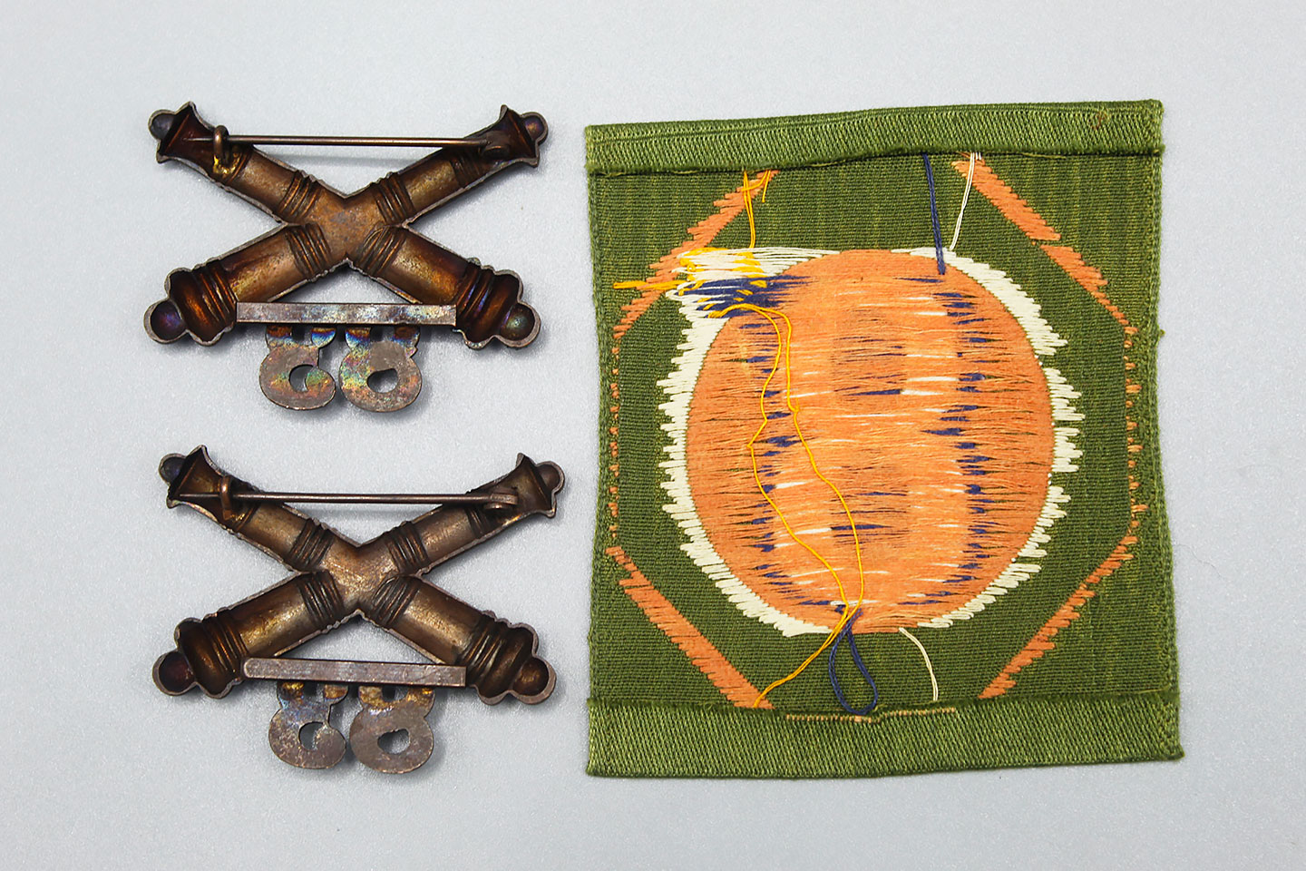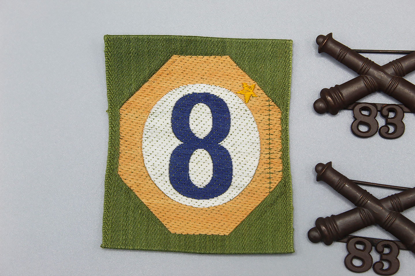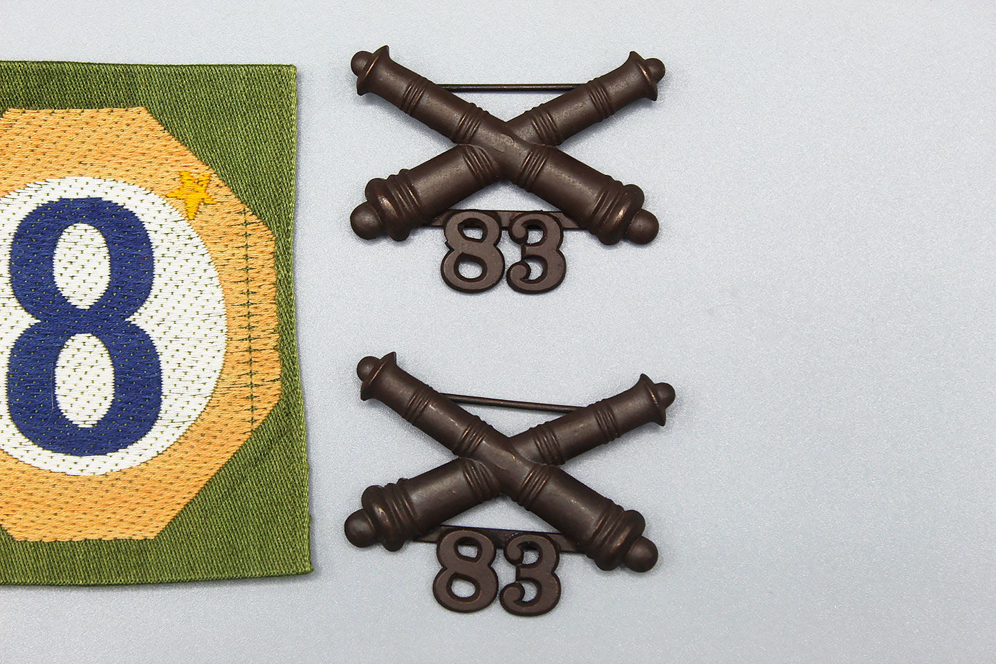 United States Pre-WW1 8th division patch and 83rd artillery collar insignia pair. Worn condition.