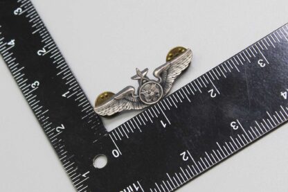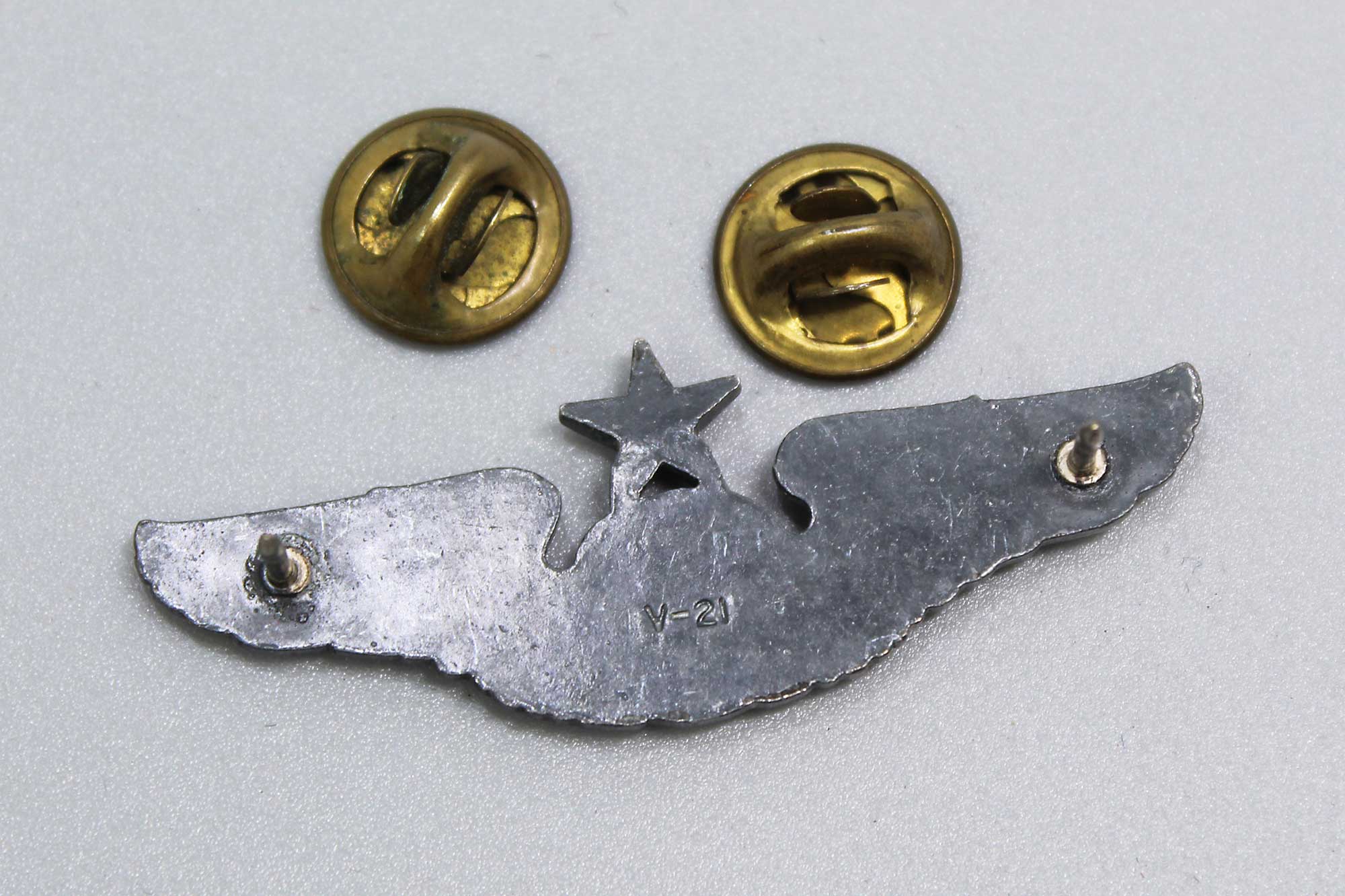 United States Air Force (USAF) Senior Air Crew Shirt Wings. Clutch back. 2-inch shirt sized uniform wings. Marker marked on back V-21. Single Letter, Double Digit Number codes such as V-21 (Vanguard) were made after 1965 until about 1978. Worn condition.