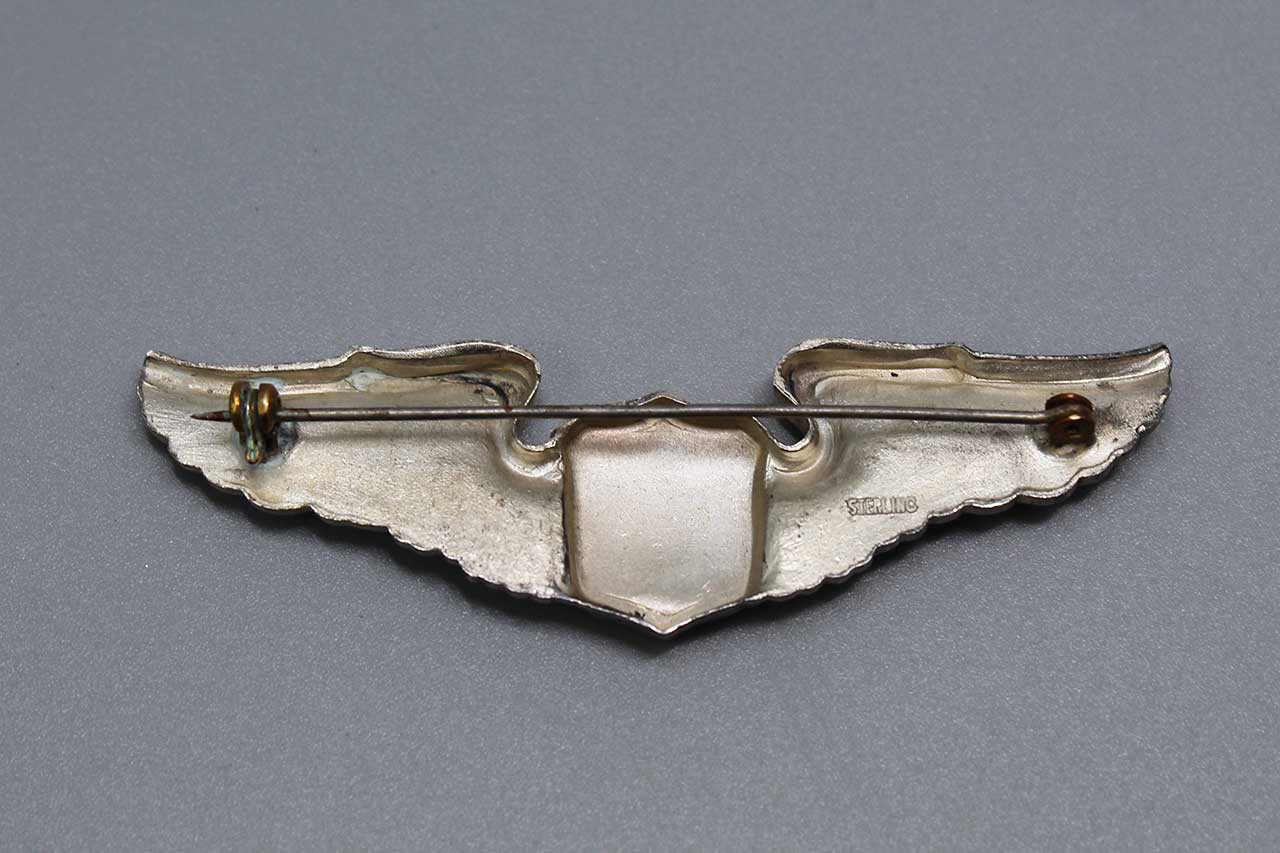 United States Army Air Force (AAF) Pilot Wings. Marked on back Sterling. Pin back. Size approximately 3 inches across (full sized wings). 1940s-1950s (ww2-Korea) era. Worn condition.
