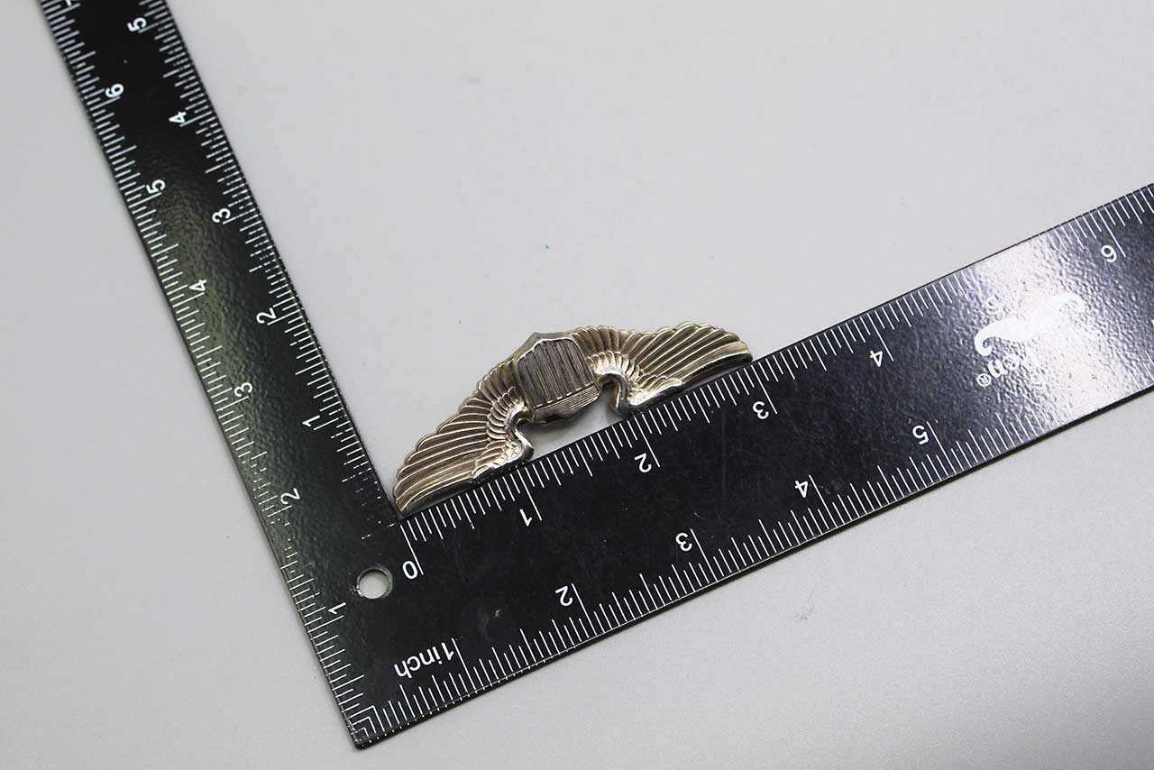 ADDITIONAL NOTES: U.S. Wings are most often found in 3 basic sizes. The 3-inch length wings are typically worn on Uniforms, Tunics, and Jackets and usually referenced as full-sized wings. The 2-inch wings were typically worn on shirts and the 1-inch wings were used on garrison or side caps. Also, the smaller-sized wings were sometimes used by GIs as gifts to girlfriends or wives as sweetheart-type items.