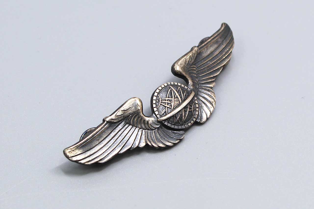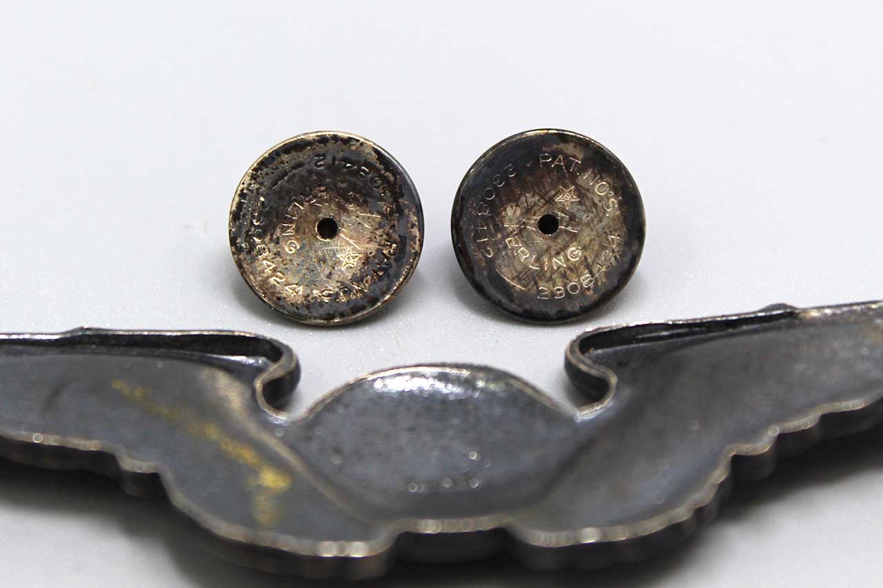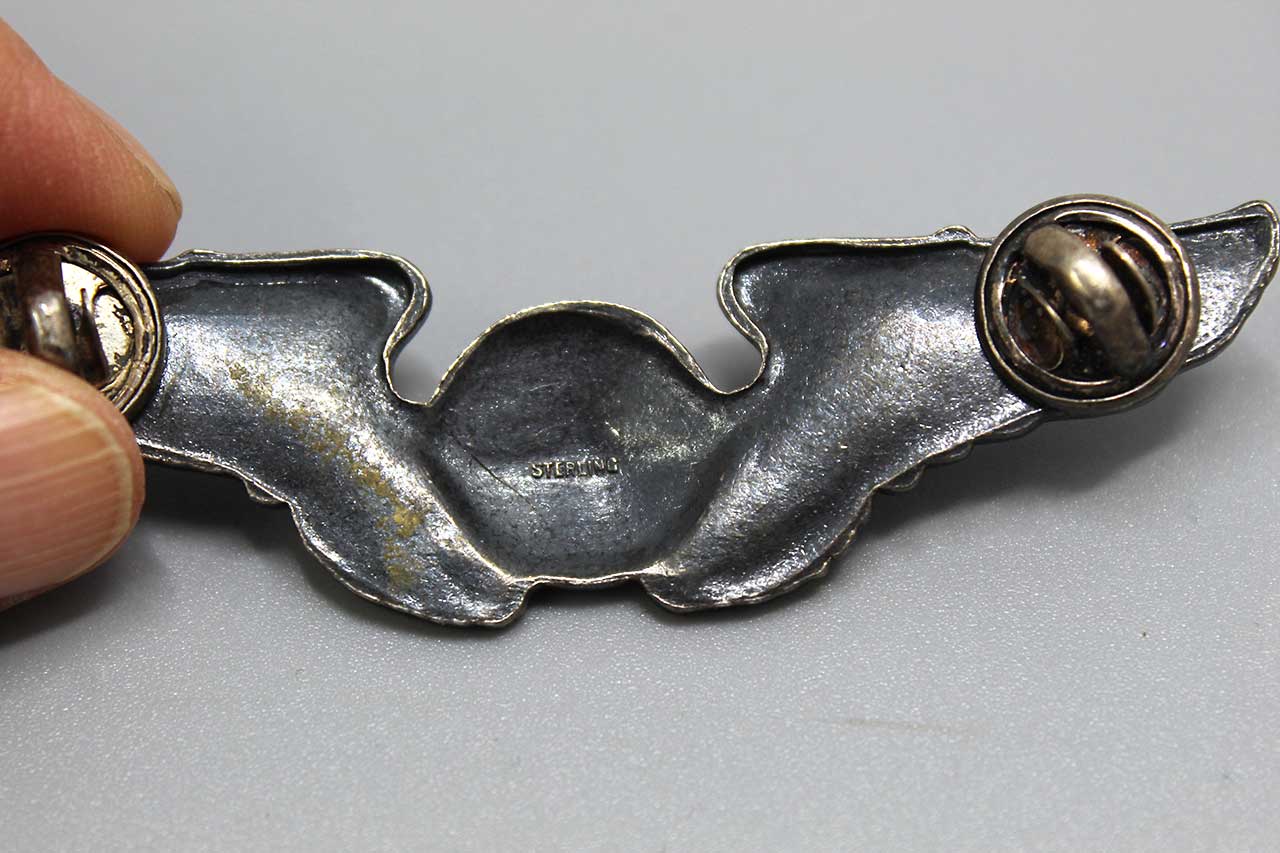 United States Army Air Force (USAAF) Navigator Wings. Clutch back with smooth face silver clutches. Full-size 3 inch wings. Marked Sterling on back. Most likely 1940s-1950s (ww2-Korea) era. Worn condition.