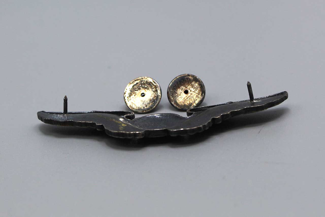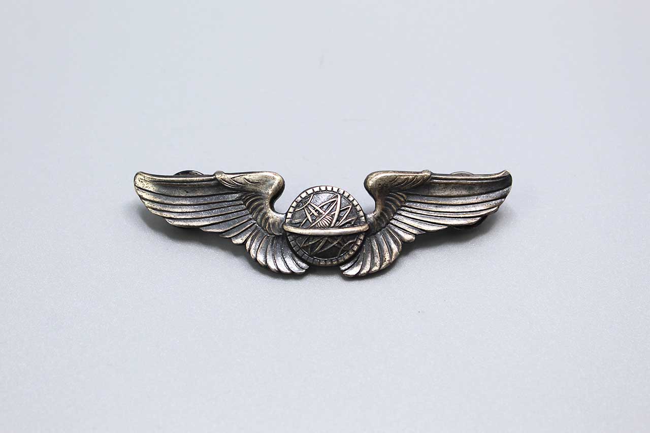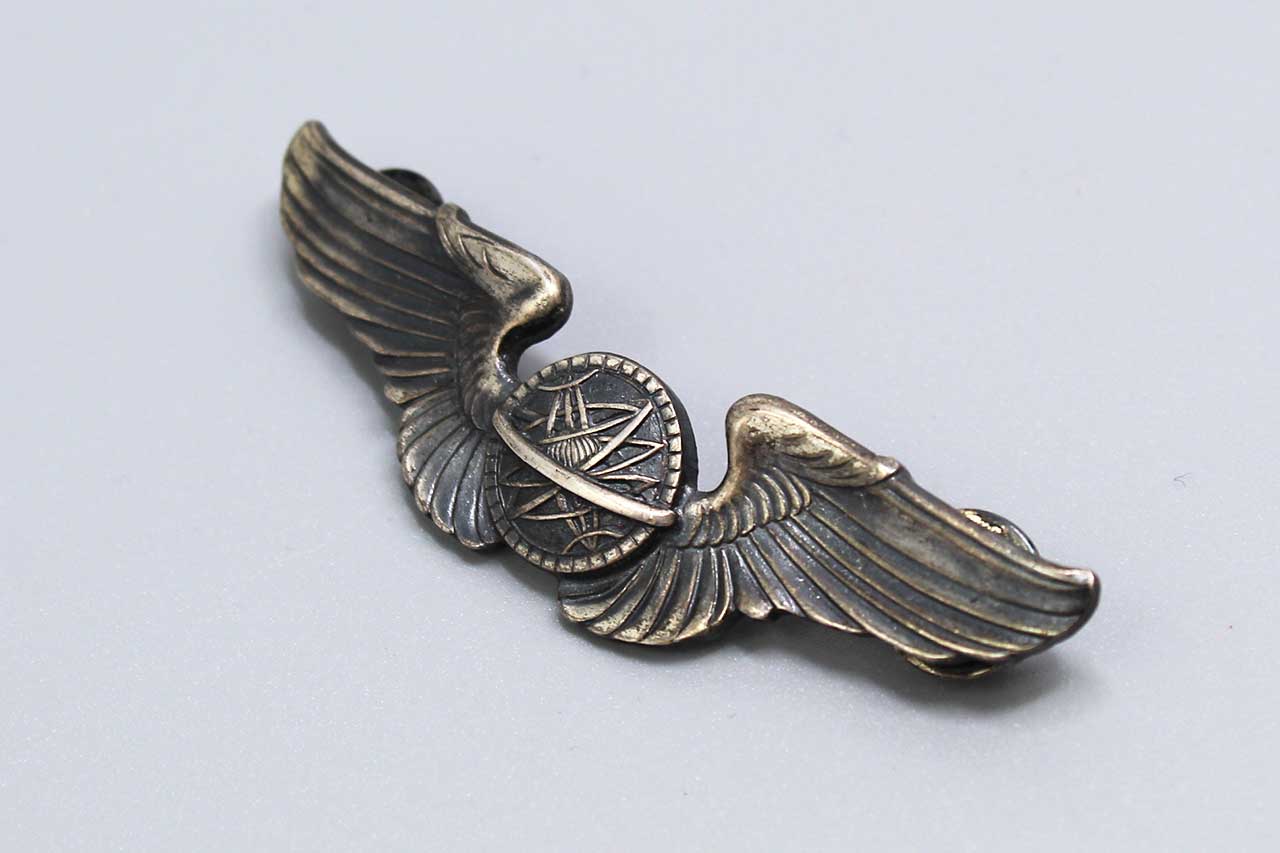 United States Army Air Force (USAAF) Navigator Wings. Clutch back with smooth face silver clutches. Full-size 3 inch wings. Marked Sterling on back. Most likely 1940s-1950s (ww2-Korea) era. Worn condition.