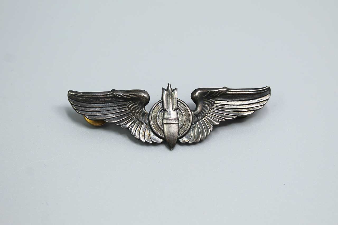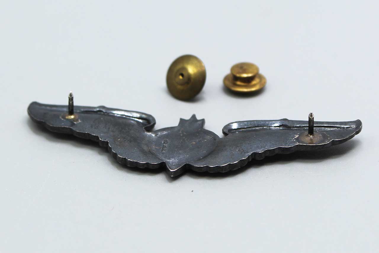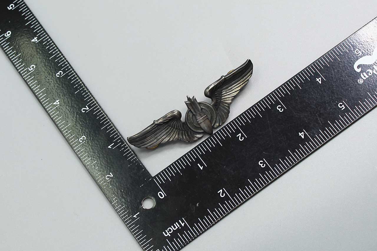 United States Army Air Force (AAF) Bombardier wings. Marked on back of wings Sterling. Full-sized 3-inch wings. Clutch back. 1940s-1950s (WW2-Korea) era. Worn condition.