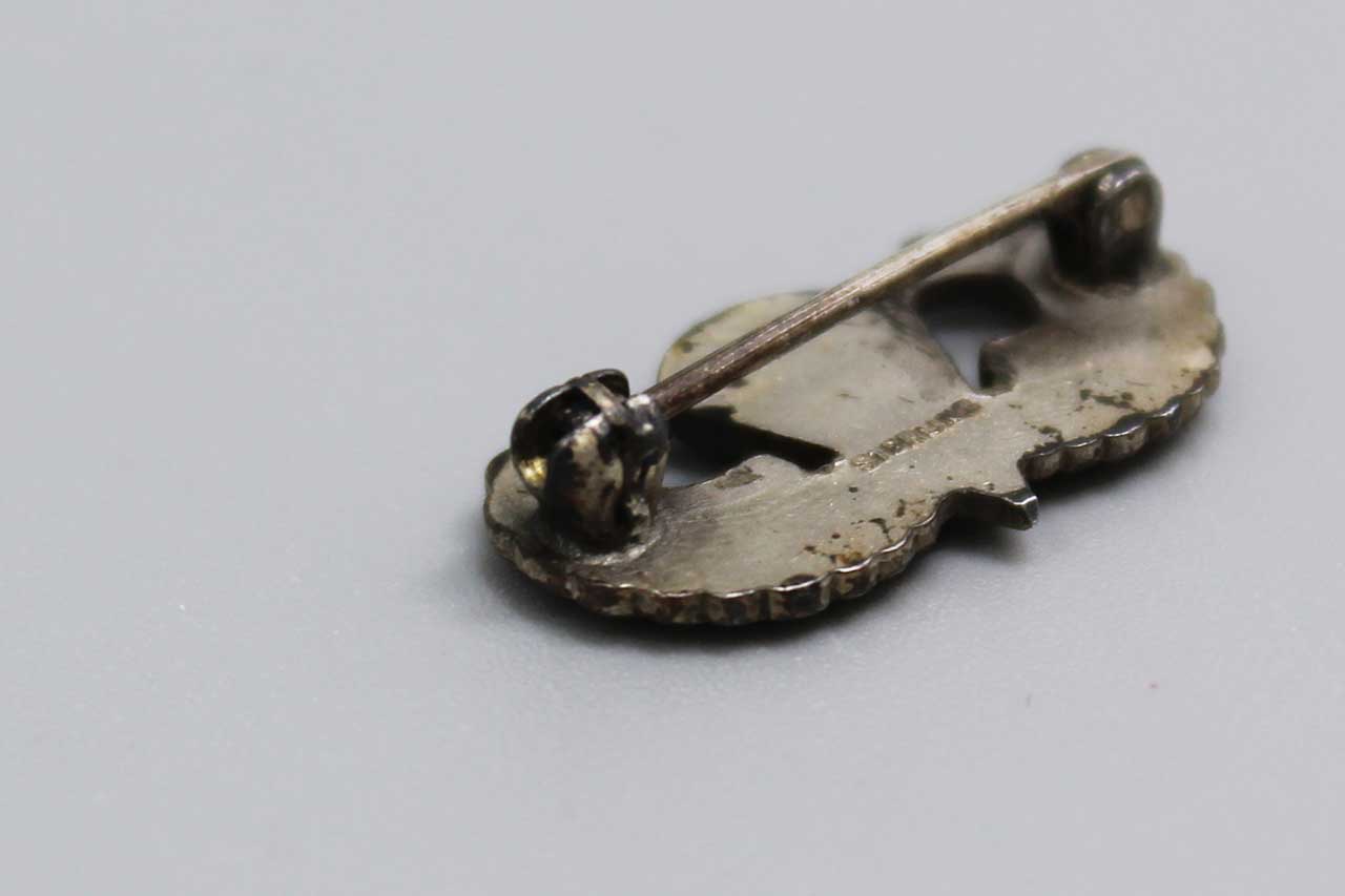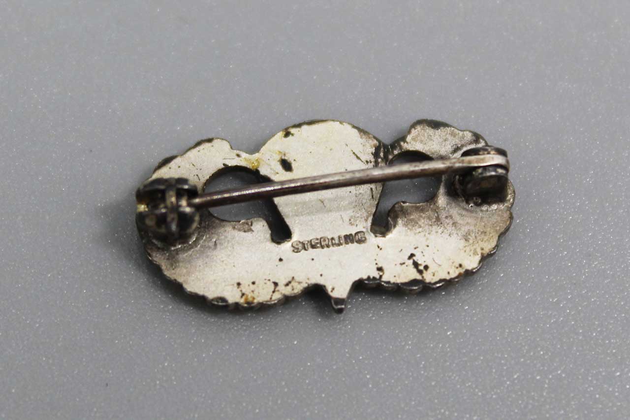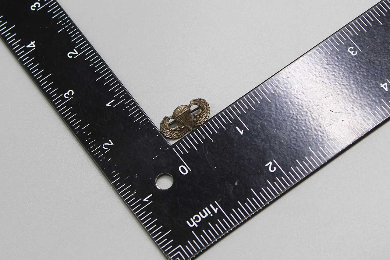 United States Very Small Army Parachutist Badge (Jump Wings). Marked on back Sterling. Pin back. Most likely 1940s (ww2) era. Very, very small size approximately only 3/4 inches across. Not sure what this would be for, may a sweetheart item or possible for garrison cap. Worn condition.