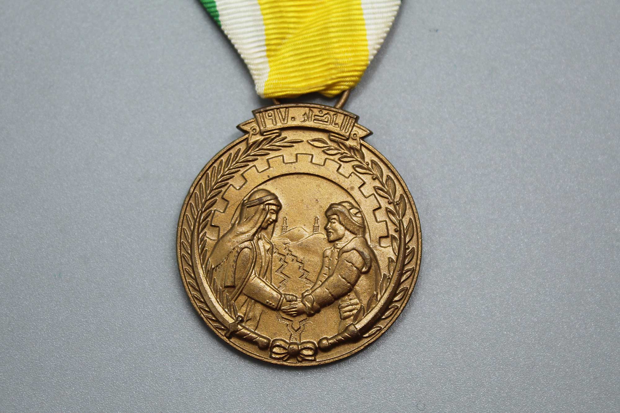 Republic of Iraq (Iraqi) medal for peace with Kurdistan. Yellow ribbon with green and white edges. This medal marked the end of conflict with Kurdistan, which began in 1965 with their demand for independence and ended in a settlement in March of 1970. Marker marked Swiss made on back. Worn condition.
