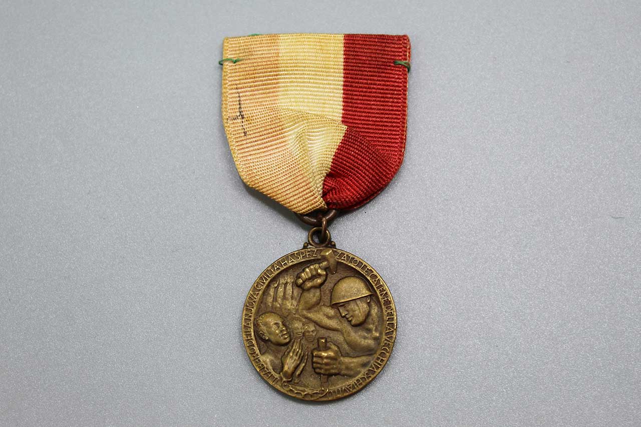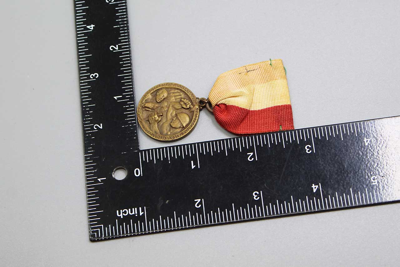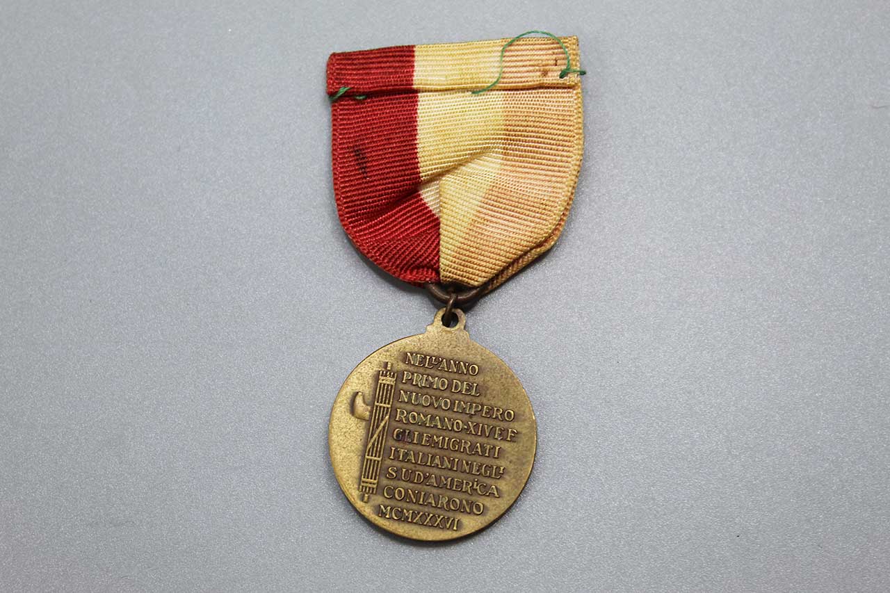 Italian Medal 1936. No pin on the ribbon. The medal is part of a large series of medals minted by the many associations of Italian emigrants settled abroad (in this case Italians settled in South America). The text on the medal I believe reads: the Italian workers in South America minted this medal in the first year of the new Italian Empire – 1936. Worn condition.