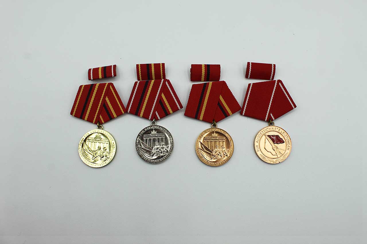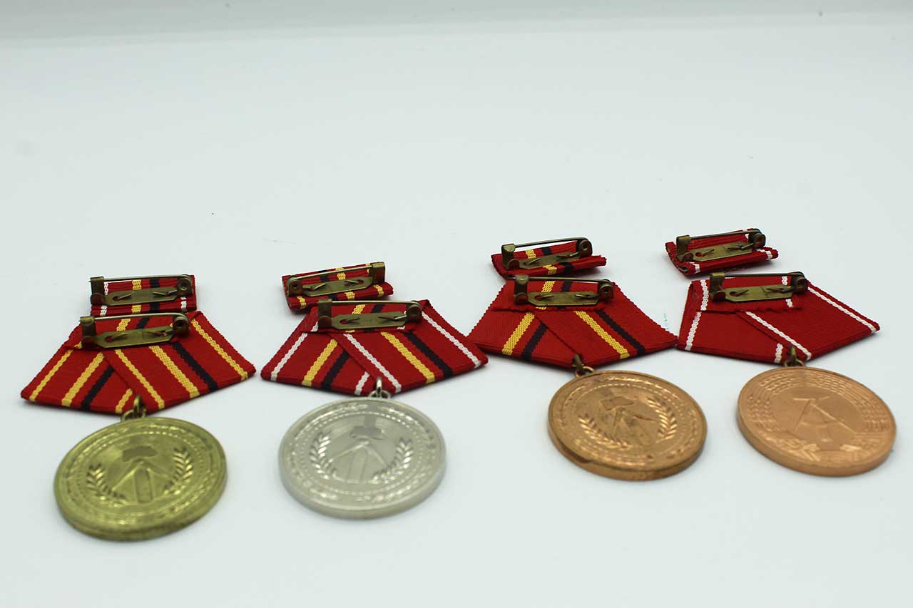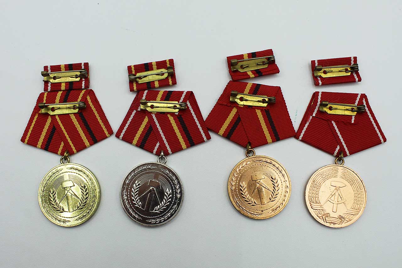 Group of four East German Medals with single ribbon bars. German Democratic Republic (GDR). The medals are suspended from a Soviet style pentagonal mount covered by ribbon with small pin on back. Worn condition.