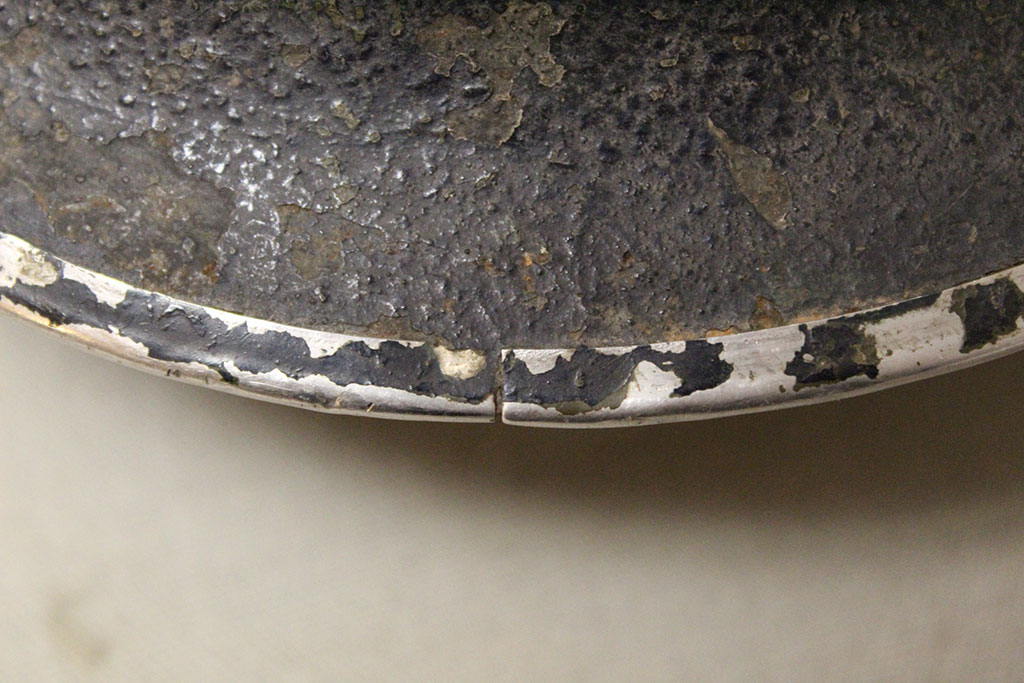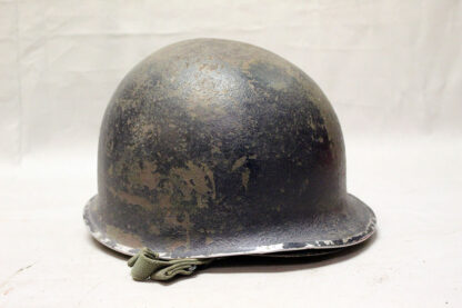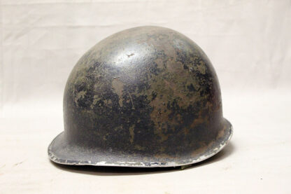 United States WW2 fixed bale blue M1 combat helmet. Blue painted helmet and liner as typically used by the Navy Seabees. Liner appears to be post ww2. Front seam, fixed bale helmet. Very worn condition.