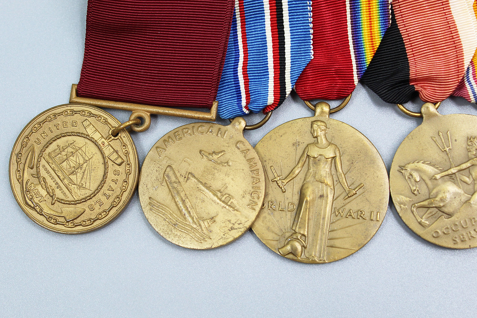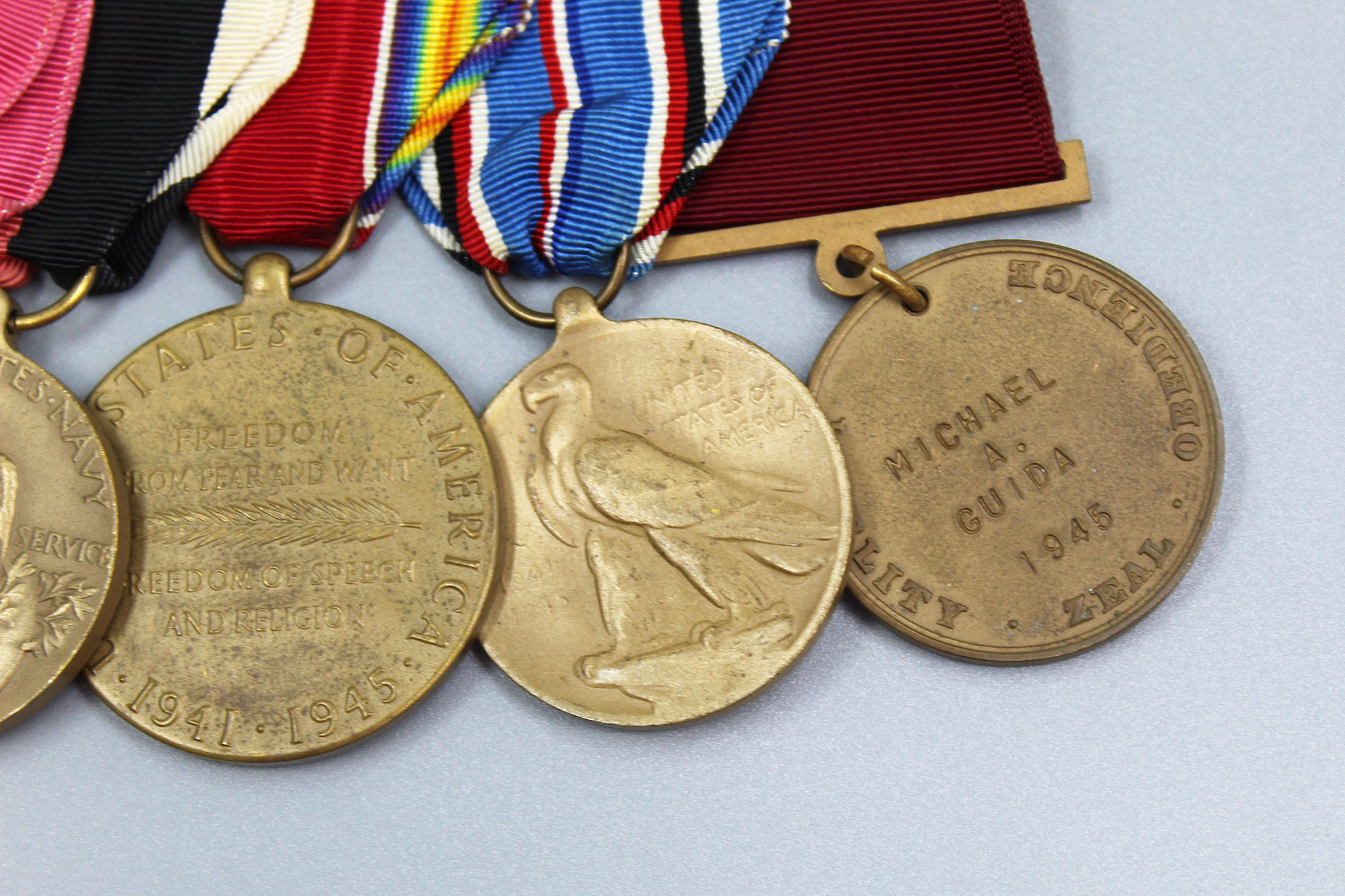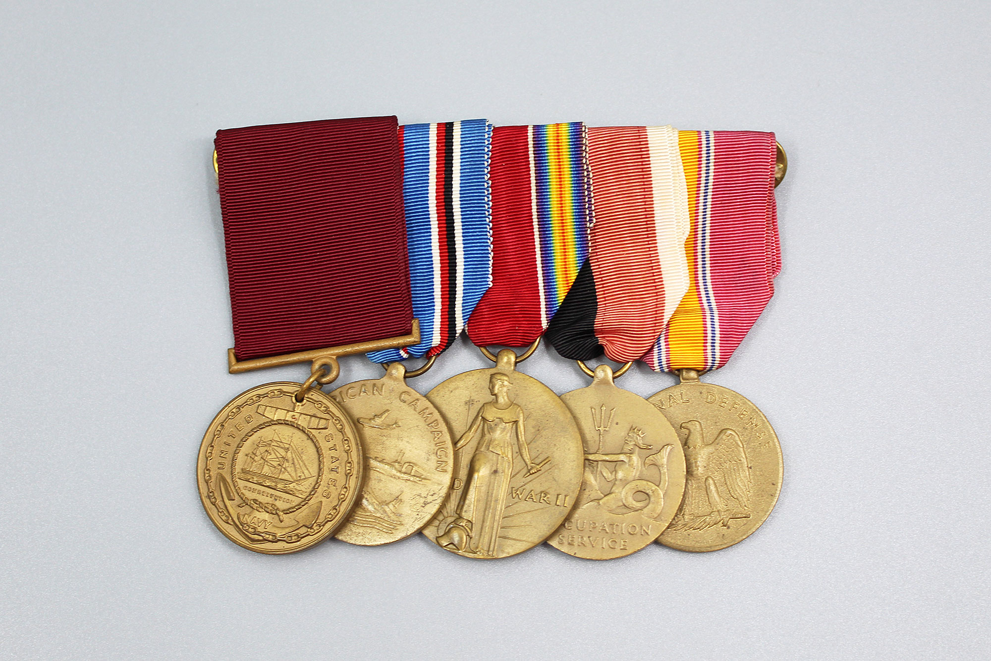U.S. WW2 Navy 5 Place Medal Bar. Named on back of Navy Good Conduct Medal to: Michael A. Guida 1945. Clutch back. The medals include: Navy Good Conduct medal, American Campaign medal, US WW2 Victory medal, Navy Occupation Service medal, and National Defense Service medal. Appears to range from 1940s-1950s (WW2, Korea) era. Worn and used condition.