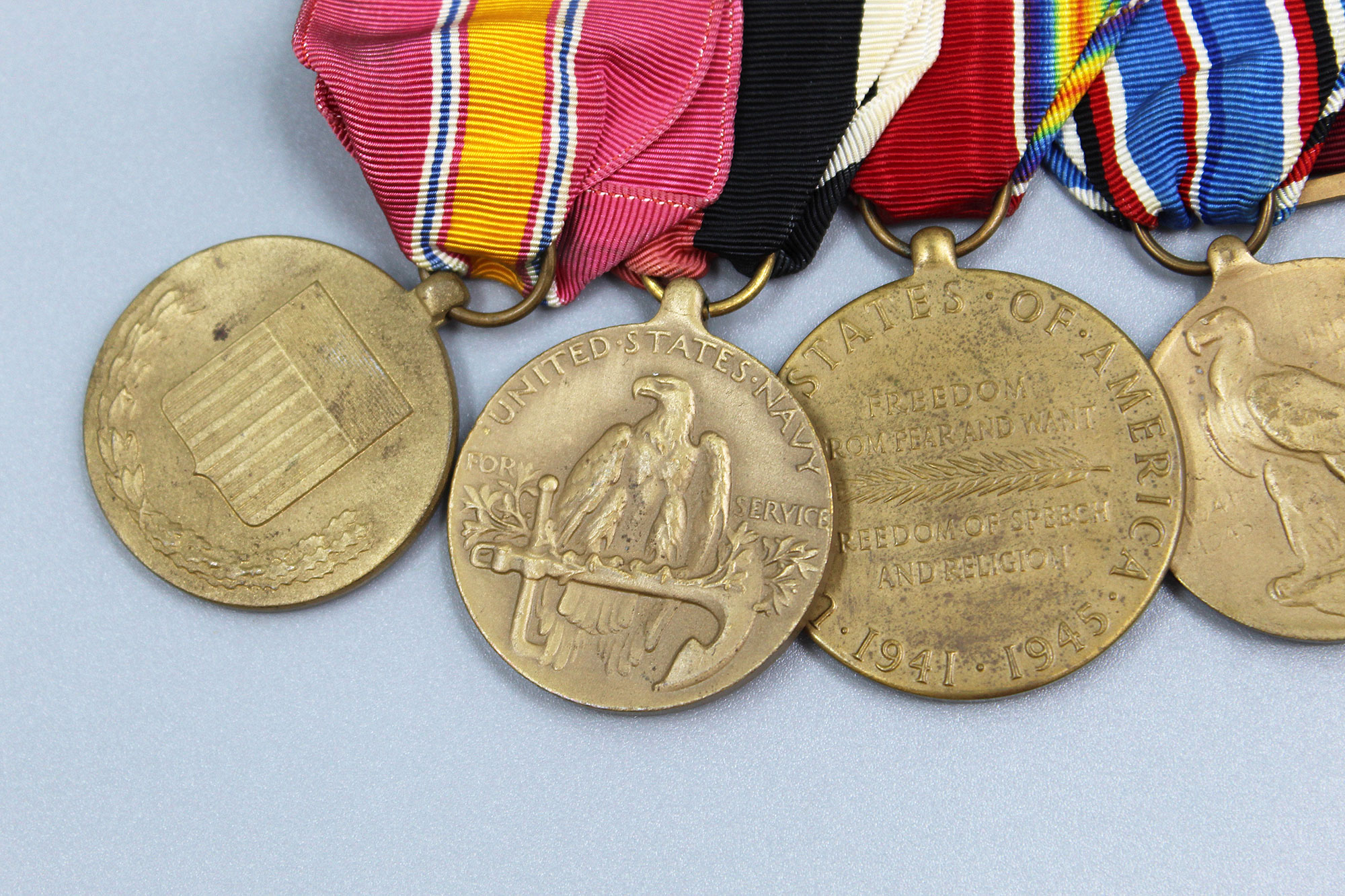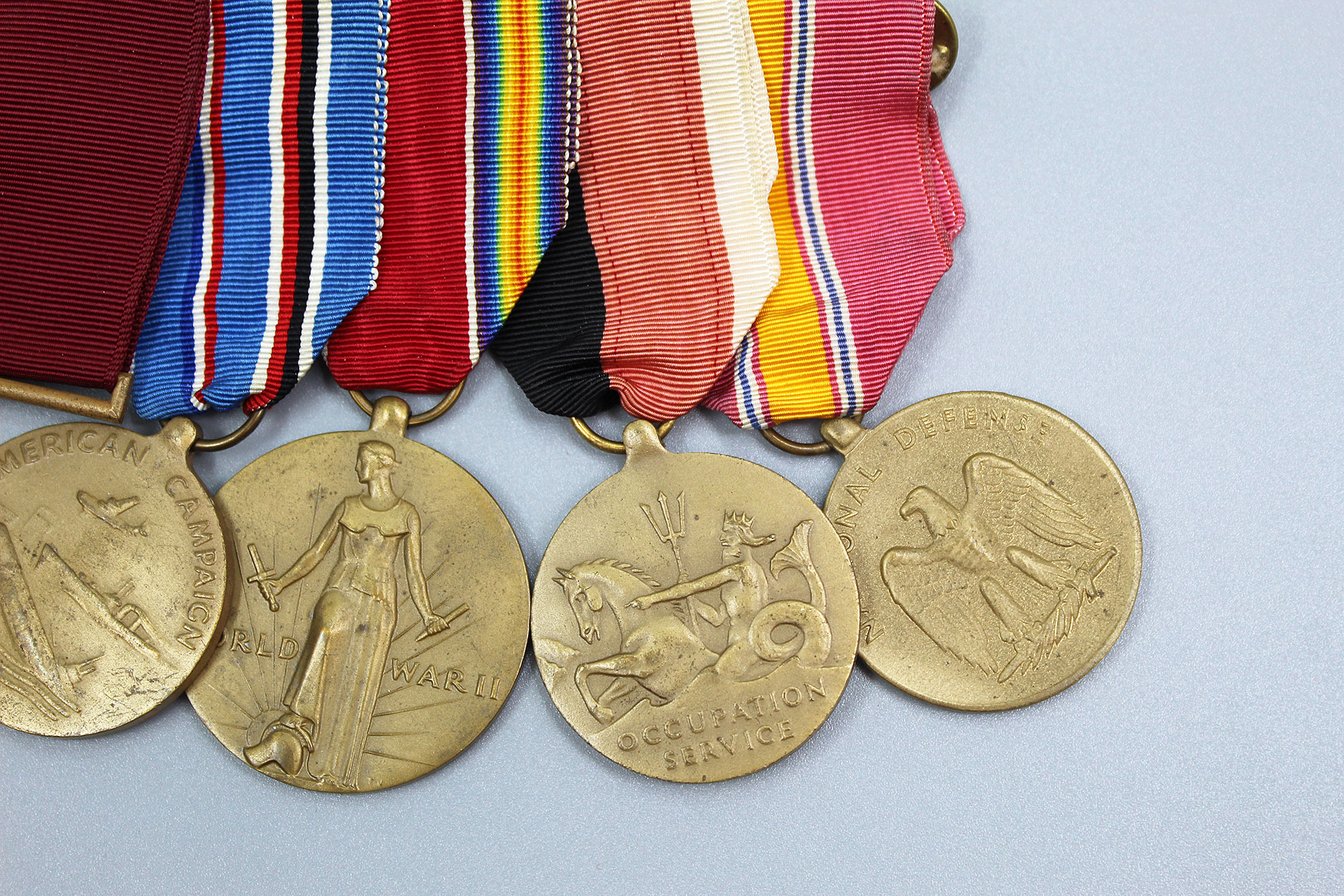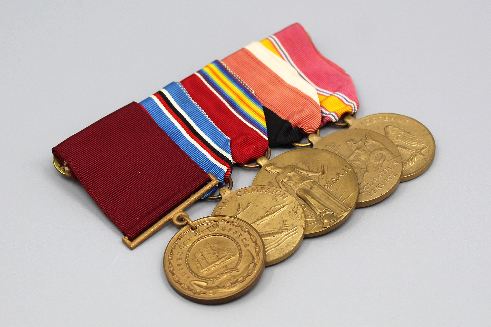 U.S. WW2 Navy 5 Place Medal Bar. Named on back of Navy Good Conduct Medal to: Michael A. Guida 1945. Clutch back. The medals include: Navy Good Conduct medal, American Campaign medal, US WW2 Victory medal, Navy Occupation Service medal, and National Defense Service medal. Appears to range from 1940s-1950s (WW2, Korea) era. Worn and used condition.