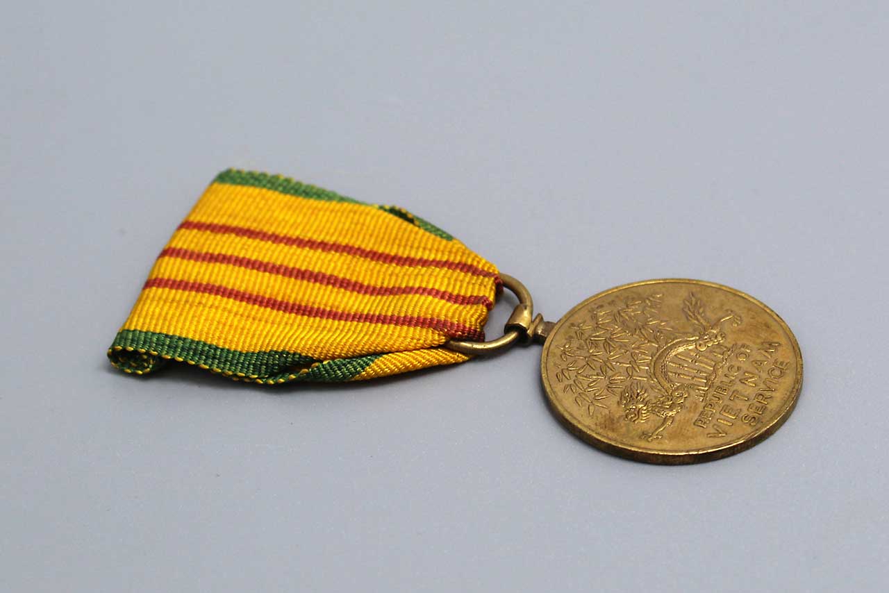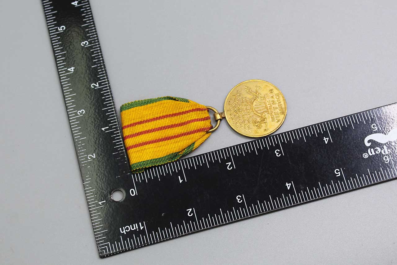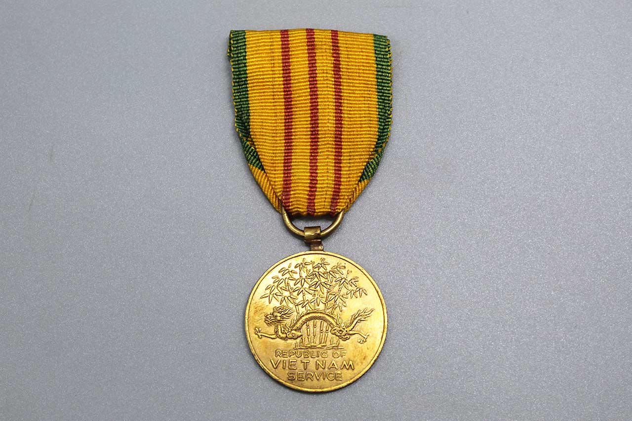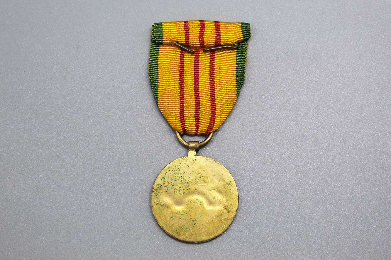 United States Vietnam Service Medal. This is the In-Country made version with the Vietnam made ribbon type and crude Vietnam made version of the service medal. Worn condition.